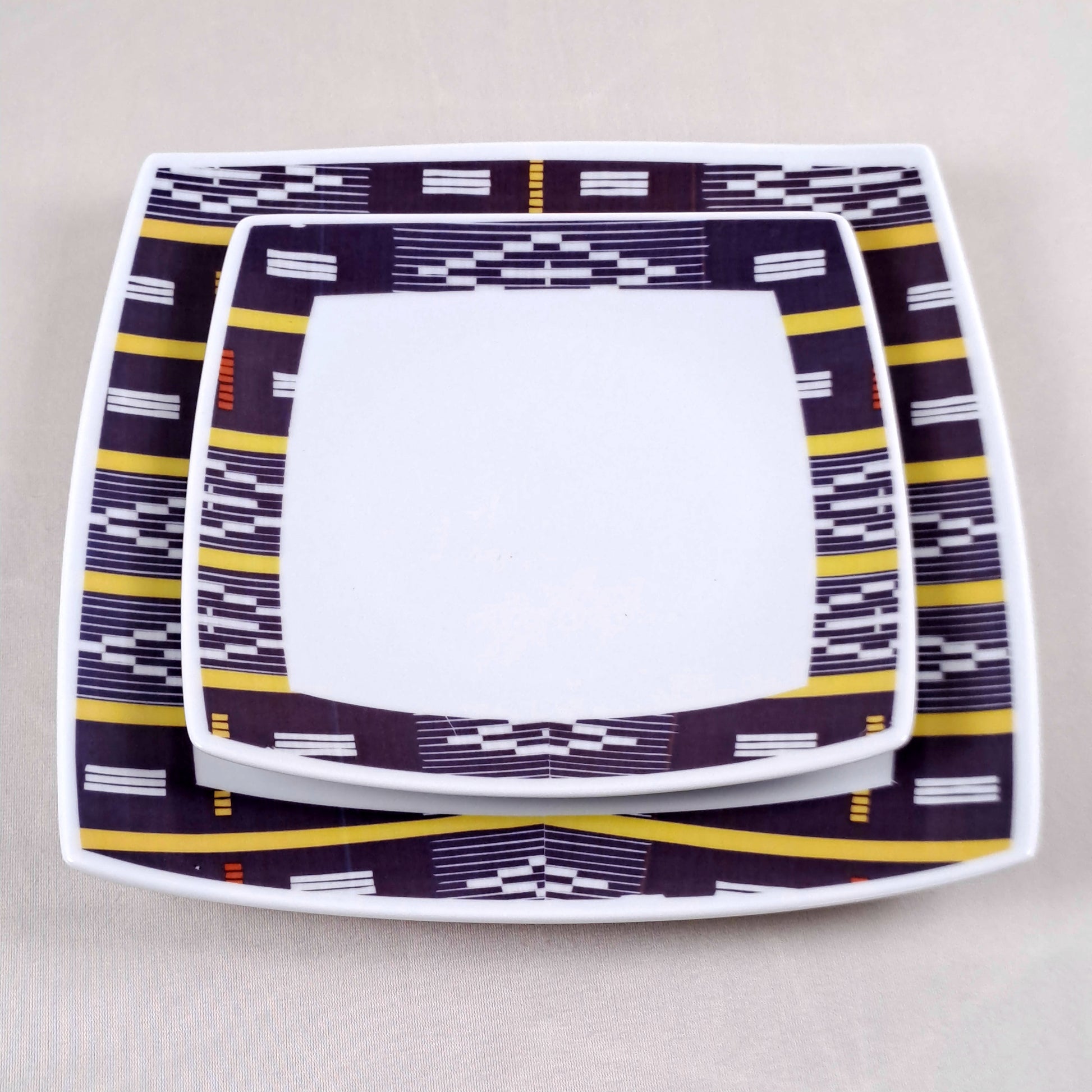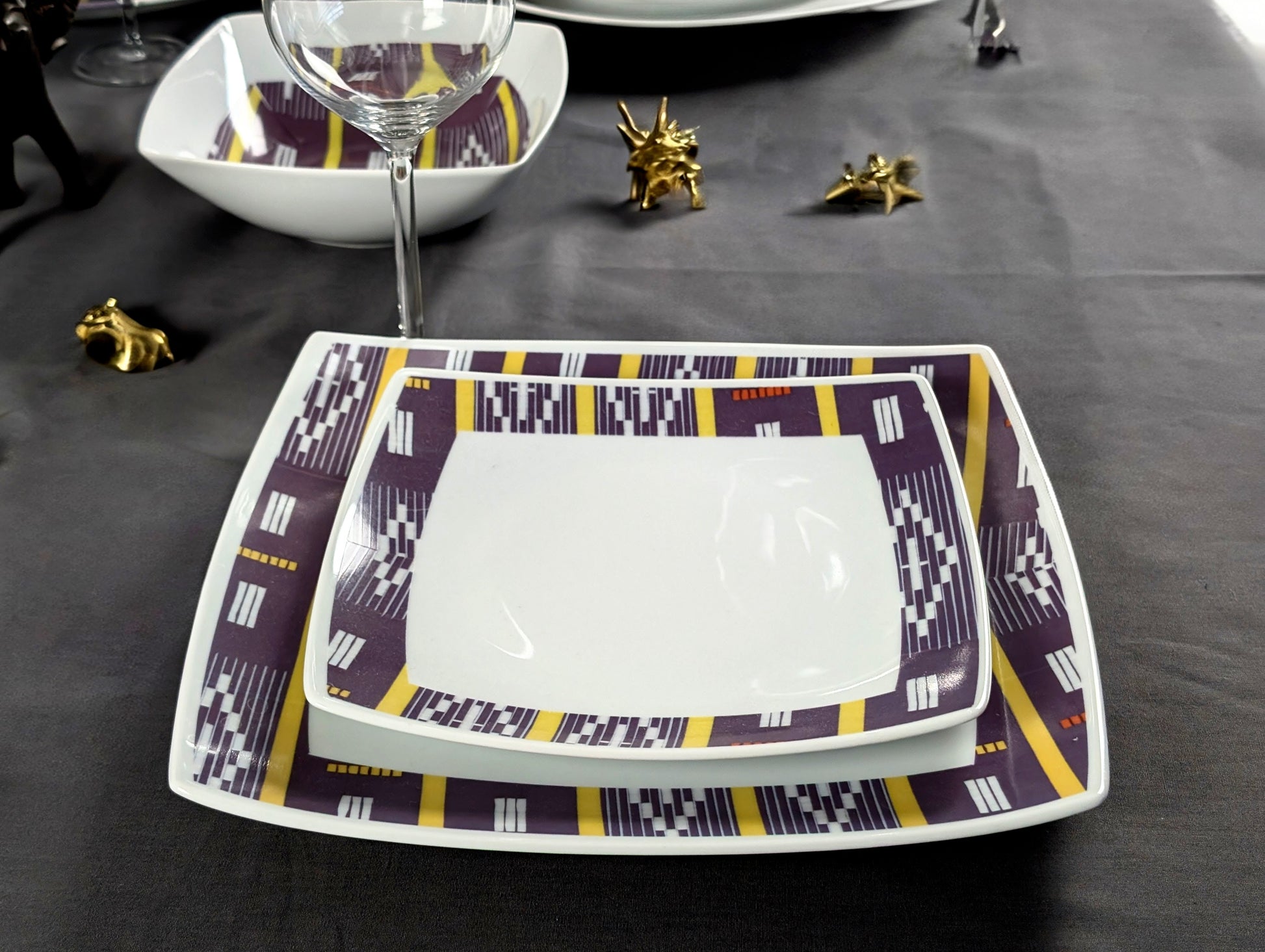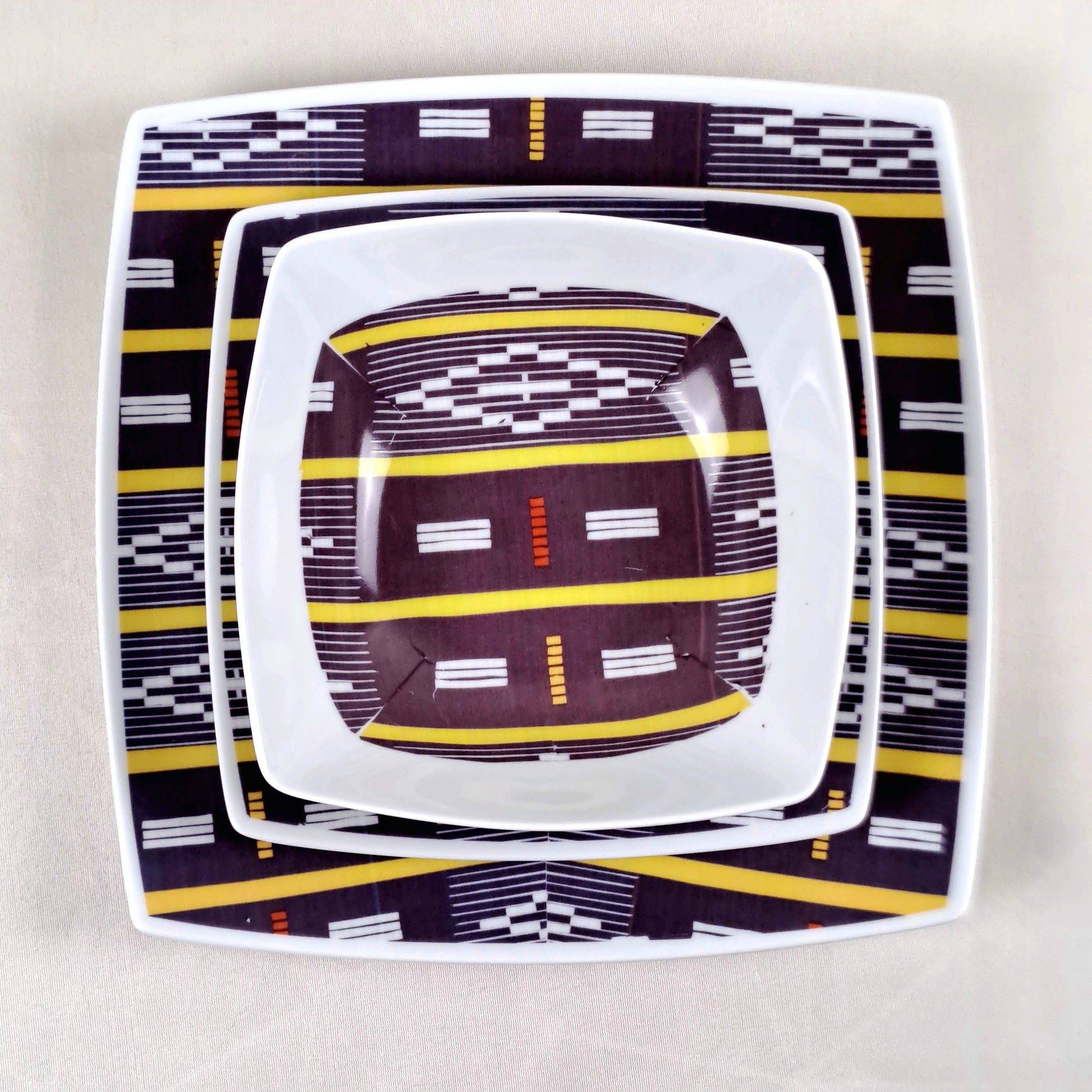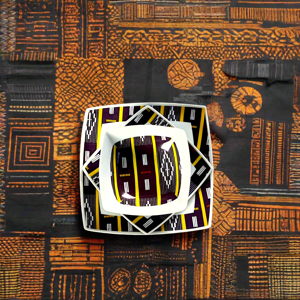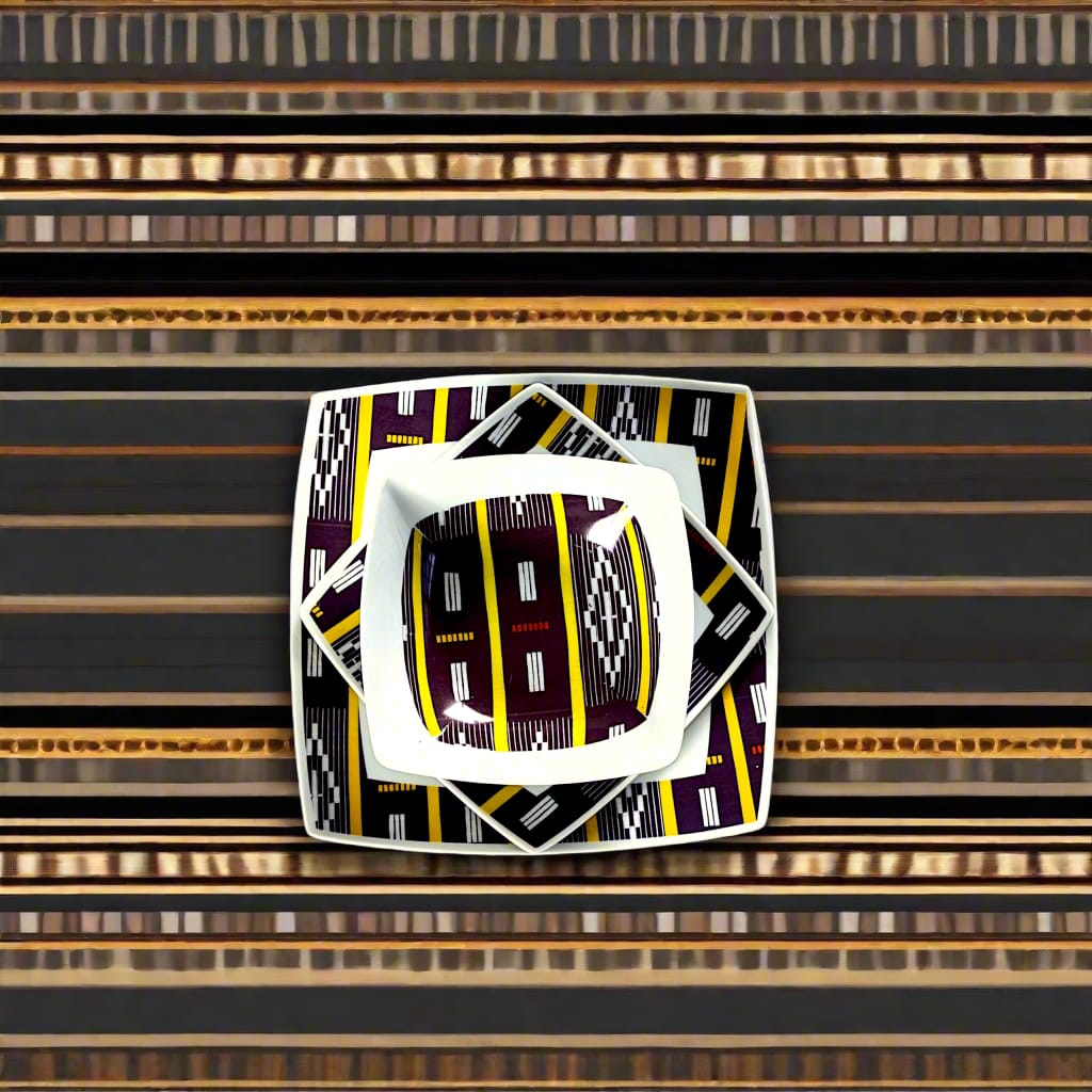 Entdecken Sie dieses Set quadratischer Teller mit einem Streifenmuster „Baoulé de Côte d'Ivoire“ . das sich durch sein raffiniertes und einzigartiges Design auszeichnet. Diese Komposition ist wie folgt organisiert: