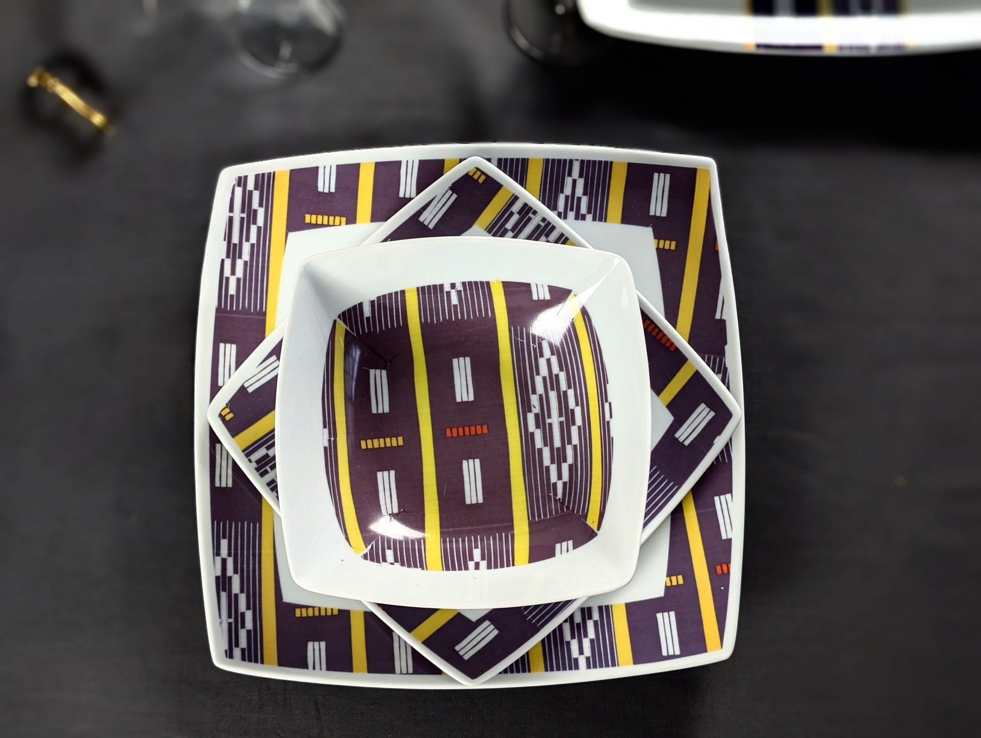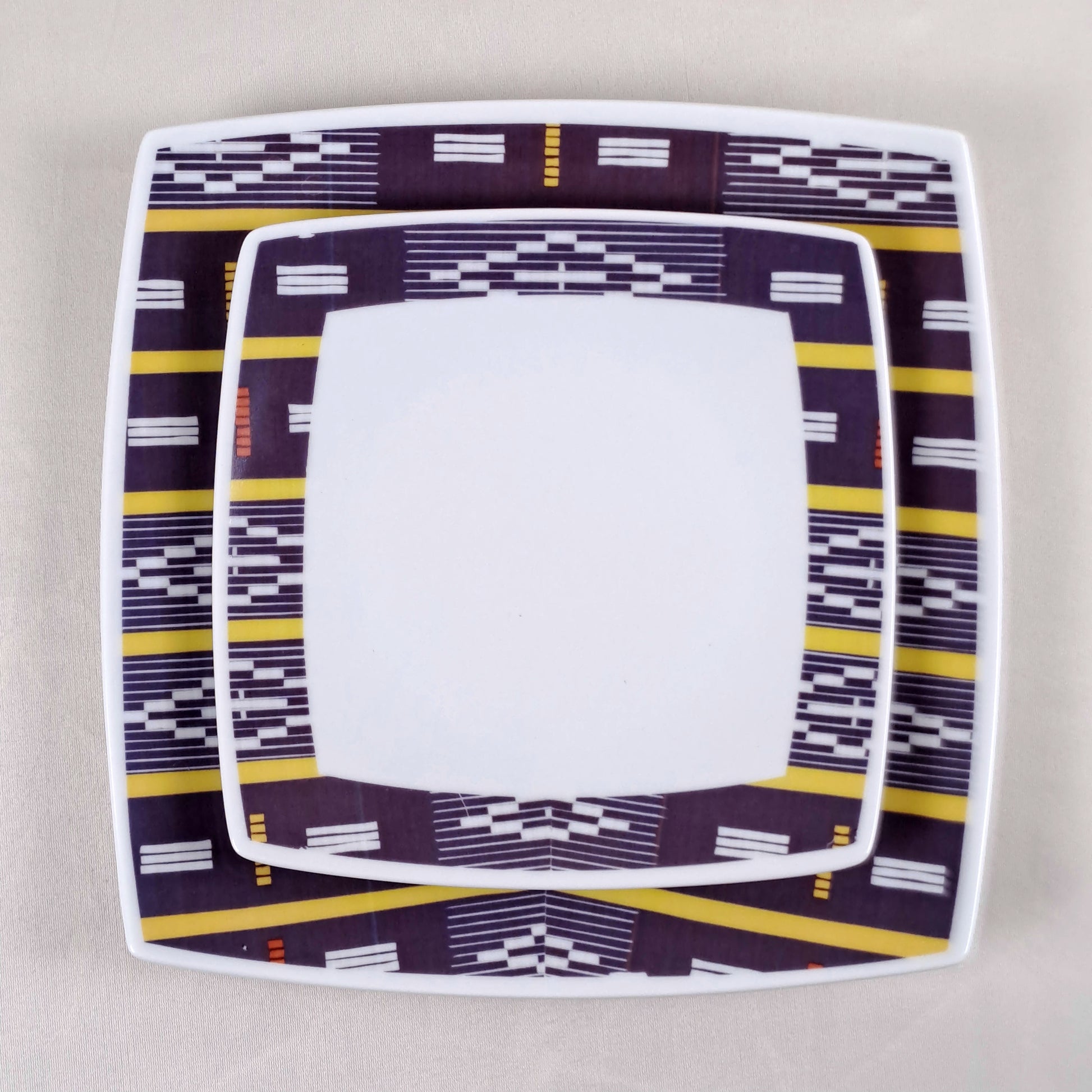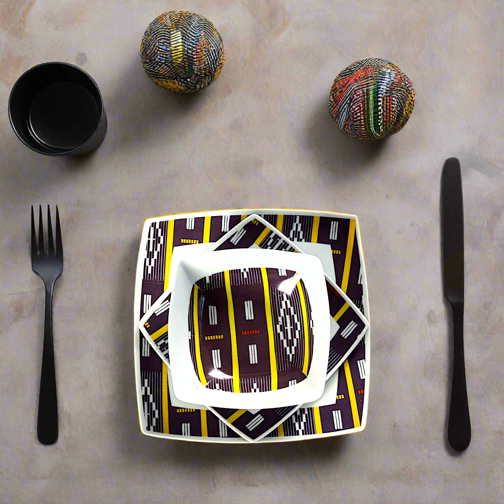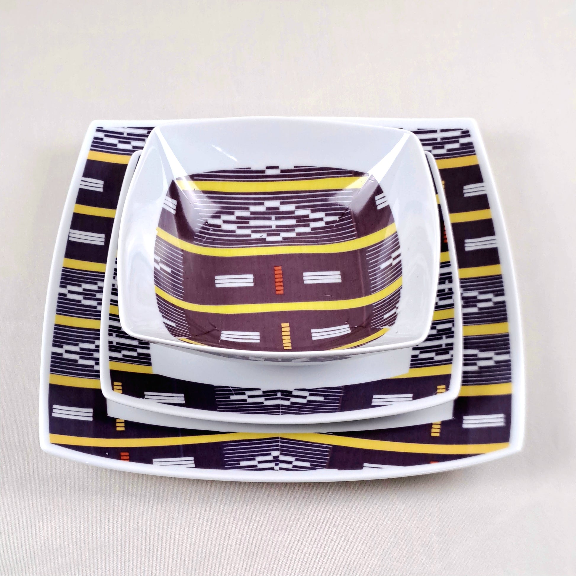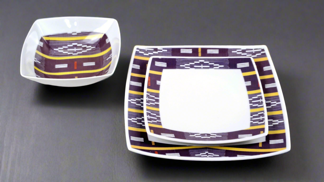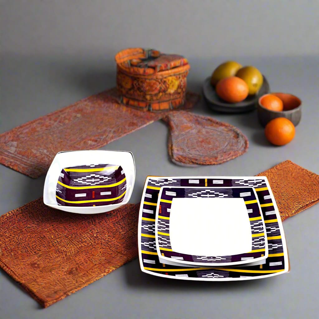Entdecken Sie dieses Set quadratischer Teller mit einem Streifenmuster „Baoulé de Côte d'Ivoire“ . das sich durch sein raffiniertes und einzigartiges Design auszeichnet. Diese Komposition ist wie folgt organisiert: