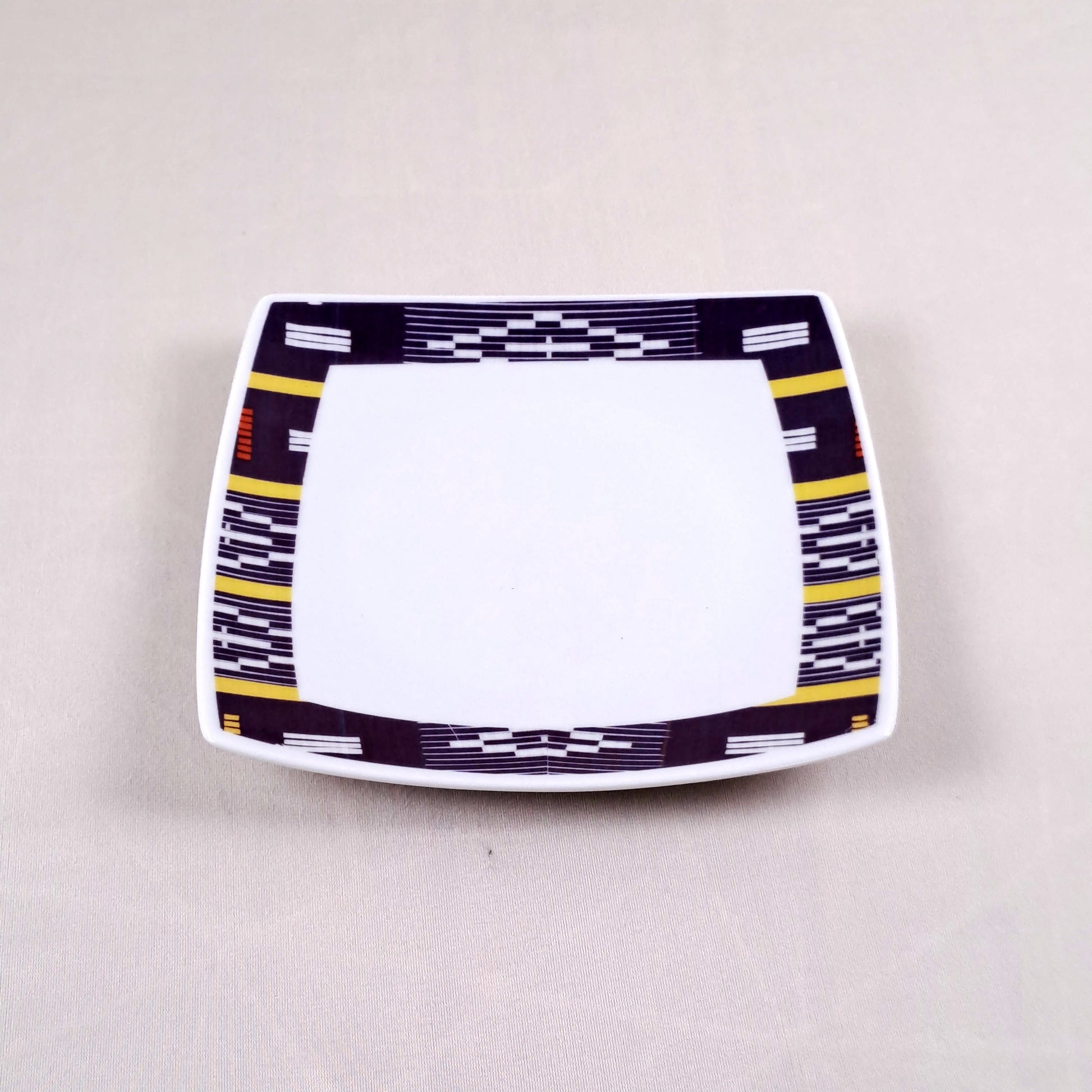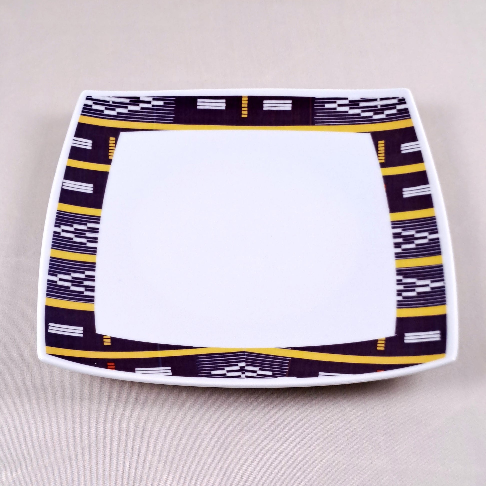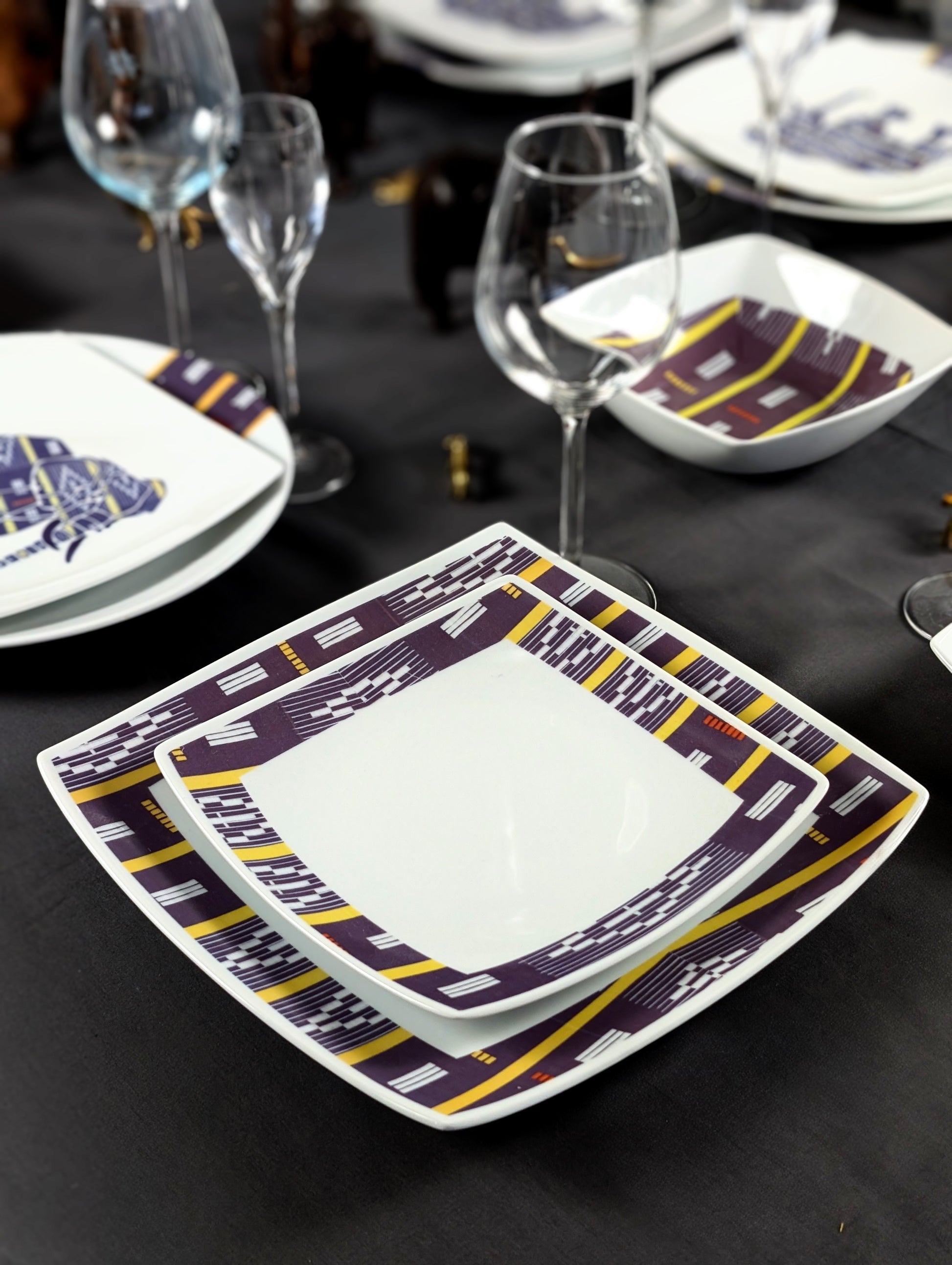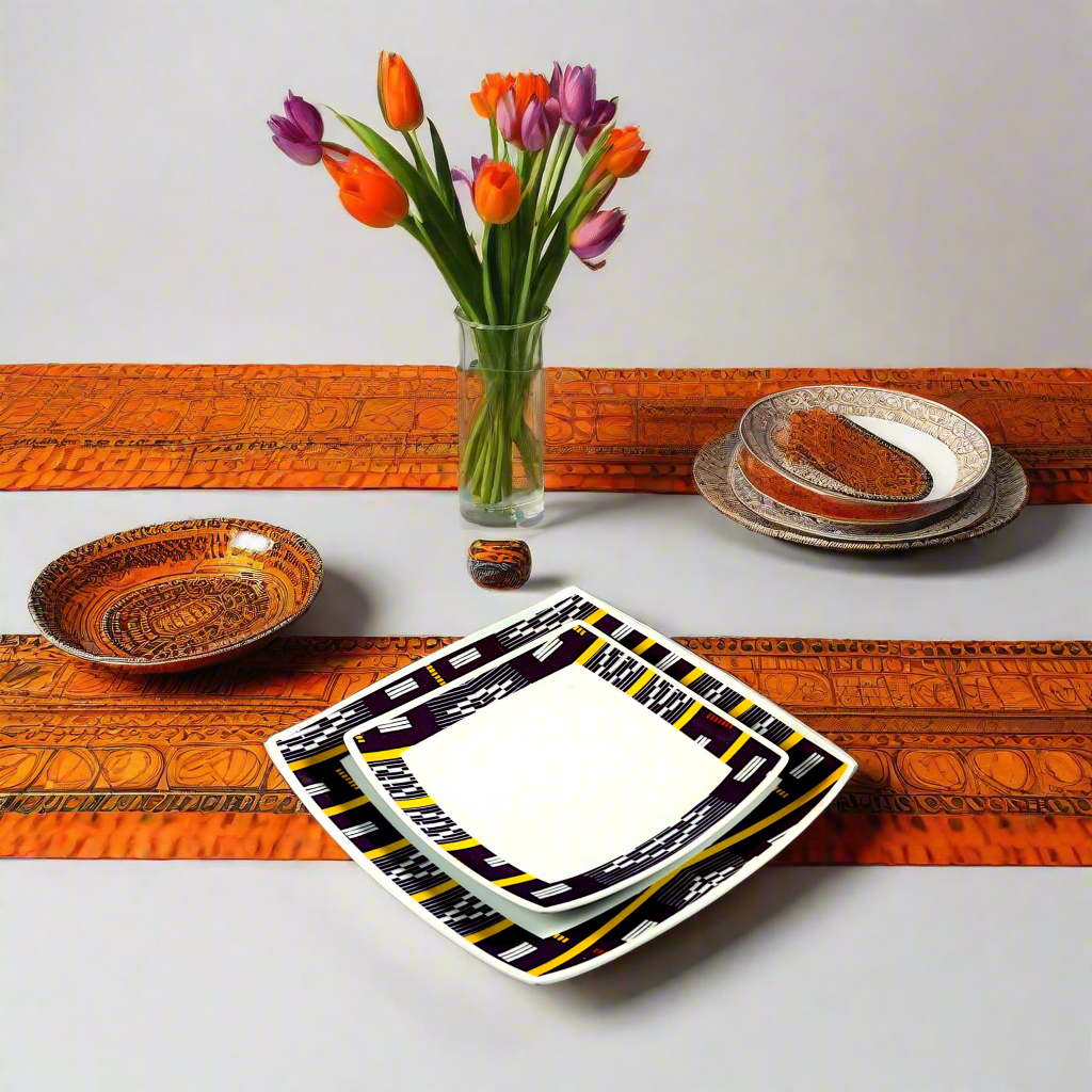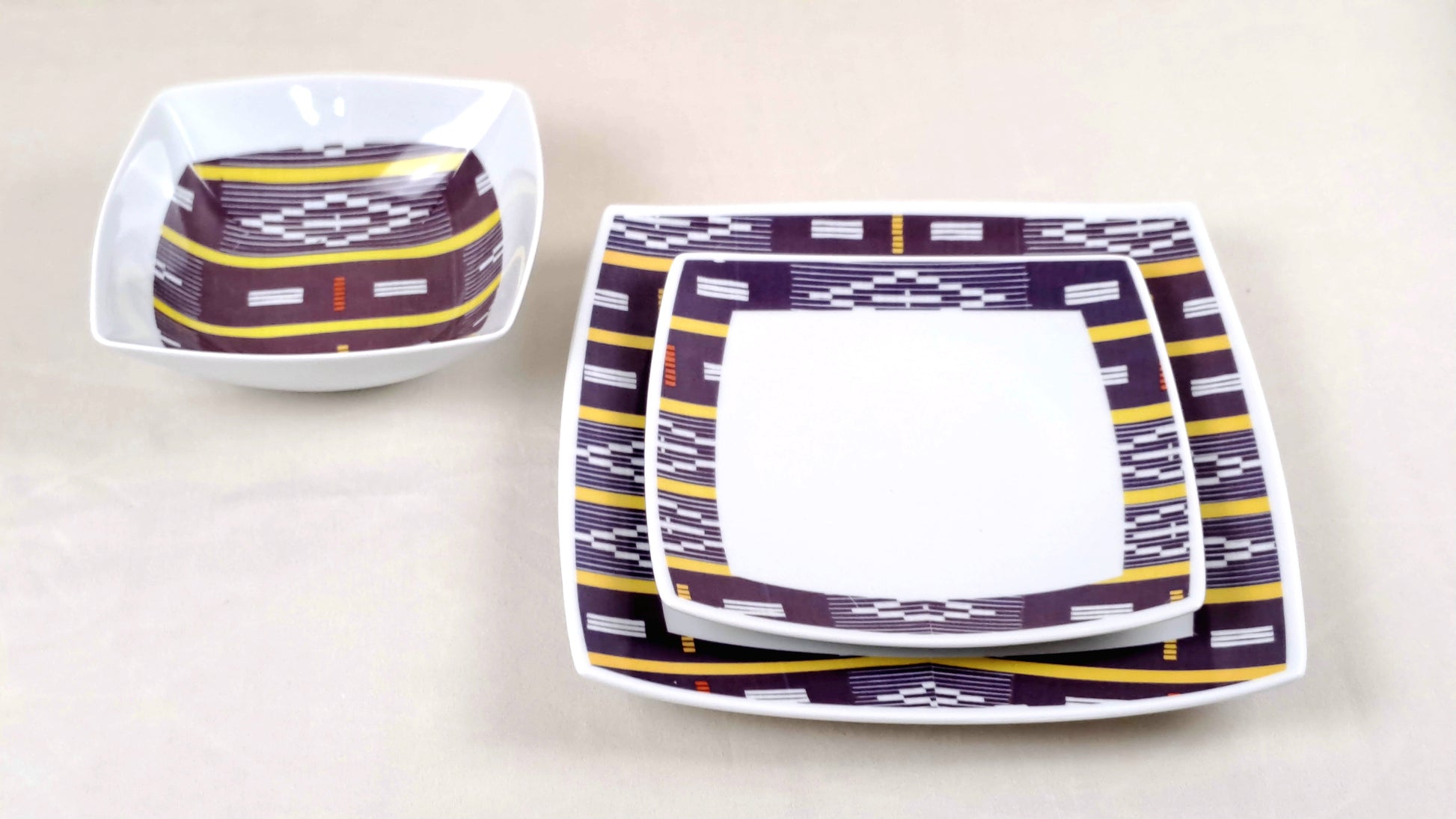 Entdecken Sie dieses Set quadratischer Teller mit einem Streifenmuster „Baoulé de Côte d'Ivoire“ . das sich durch sein raffiniertes und einzigartiges Design auszeichnet. Diese Komposition ist wie folgt organisiert: