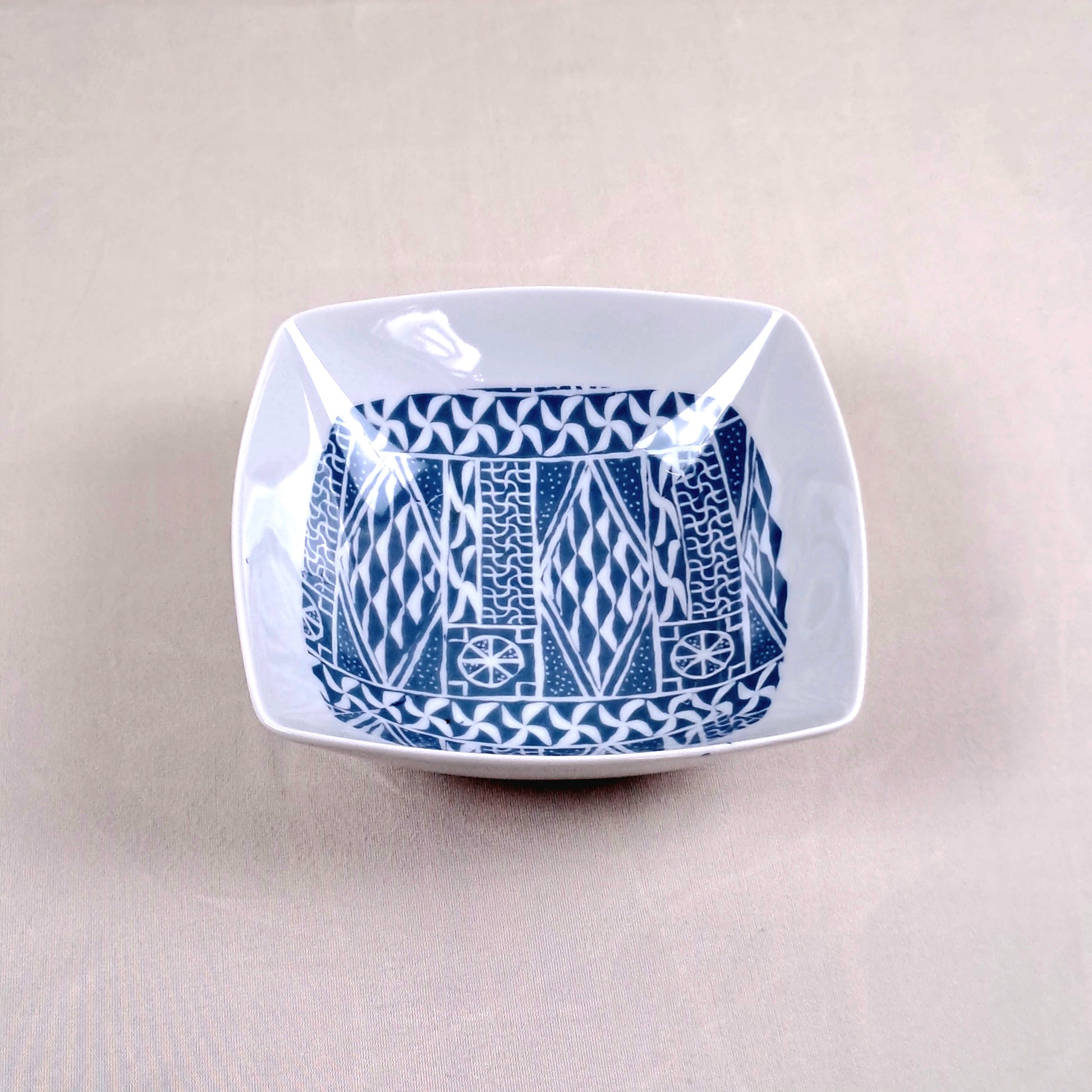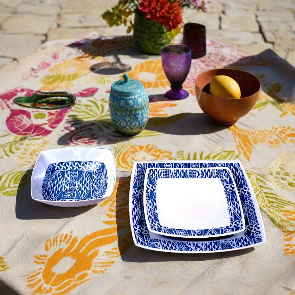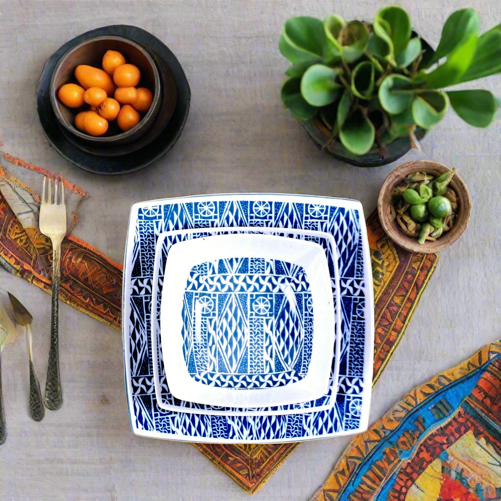 ### **Coffret de 6 Assiettes Carrées en Porcelaine Fine – Motif Ethnique "Ndop" Bleu du Cameroun**