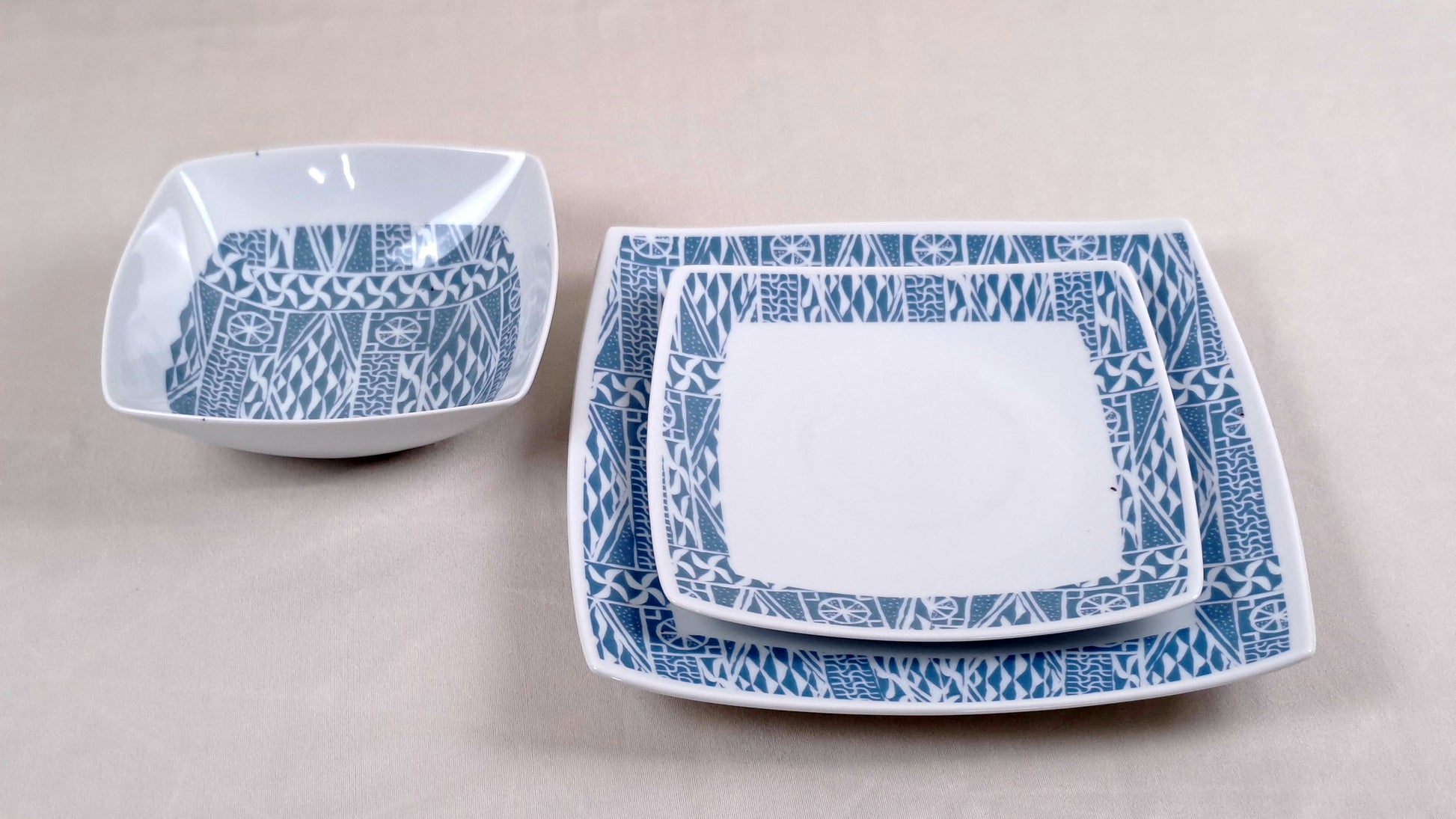 Coffret d'assiettes carrées en porcelaine fine Française fabriquées à la demande avec motif anneau ethnique d'Afrique "Ndop", du Cameroun présenté dans un coffret de 6 assiettes.