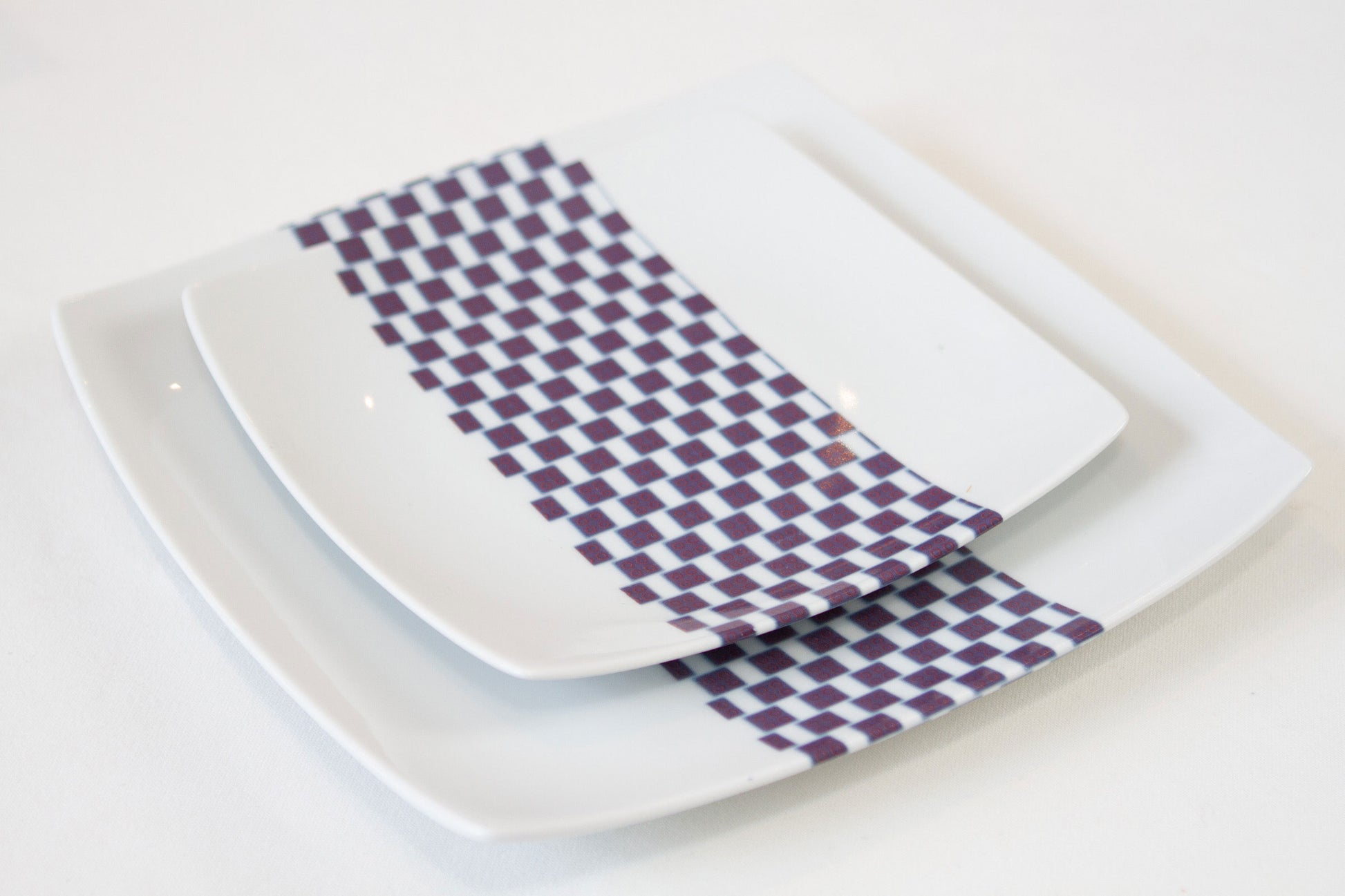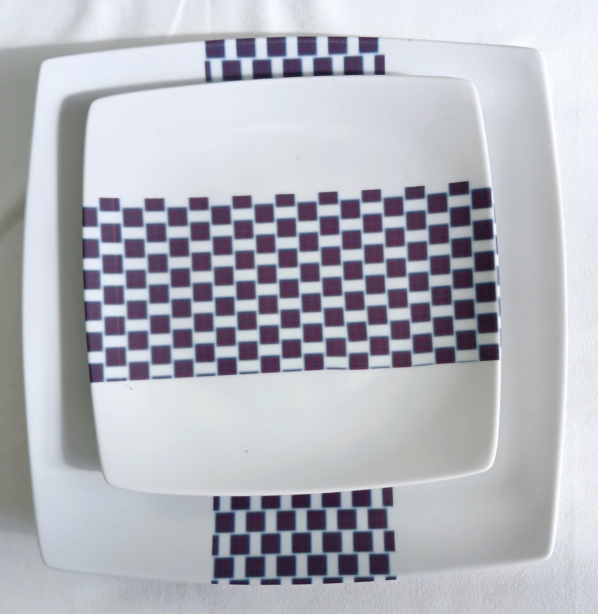 Set of square plates in fine French porcelain made to order with African WAX band motif "Ludo Kouin" in a set of 12