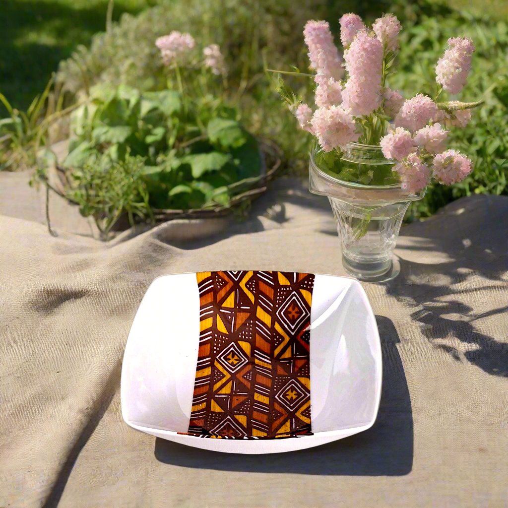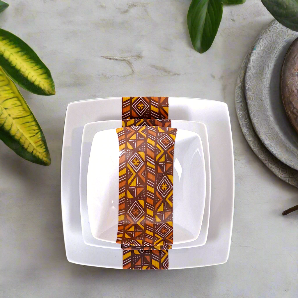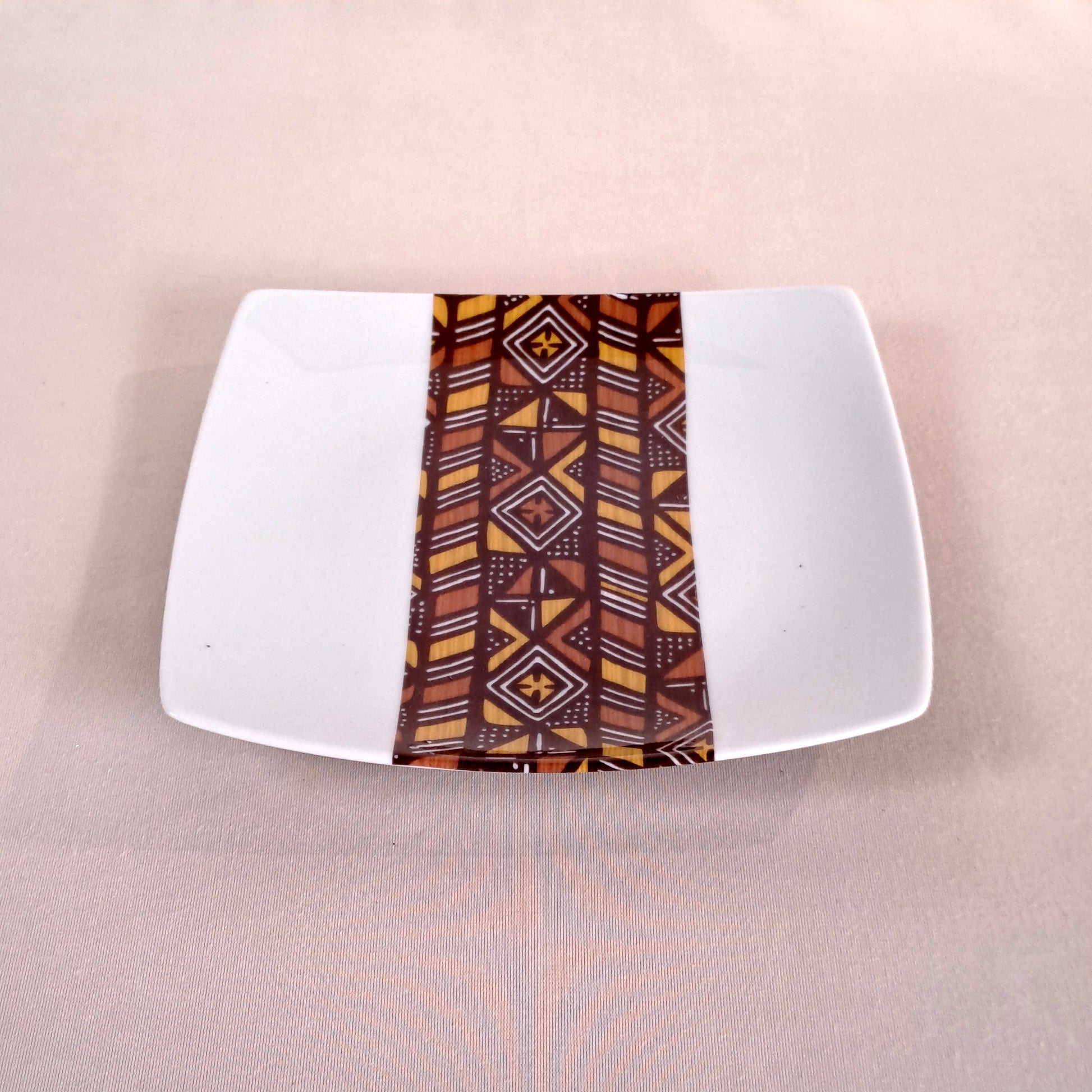 ✅ **Design unique** – Motif **Bogolan**, caractérisé par ses **bandes ethniques**, qui encadrent harmonieusement les plats et subliment leur présentation.