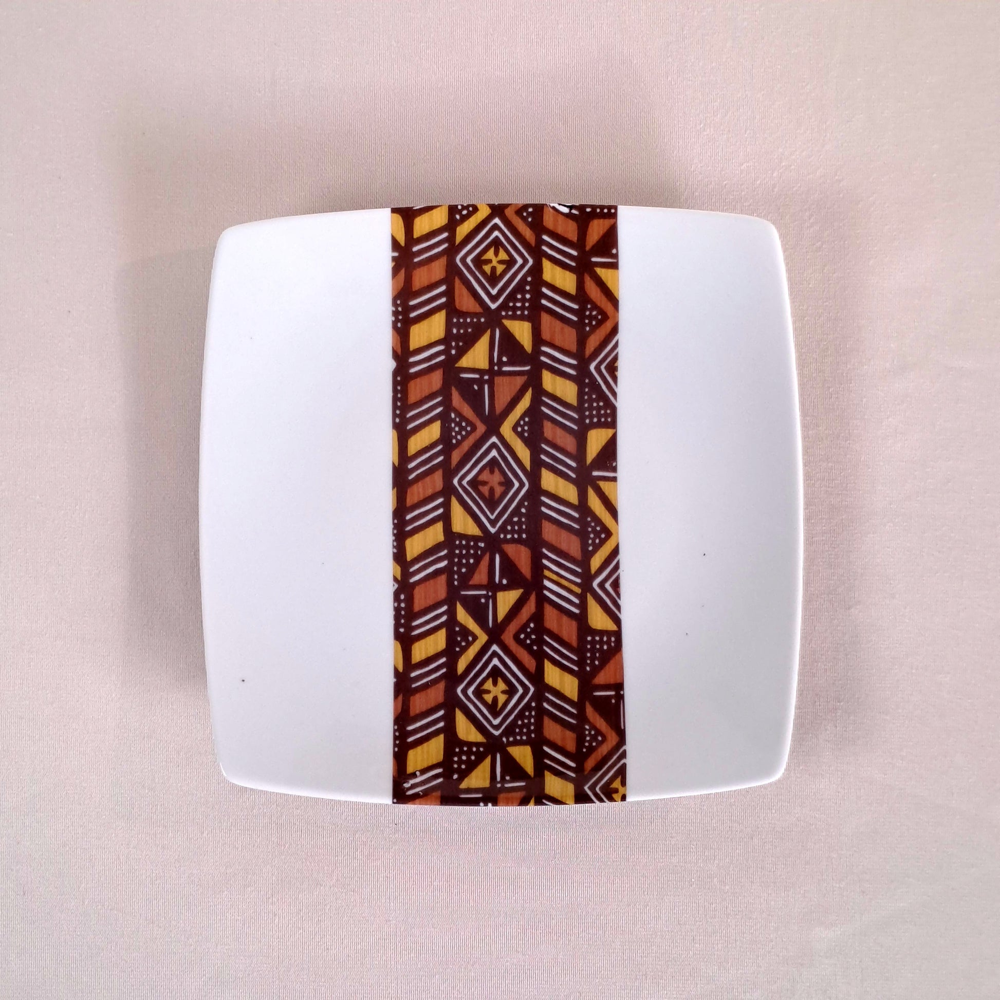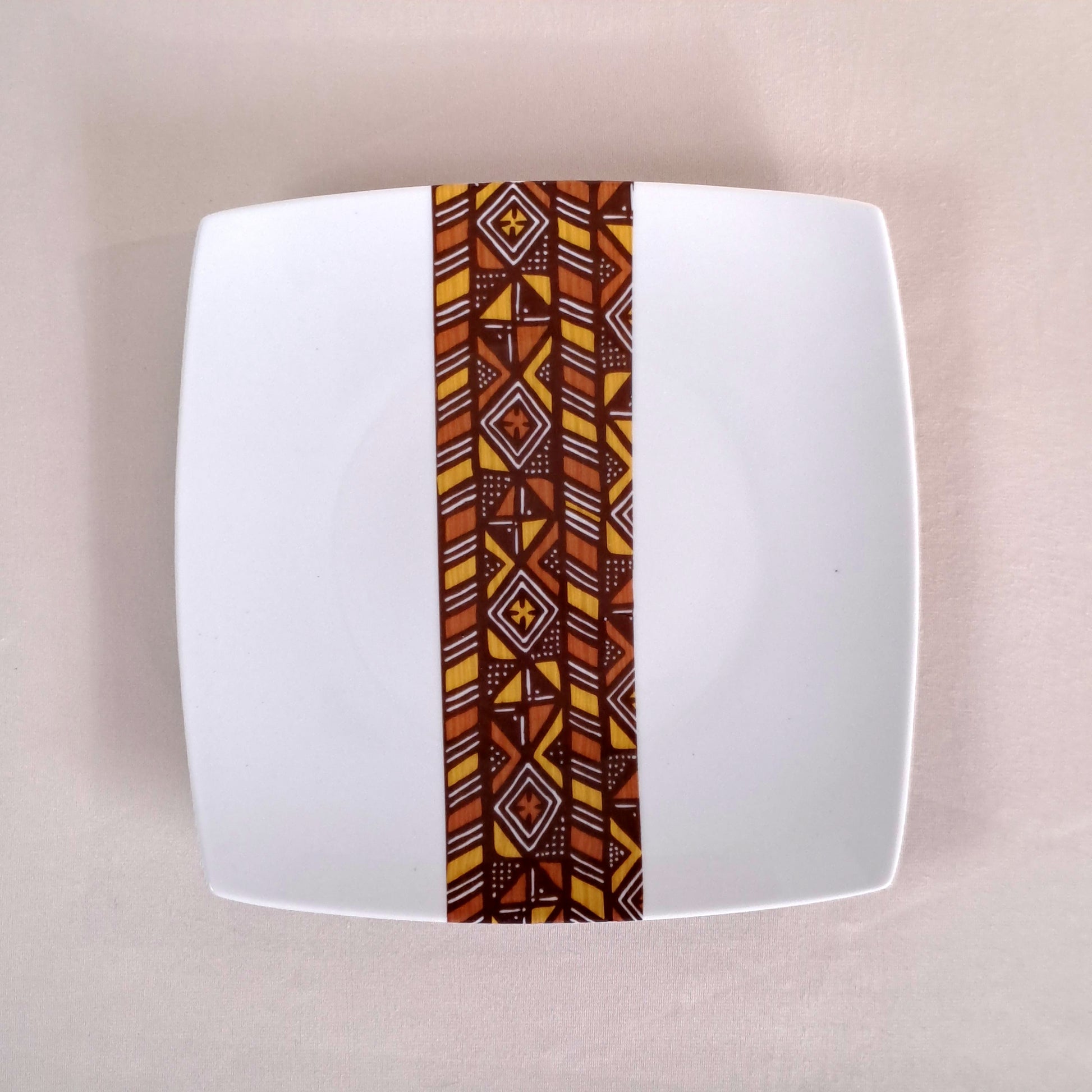 Coffret d'assiettes carrées en porcelaine fine Française fabriquées à la demande avec motif bande Ethnique d'Afrique "Bogolan" dans coffret de 6