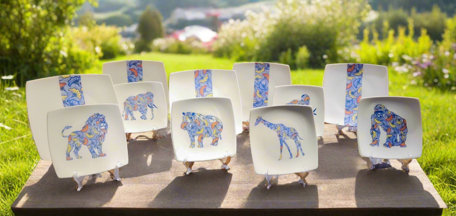 Coffret d'assiettes carrées en porcelaine fine Française fabriquées à la demande avec motif bande wax d'Afrique "Fleurs de Mariage" et Animaux dans coffret de 12