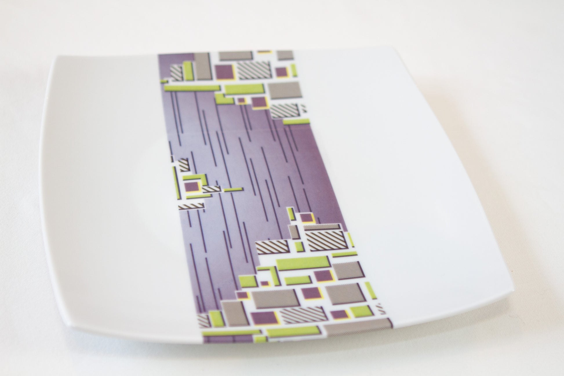 Coffret d'assiettes carrées en porcelaine fine Française fabriquées à la demande avec motif bande WAX d'afrique "Milliardaire" dans coffret de 12