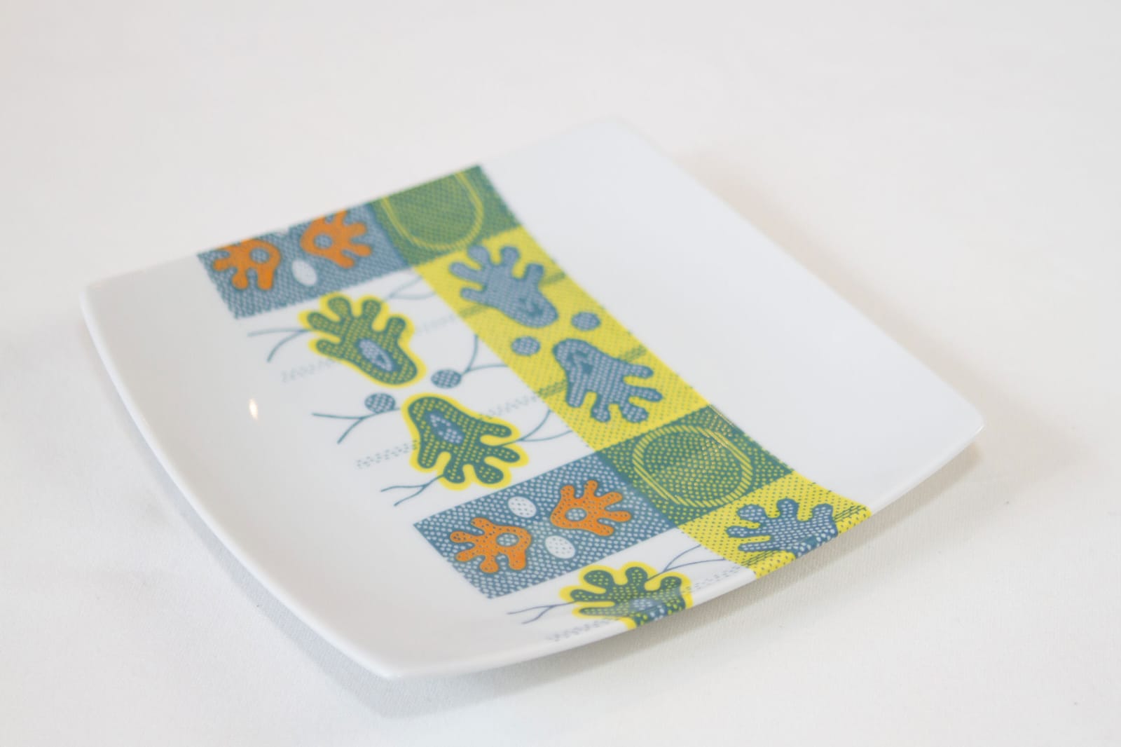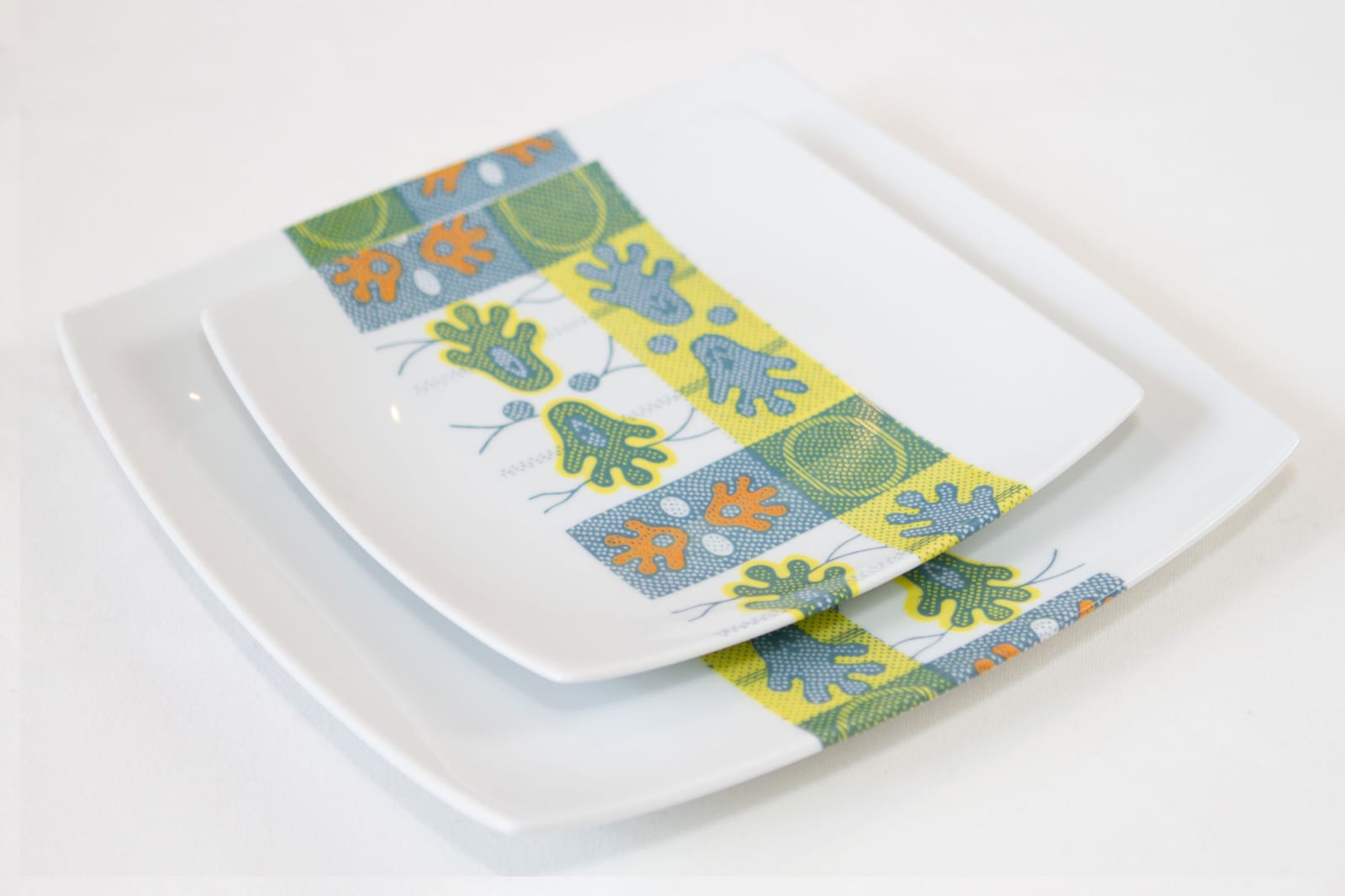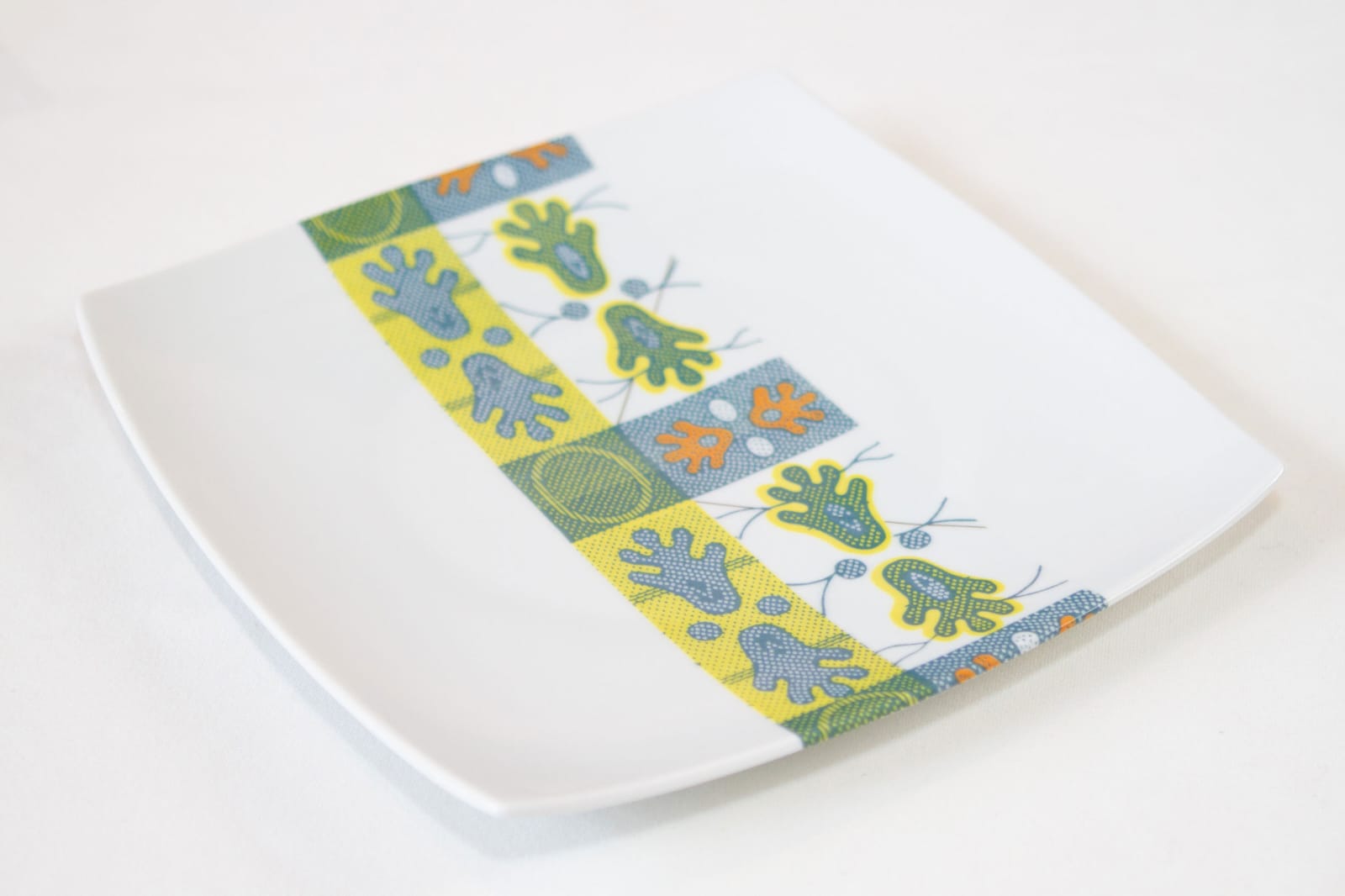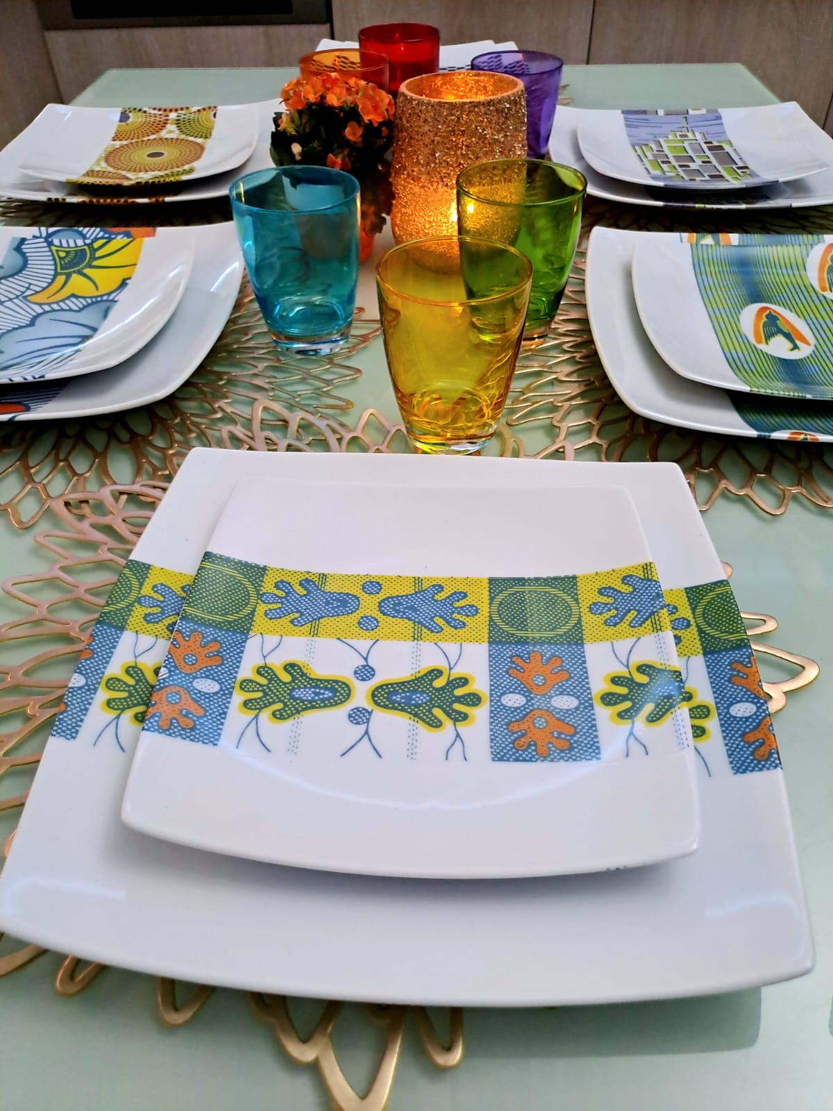 Coffret d'assiettes carrées en porcelaine fine Française fabriquées à la demande avec motif bande WAX d'afrique "Ton pied Mon pied" dans coffret de 12