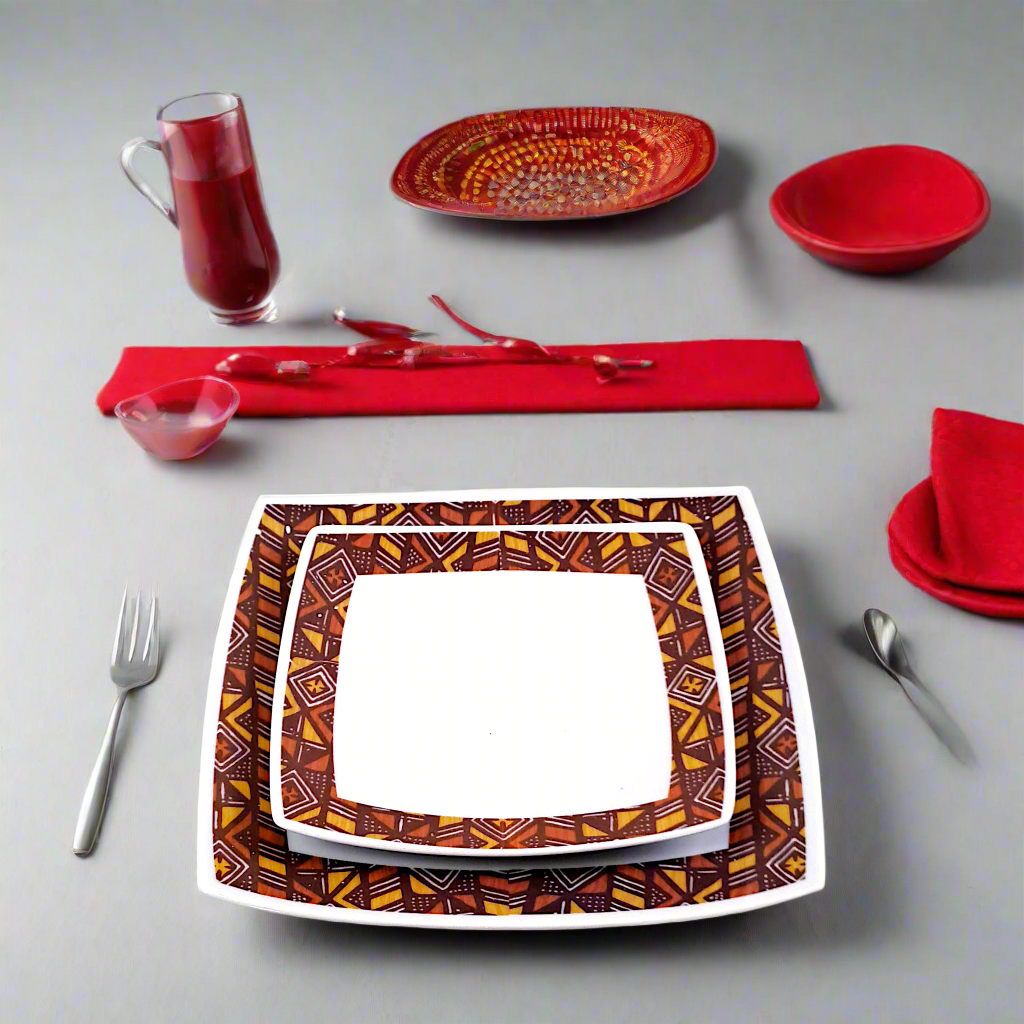 ### **Coffret de 6 Assiettes Carrées en Porcelaine Fine – Motif "Bogolan Rhinocéros"**