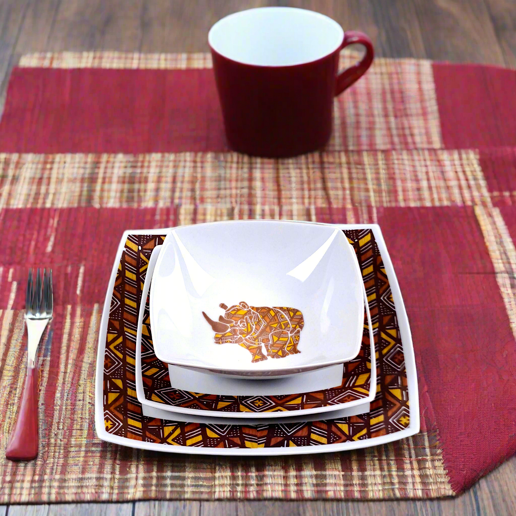 ✅ **Design unique** – Motif **Bogolan Rhinocéros**, caractérisé par ses **anneaux ethniques**, qui encadrent harmonieusement les plats et subliment leur présentation.