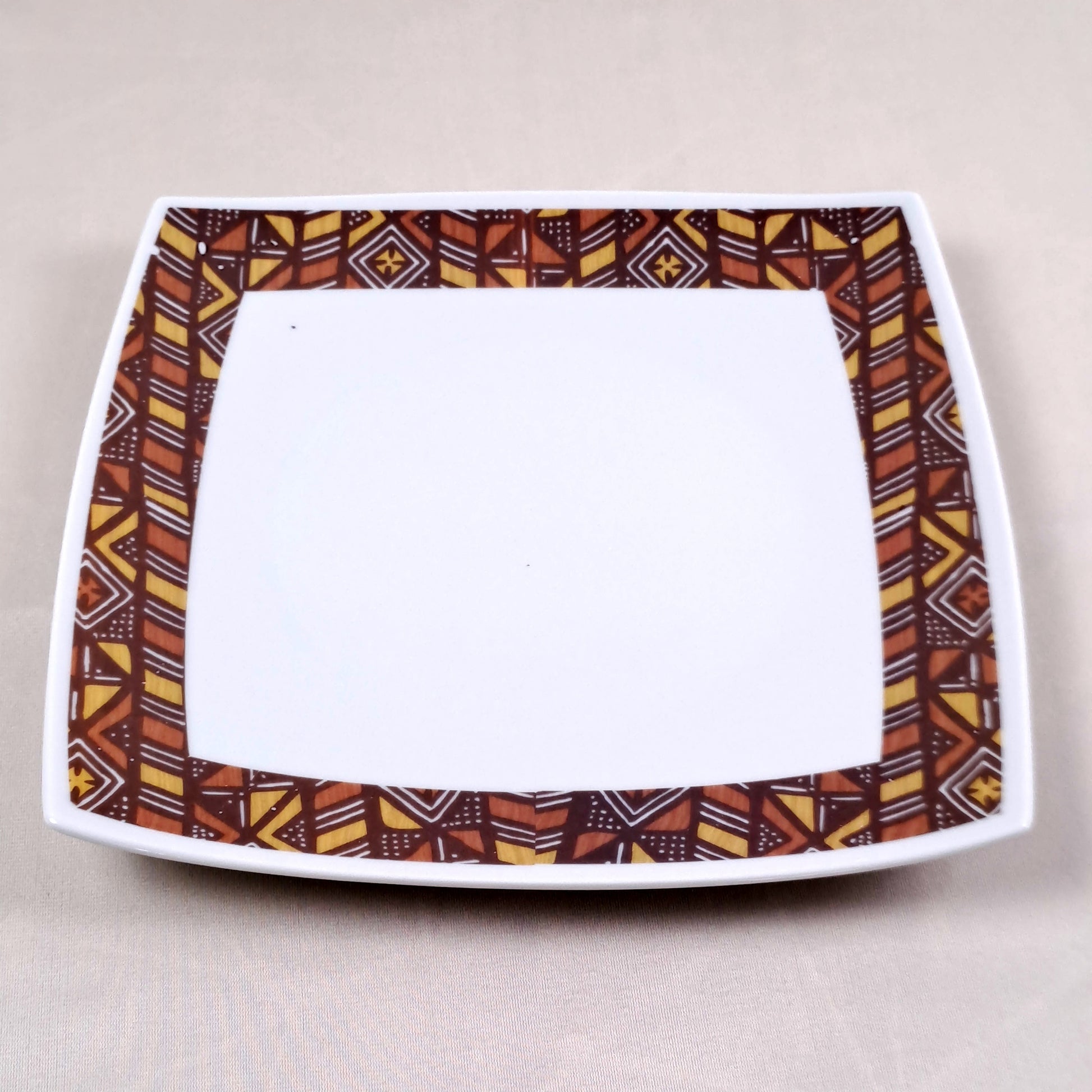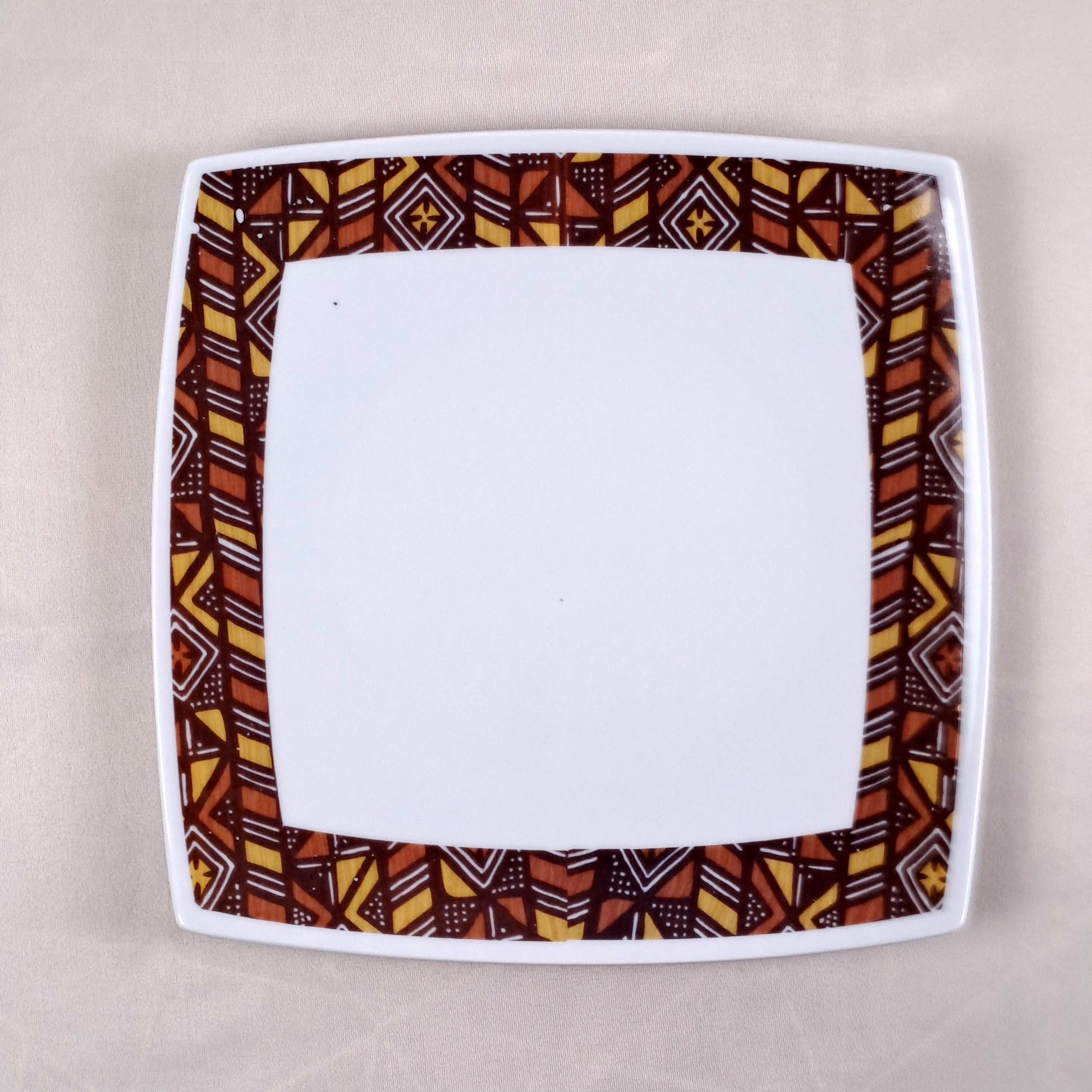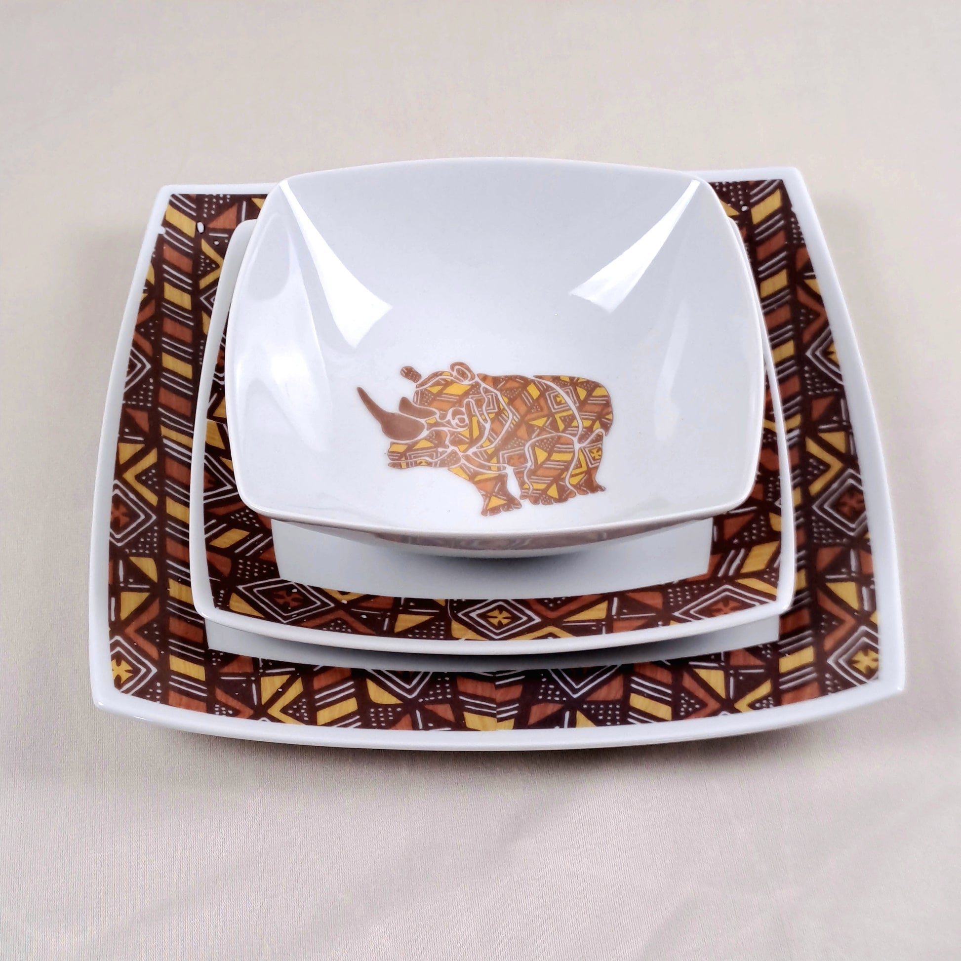 Coffret d'assiettes carrées en porcelaine fine Française fabriquées à la demande avec motif anneau Ethnique d'Afrique "Bogolan Rhinoceros" dans coffret de 6