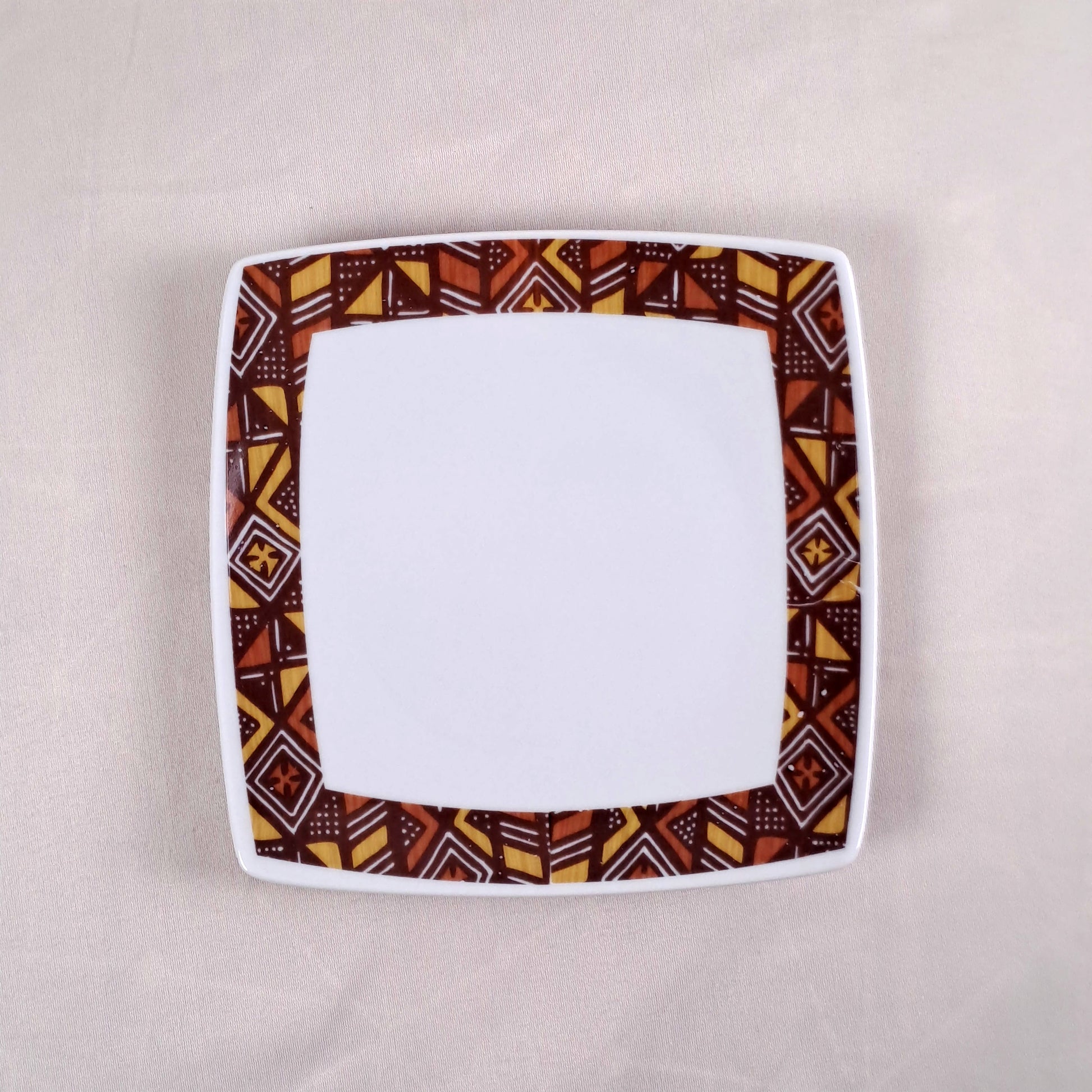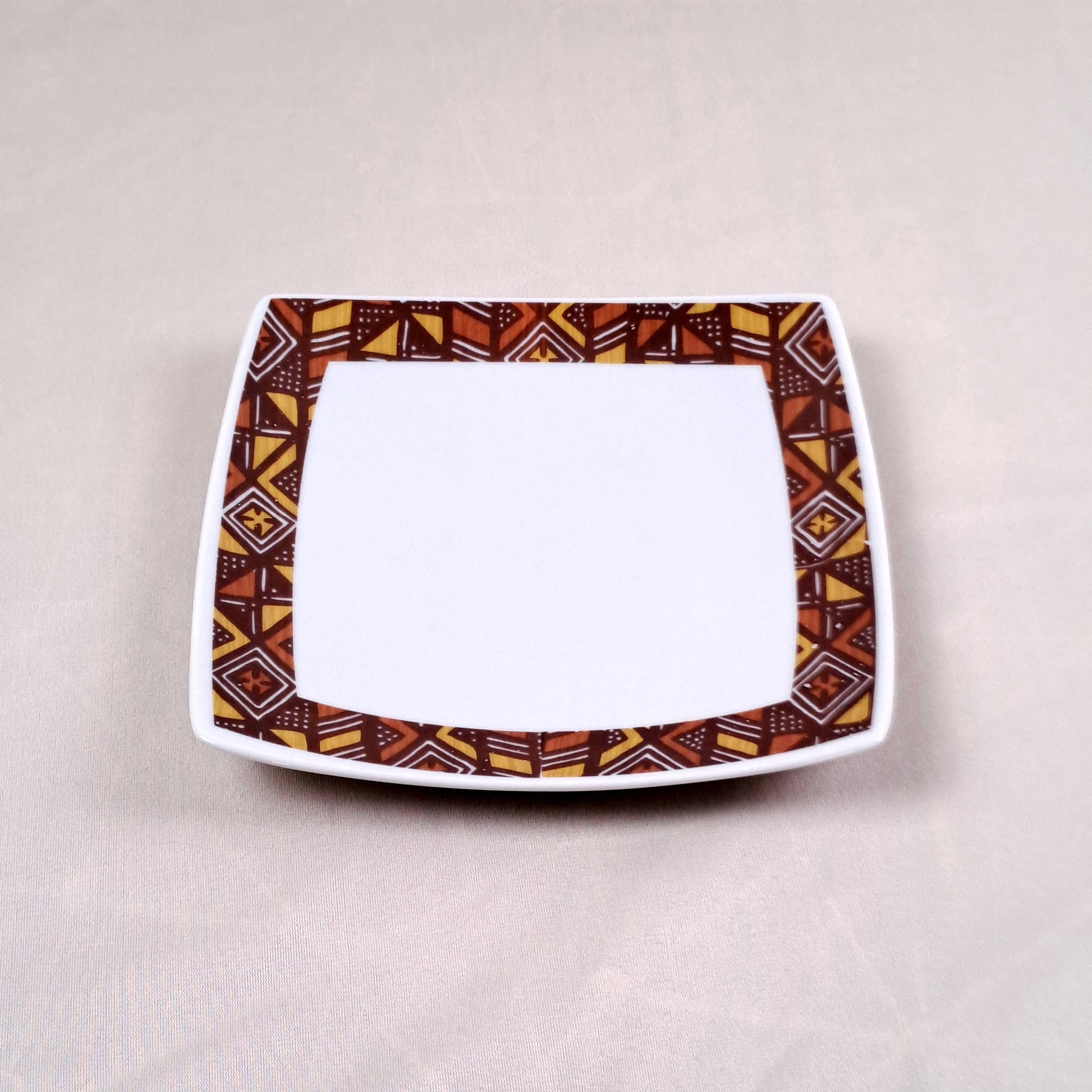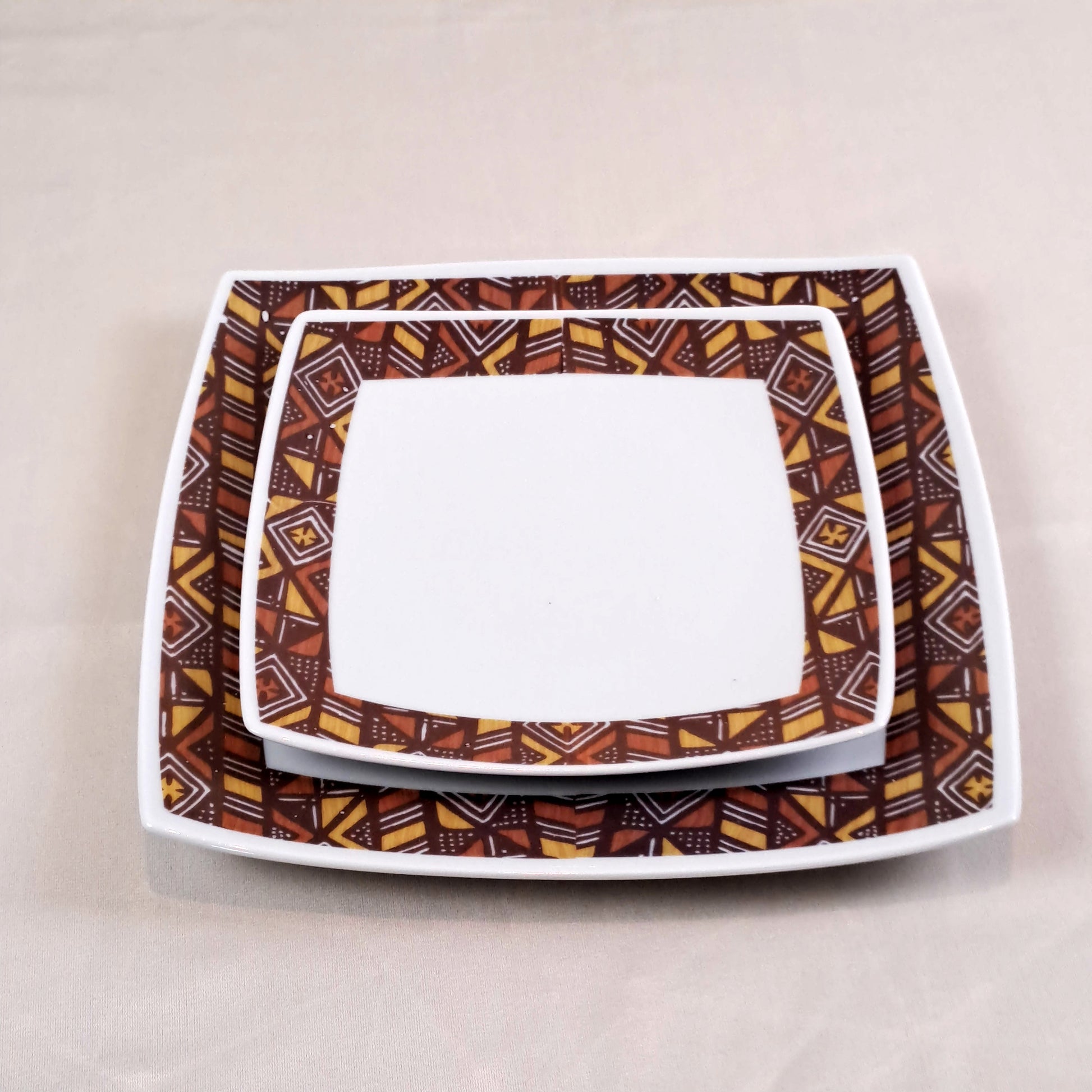 Coffret d'assiettes carrées en porcelaine fine Française fabriquées à la demande avec motif anneau Ethnique d'Afrique "Bogolan Rhinoceros" dans coffret de 6