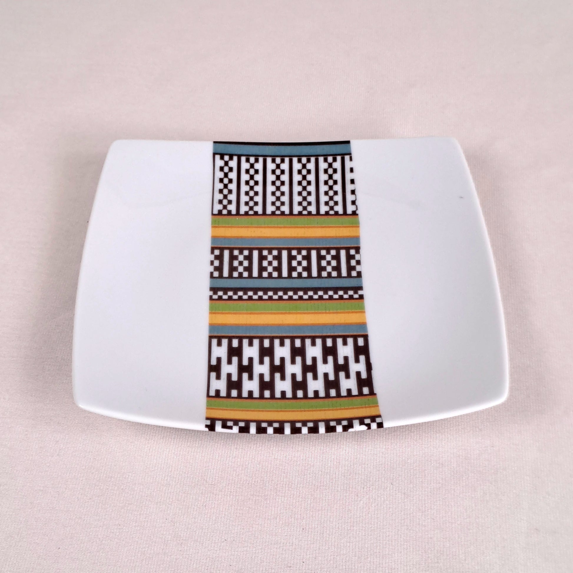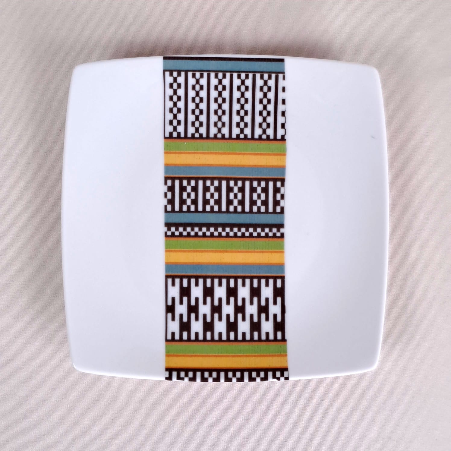 Coffret d'assiettes carrées en porcelaine fine Française fabriquées à la demande avec motif bande ethnique d'Afrique "Kounta" ou "Kanta" du Niger, présenté dans un coffret de 6 assiettes