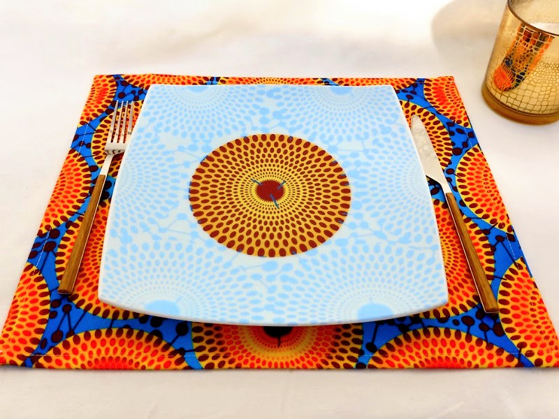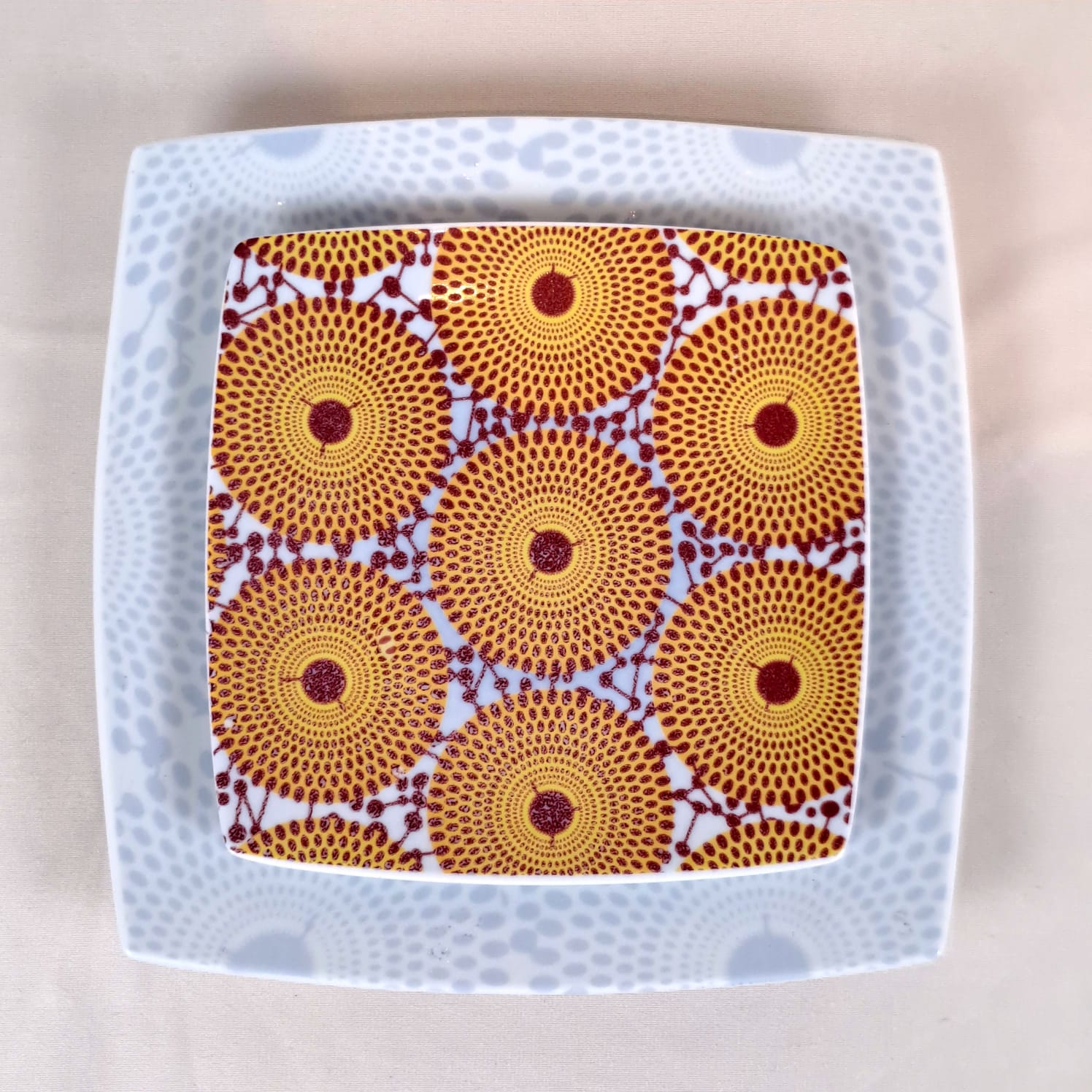 Coffret d'assiettes en porcelaine Française fabriquées à la demande avec carrées motif plein wax d'Afrique Gammaphone dans coffret de 6