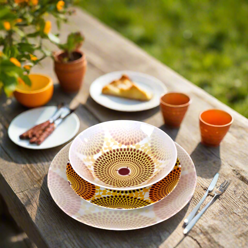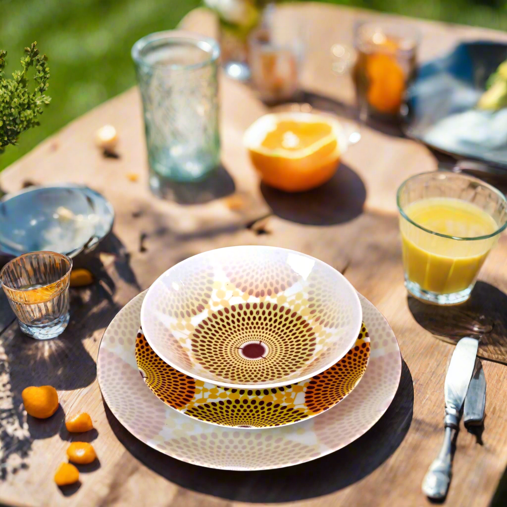 Coffret d'assiettes en porcelaine Française fabriquées à la demande avec motif plein wax d'Afrique Gammaphone dans coffret de 6