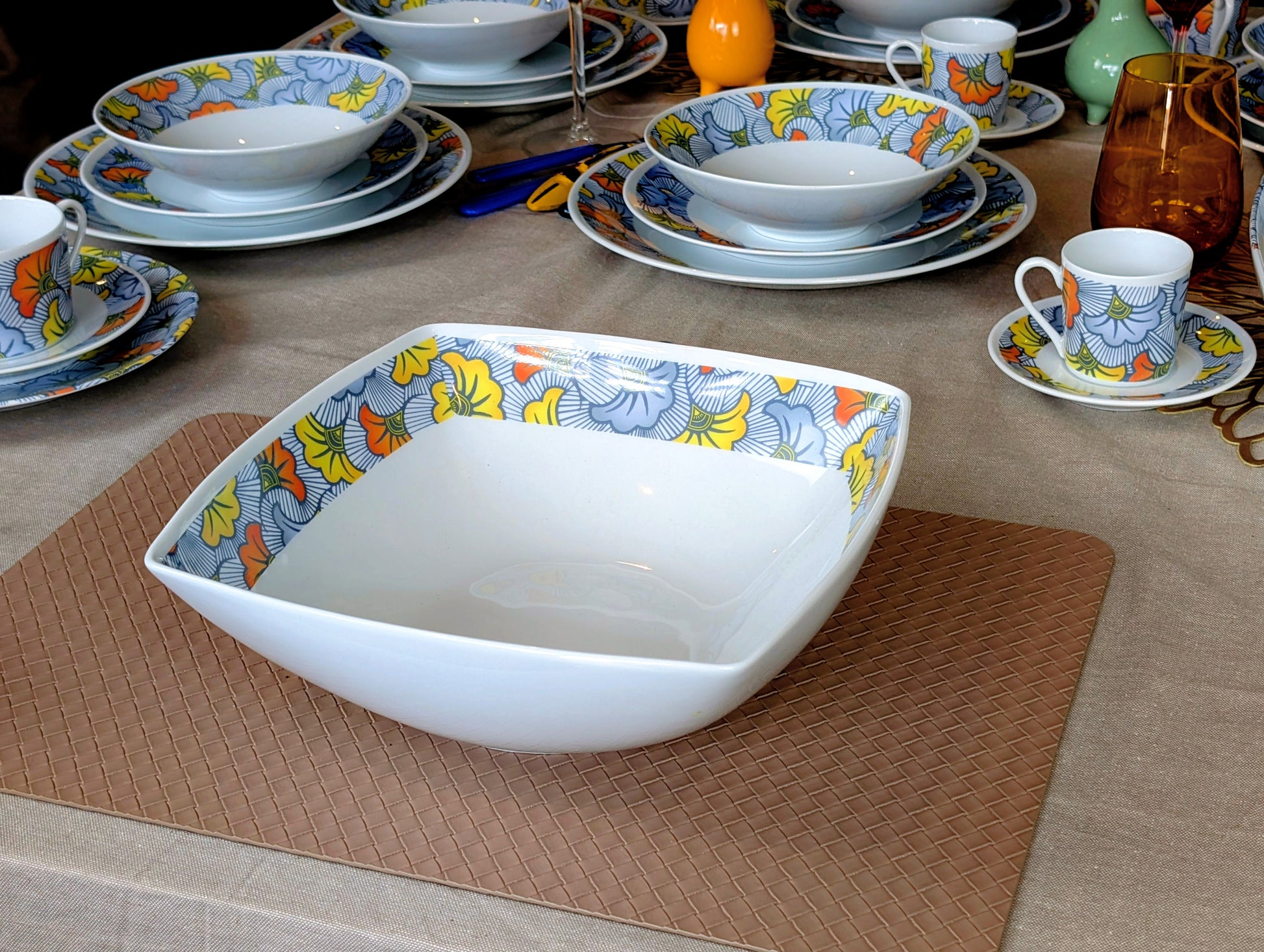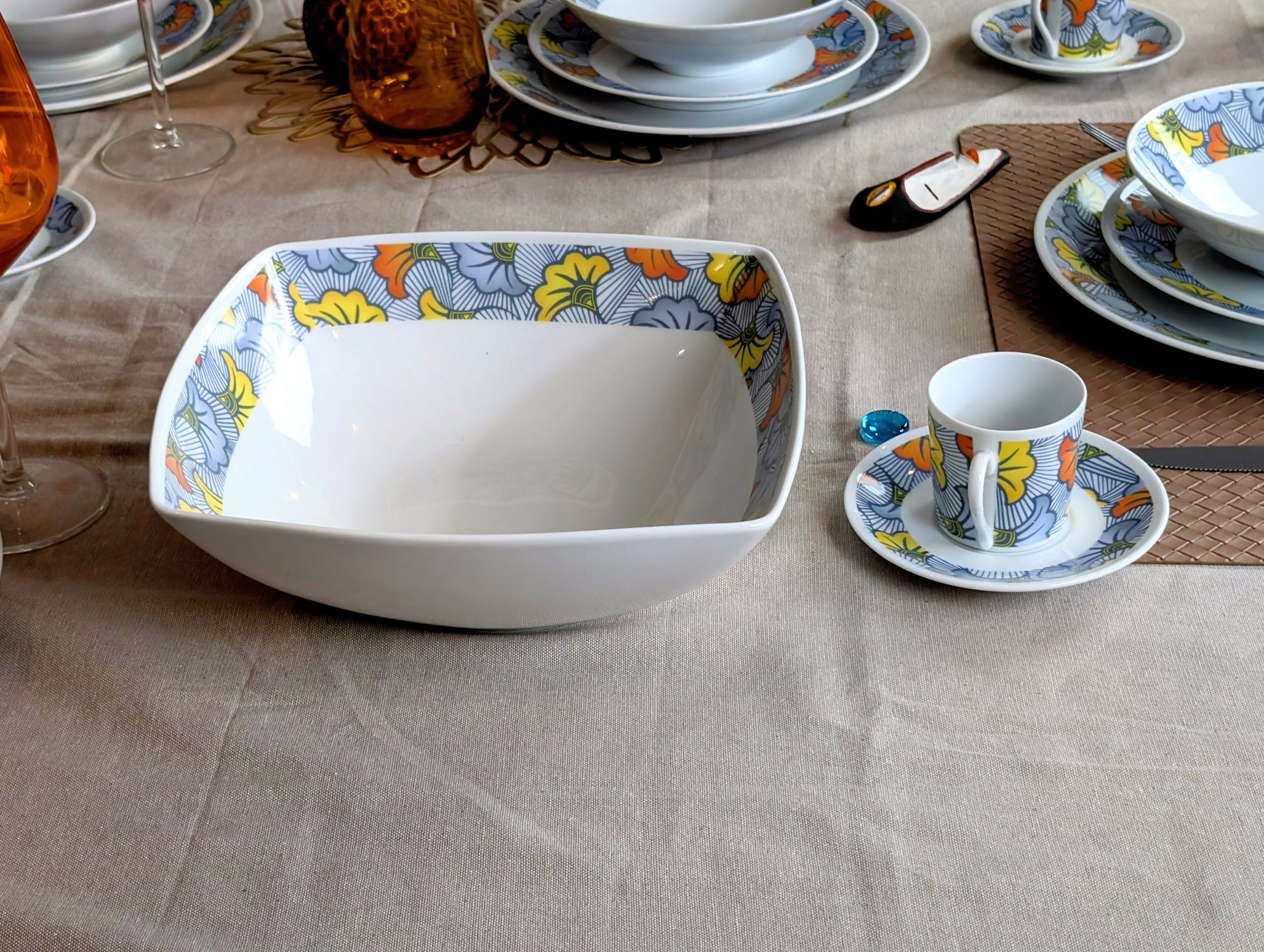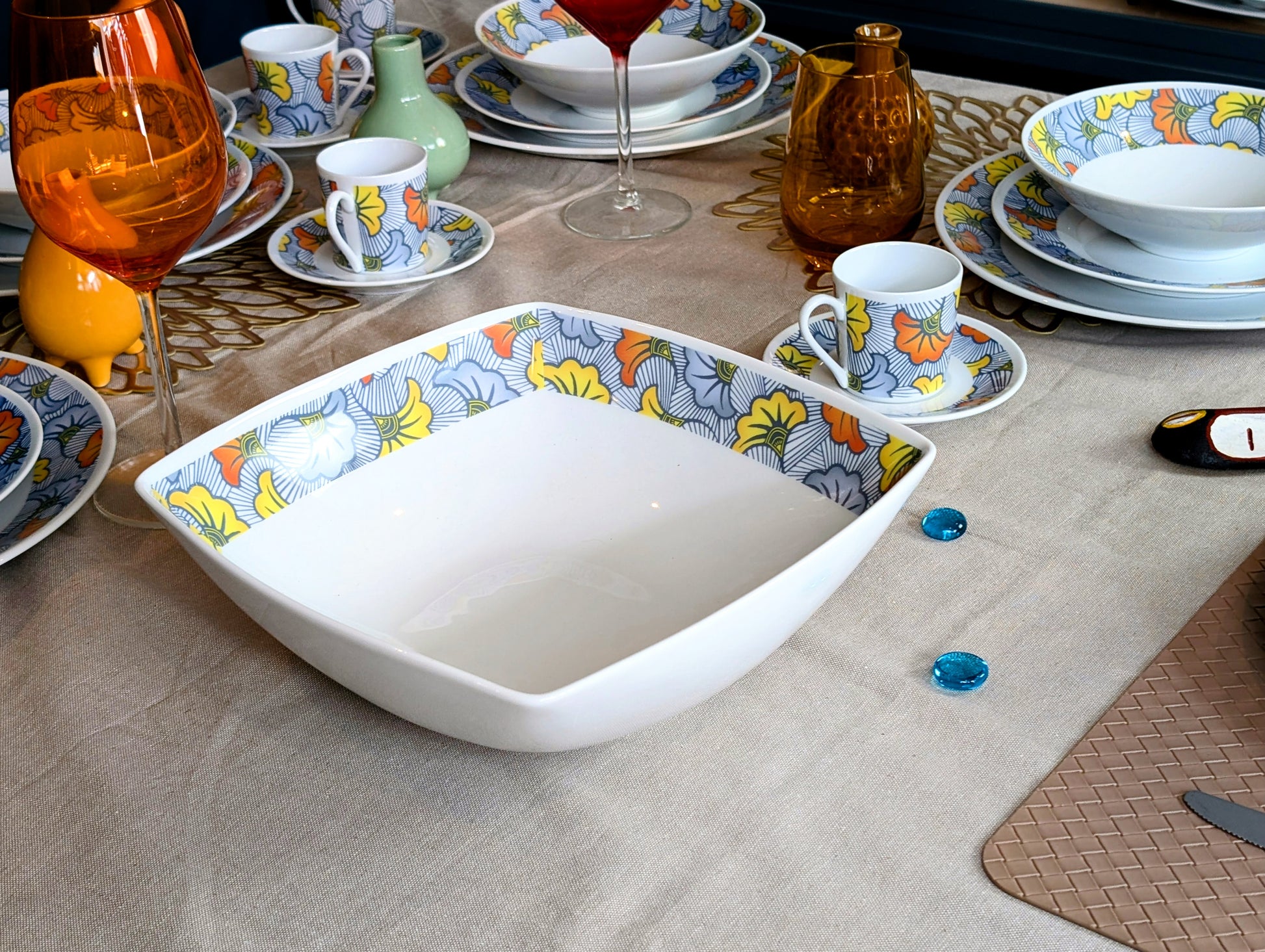 Saladier en porcelaine Française motif anneaux wax d'Afrique "Fleurs de Mariage" dans coffret