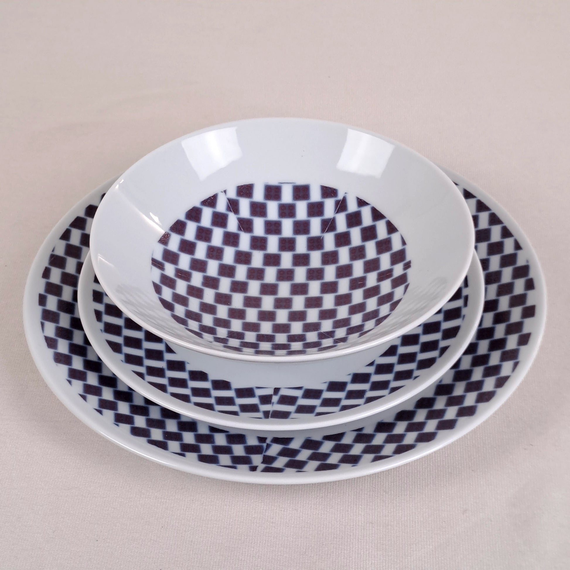 Coffret d'assiettes rondes en porcelaine fine Française fabriquées à la demande avec motif anneaux larges WAX d'afrique "Ludo Kouin" dans coffret de 6