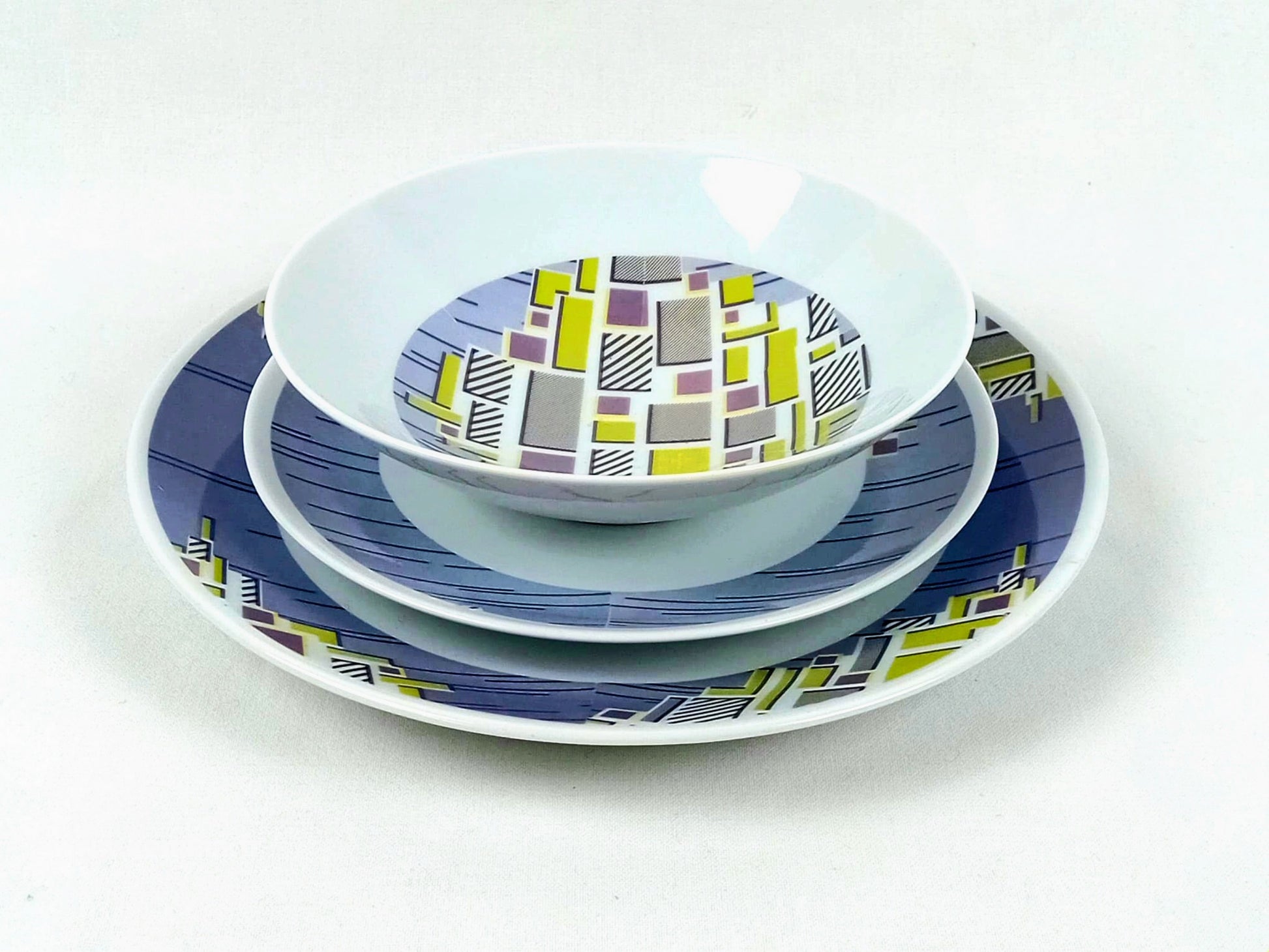 Coffret d'assiettes rondes en porcelaine fine Française fabriquées à la demande avec motif anneaux larges WAX d'afrique "Milliardaire" dans coffret de 6