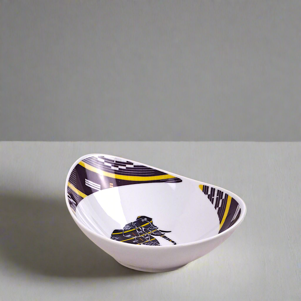 ### **Coffret de 6 Assiettes ovales en Porcelaine Fine – Motif "Baoulé" Noir et Jaune de Côte d’Ivoire**