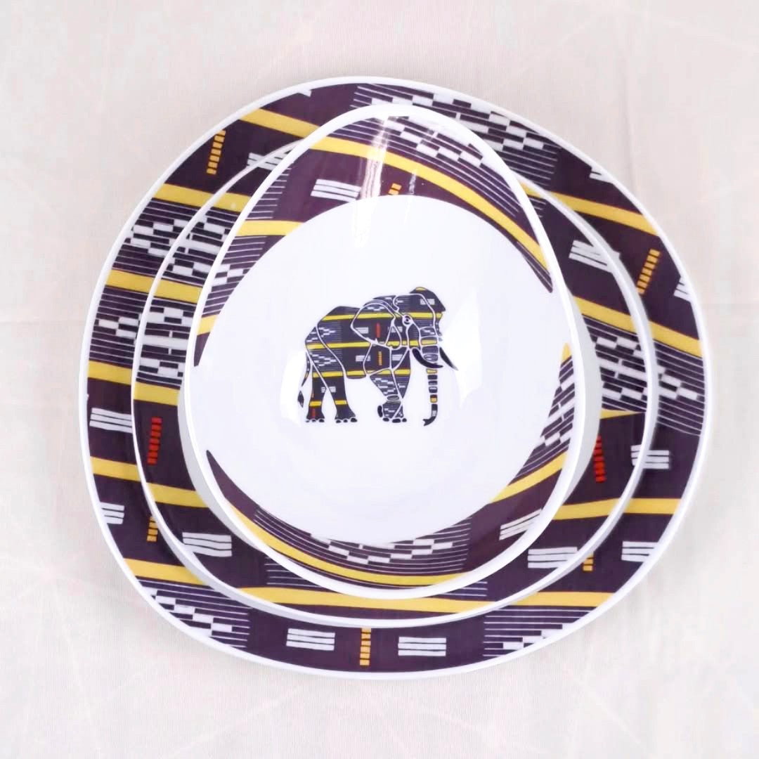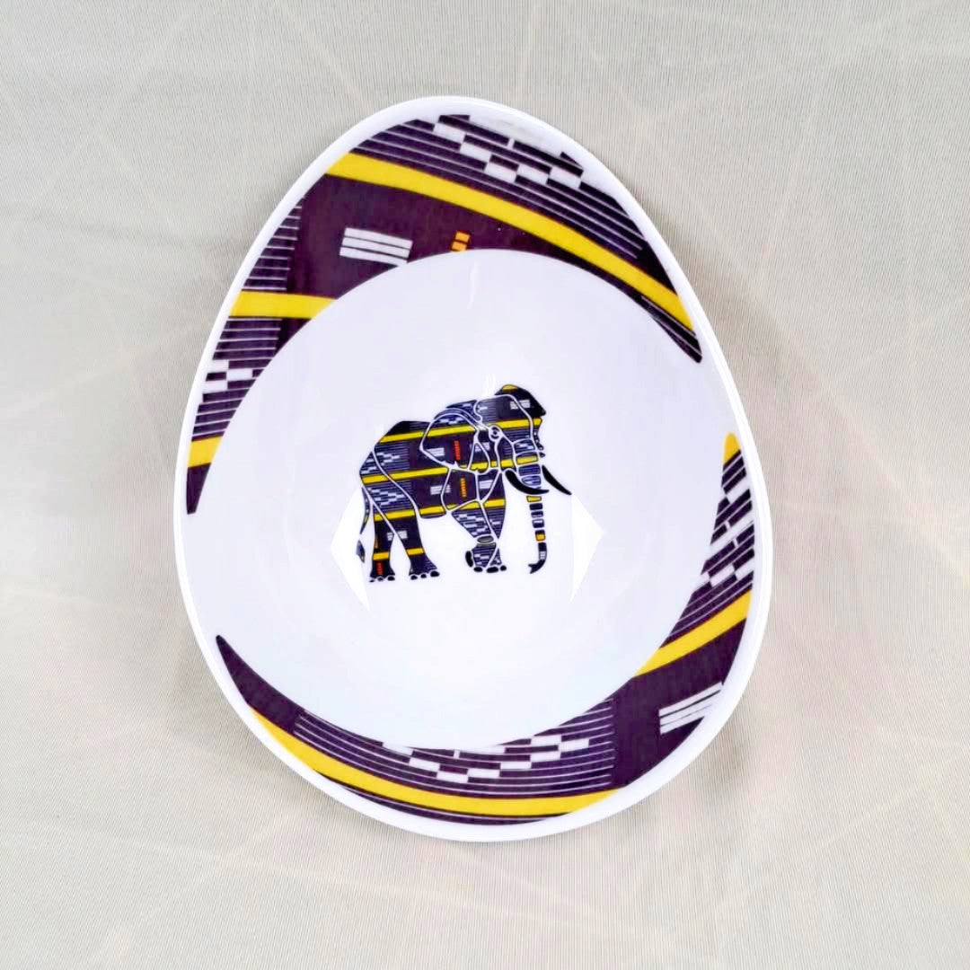 Coffret d'assiettes ovales en porcelaine fine Française fabriquées à la demande avec motif anneau Ethnique "Baoulé" de Côte d'Ivoire dans coffret de 6 assiettes