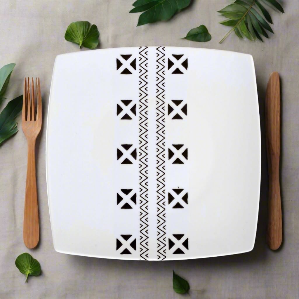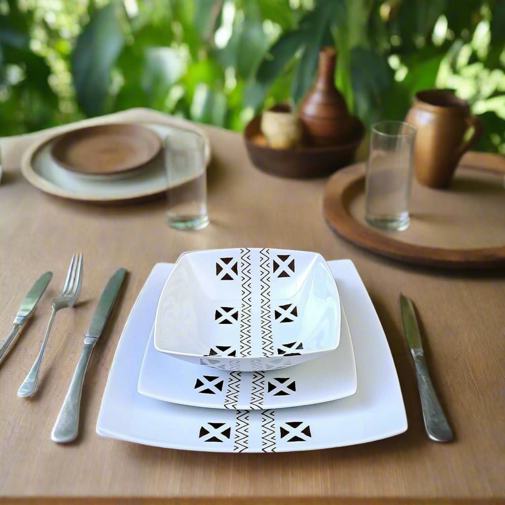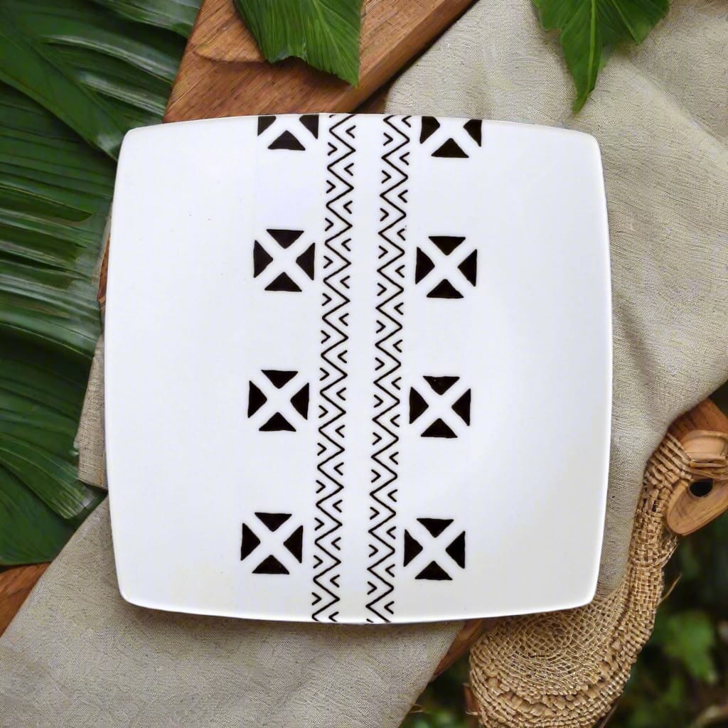 🟡 Coffret de 6 Assiettes Carrées en Porcelaine Fine – Motif Ethnique "#Kente ou Kita"