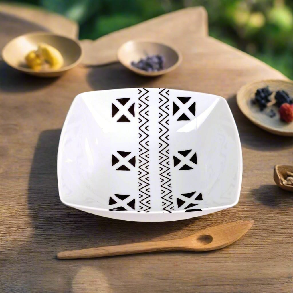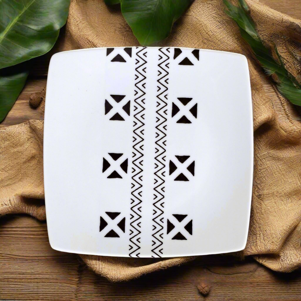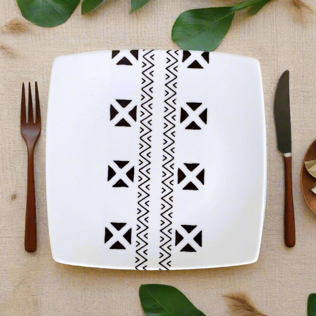 🟡 Coffret de 6 Assiettes Carrées en Porcelaine Fine – Motif Ethnique "#Kente ou Kita"