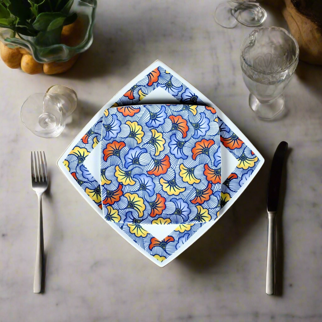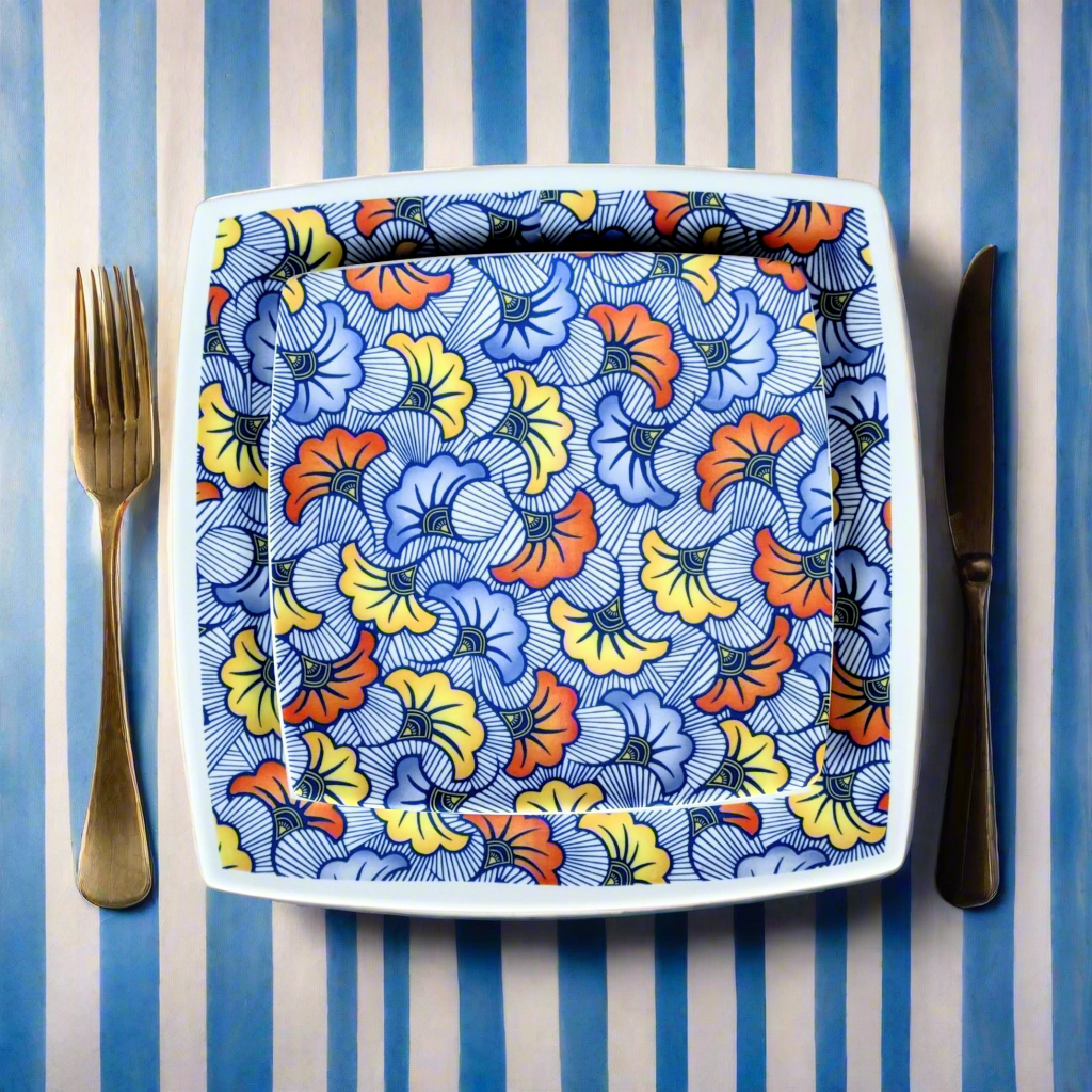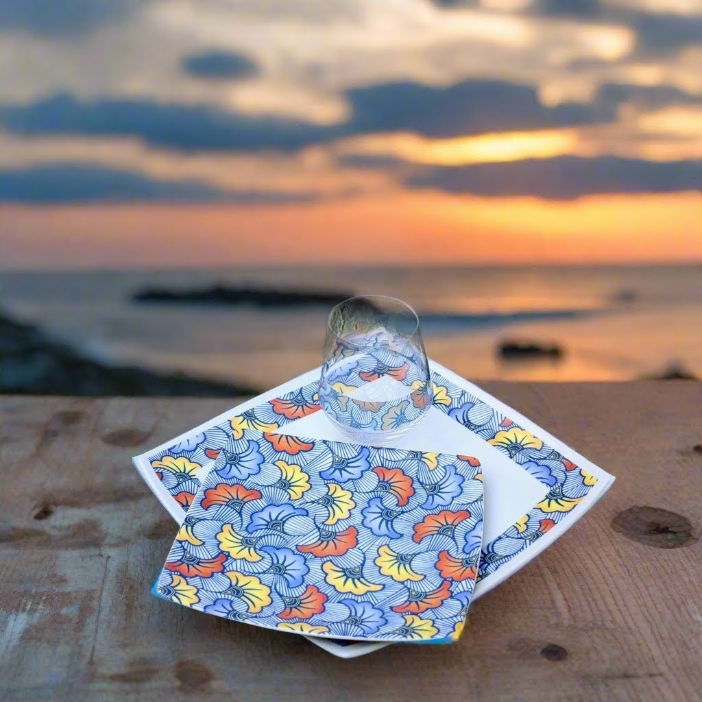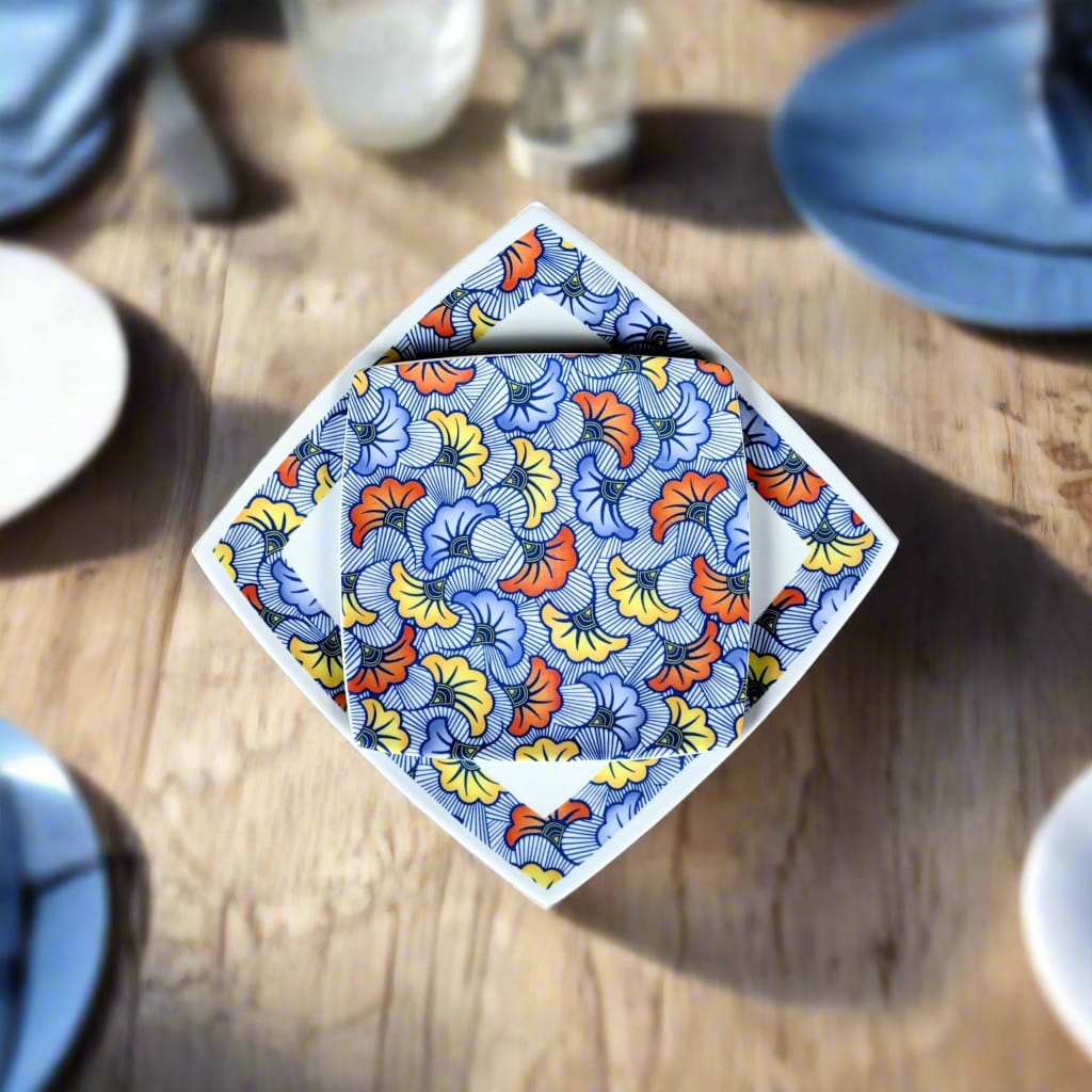 Inspiré du célèbre motif ivoirien "Grandes Fleurs de Mariage" datant de 1979, cette version douce et verdoyante est pensée pour les tables de célébration, les mariages intimistes ou simplement pour insuffler une énergie positive à vos repas.