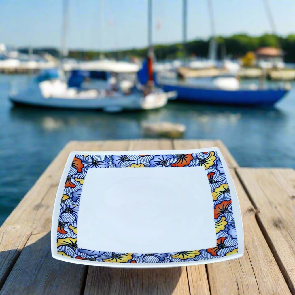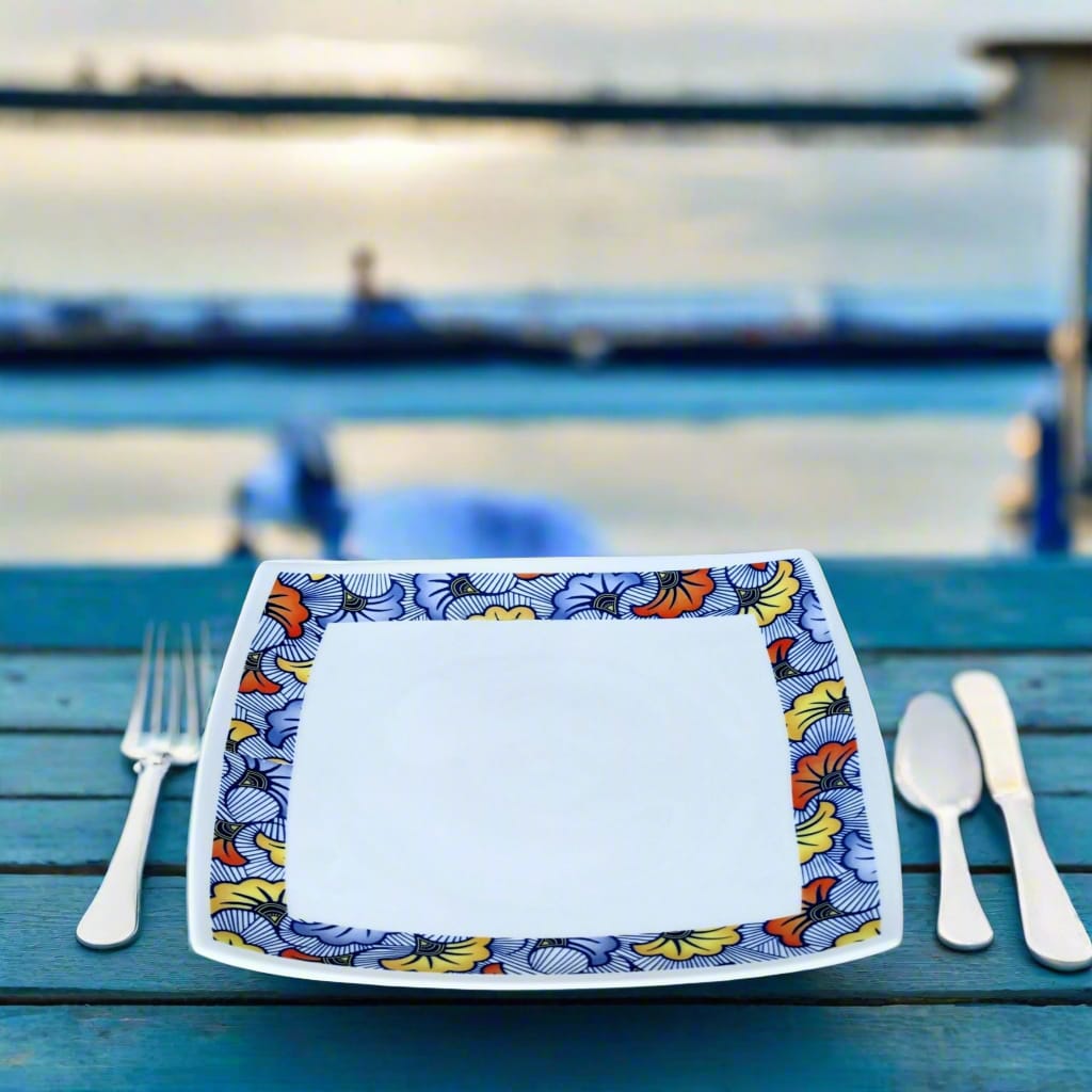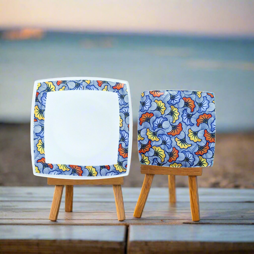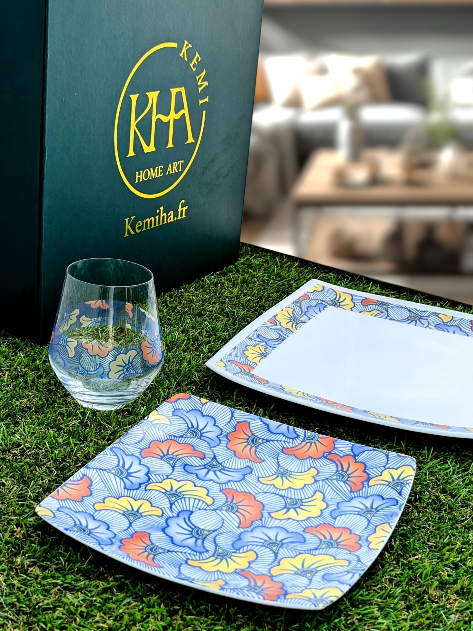 Ce coffret en porcelaine fine française met à l’honneur le motif "Petites Fleurs de Mariage", inspiré des célèbres tissus wax africains. Avec ses fleurs d’hibiscus imprimées sur une bande WAX bleu, il incarne la fraîcheur, l’amour durable et le raffinement, tout en rendant hommage aux traditions festives du continent africain.