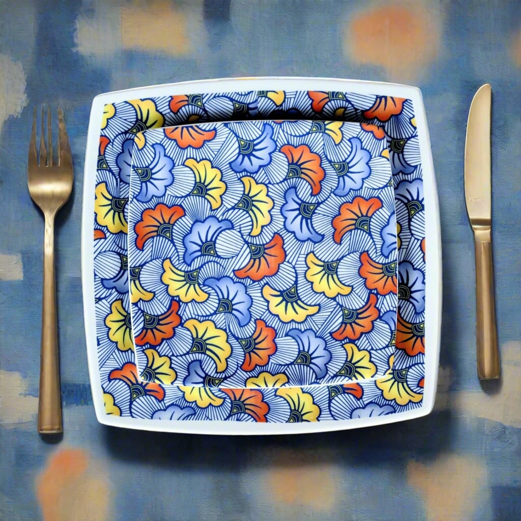 Coffret d'assiettes en porcelaine fine Française fabriquées à la demande avec motif anneau combiné WAX d'afrique "Fleurs de Mariage" bleu dans coffrets de 12