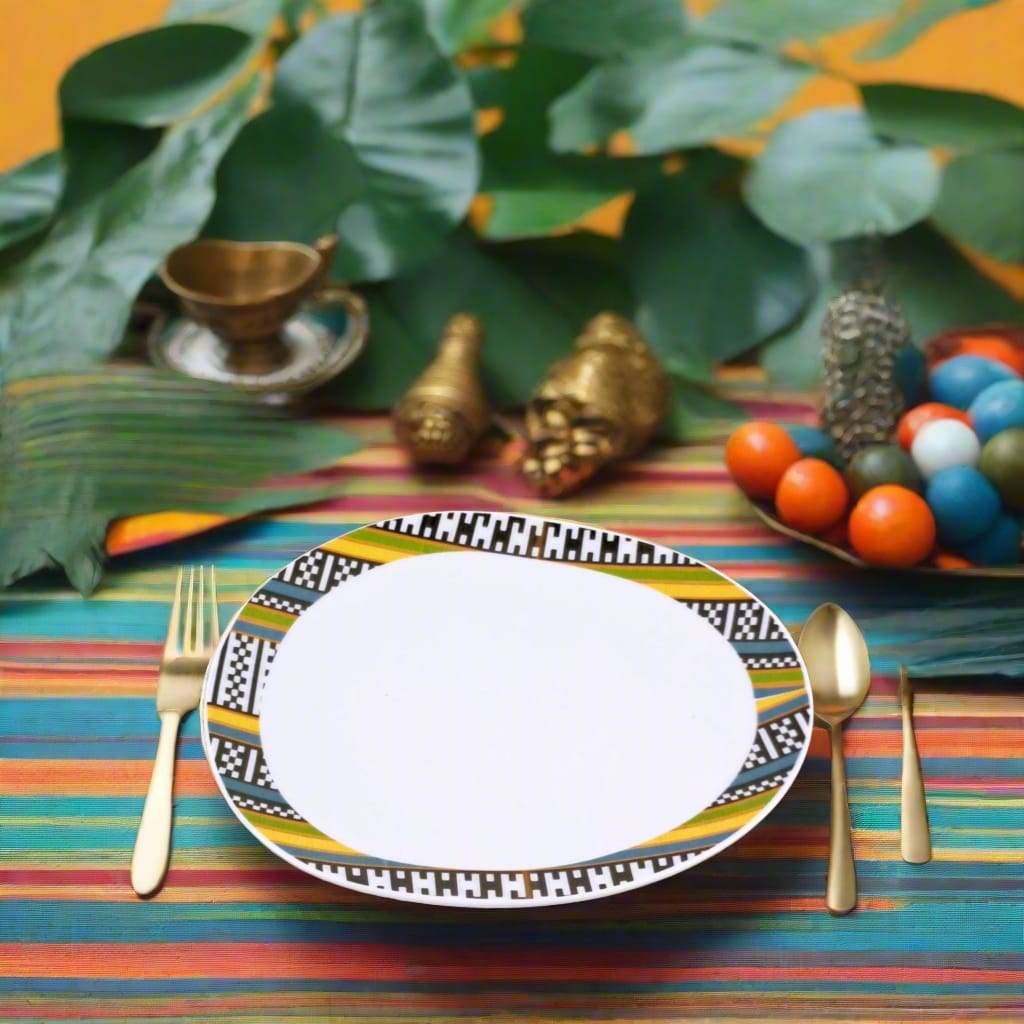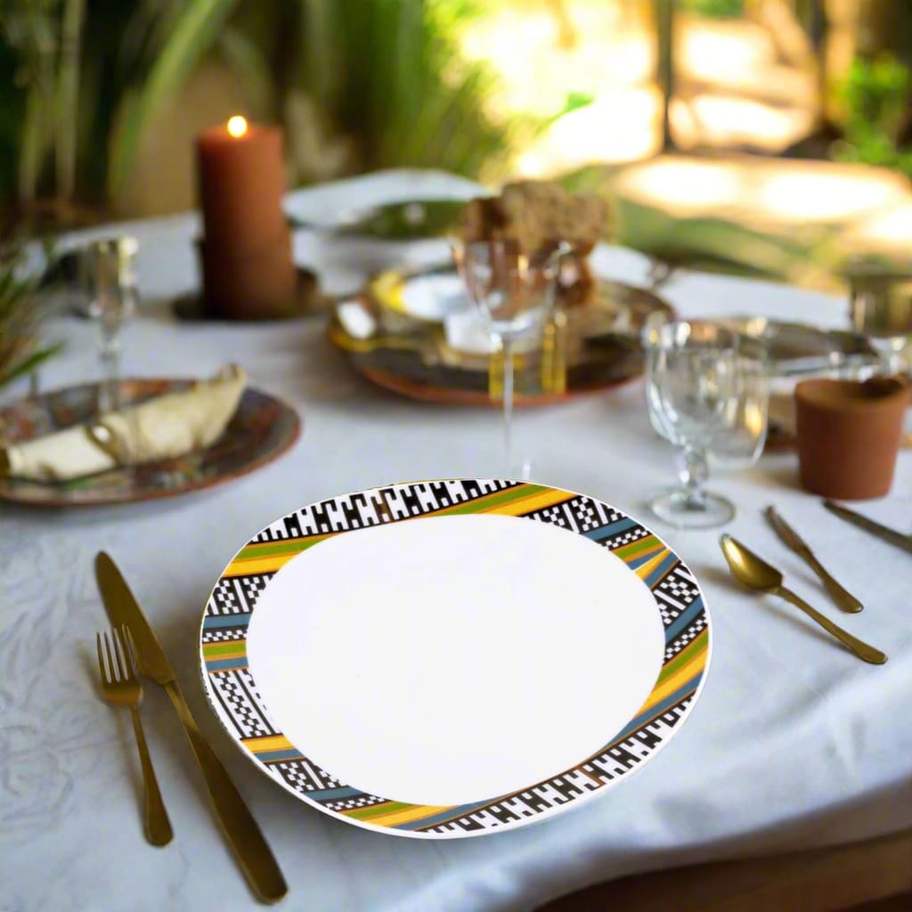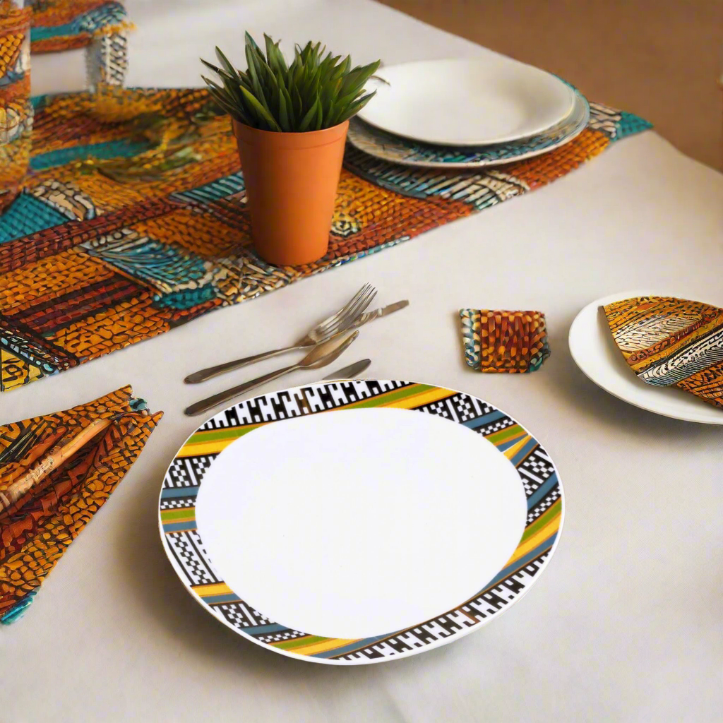 Ce motif intense et intrigant, souvent associé au regard symbolique que l’on porte sur l’autre, puise dans les traditions narratives du textile WAX. “Œil de ma Rivale” exprime à la fois vigilance, confiance en soi et affirmation. Avec son graphisme circulaire puissant, il transforme chaque assiette en objet de conversation, tout en faisant rayonner la richesse du patrimoine africain à travers l’art de la table.