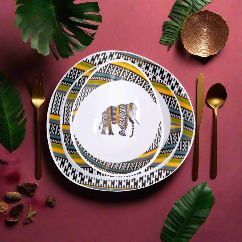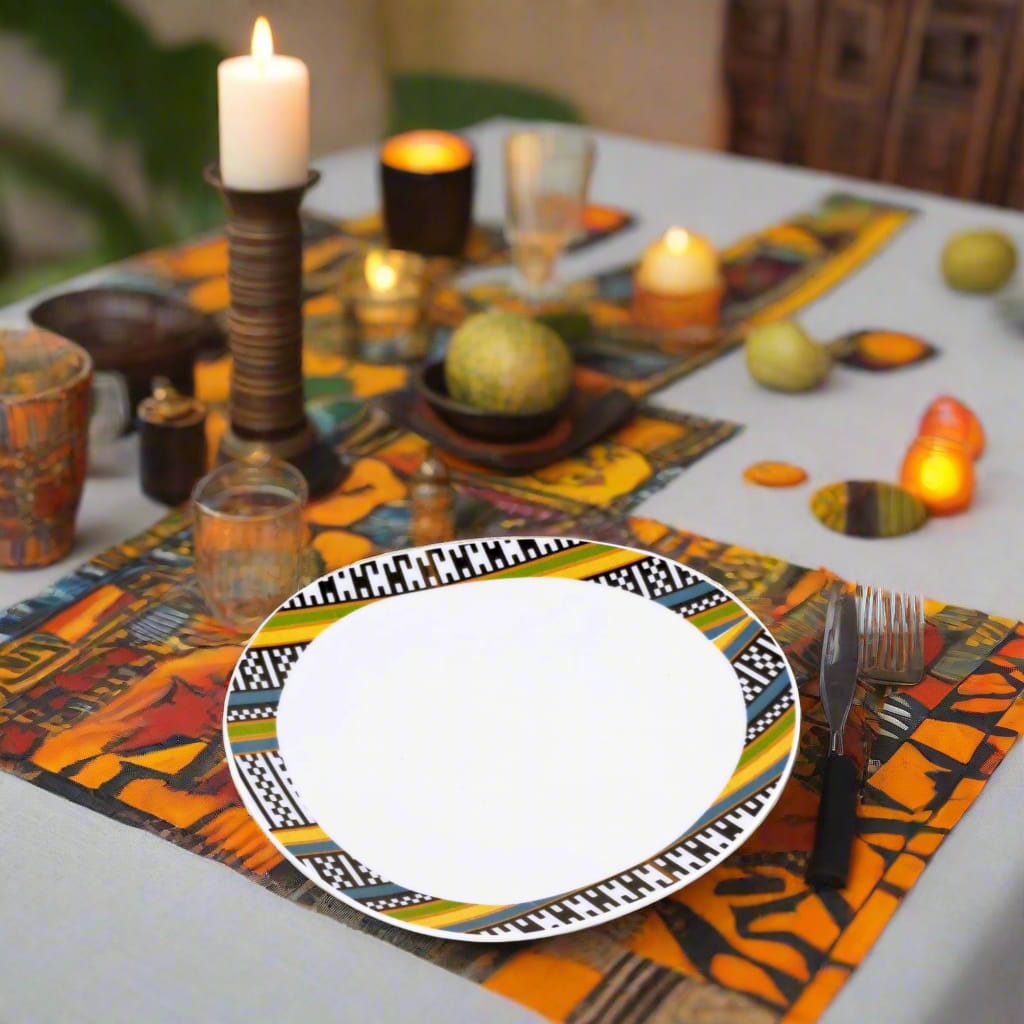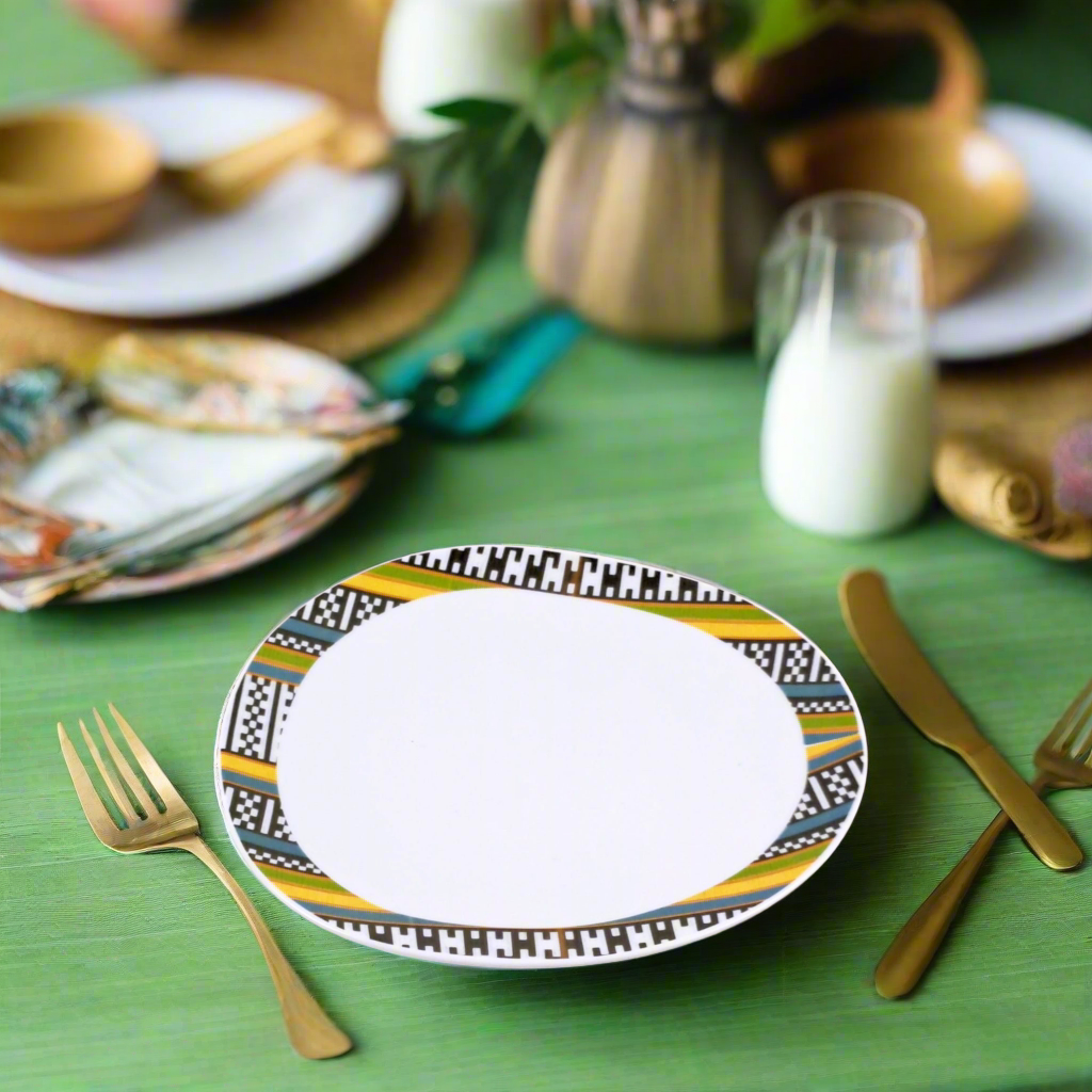 Ce motif intense et intrigant, souvent associé au regard symbolique que l’on porte sur l’autre, puise dans les traditions narratives du textile WAX. “Œil de ma Rivale” exprime à la fois vigilance, confiance en soi et affirmation. Avec son graphisme circulaire puissant, il transforme chaque assiette en objet de conversation, tout en faisant rayonner la richesse du patrimoine africain à travers l’art de la table.