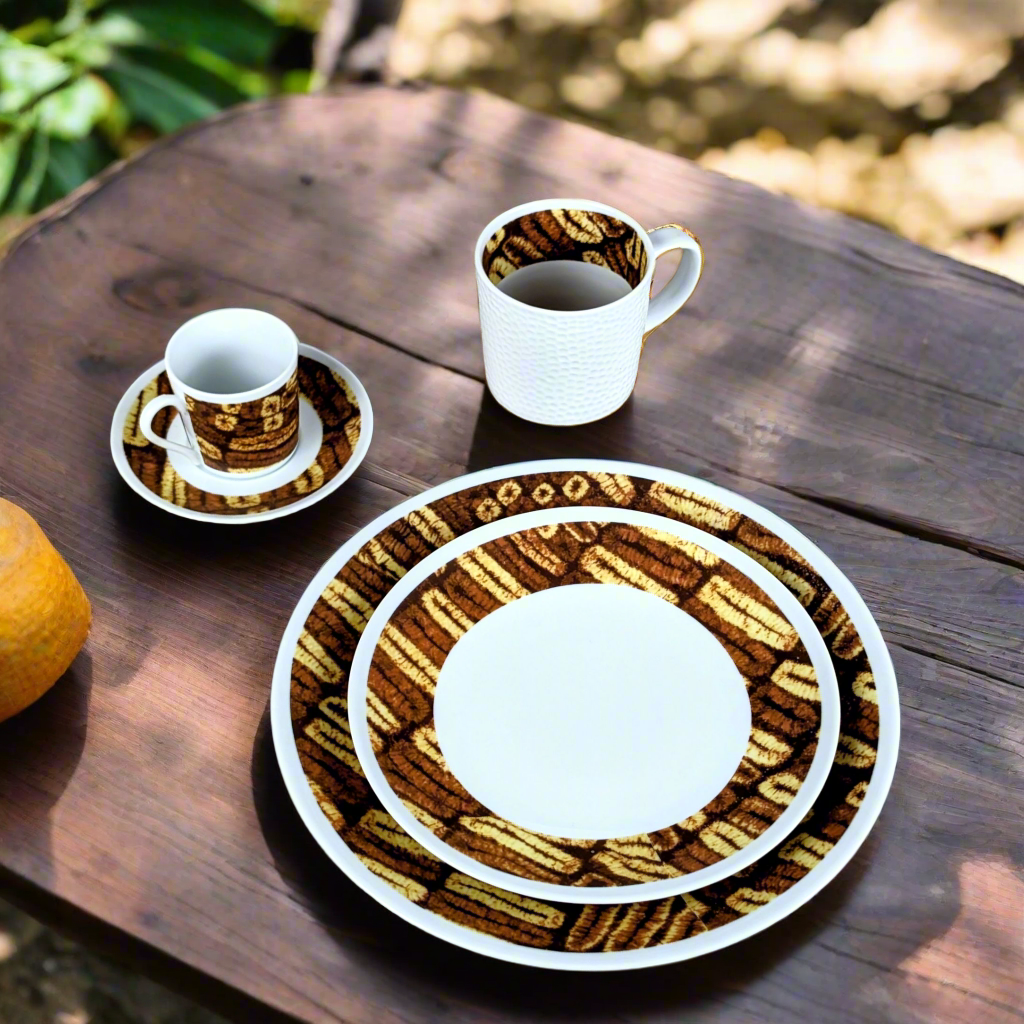 Ce service de table en porcelaine fine française célèbre cette esthétique en encadrant chaque pièce d’un motif en anneau, appliqué avec précision pour sublimer la présentation des mets tout en honorant l’héritage visuel africain.