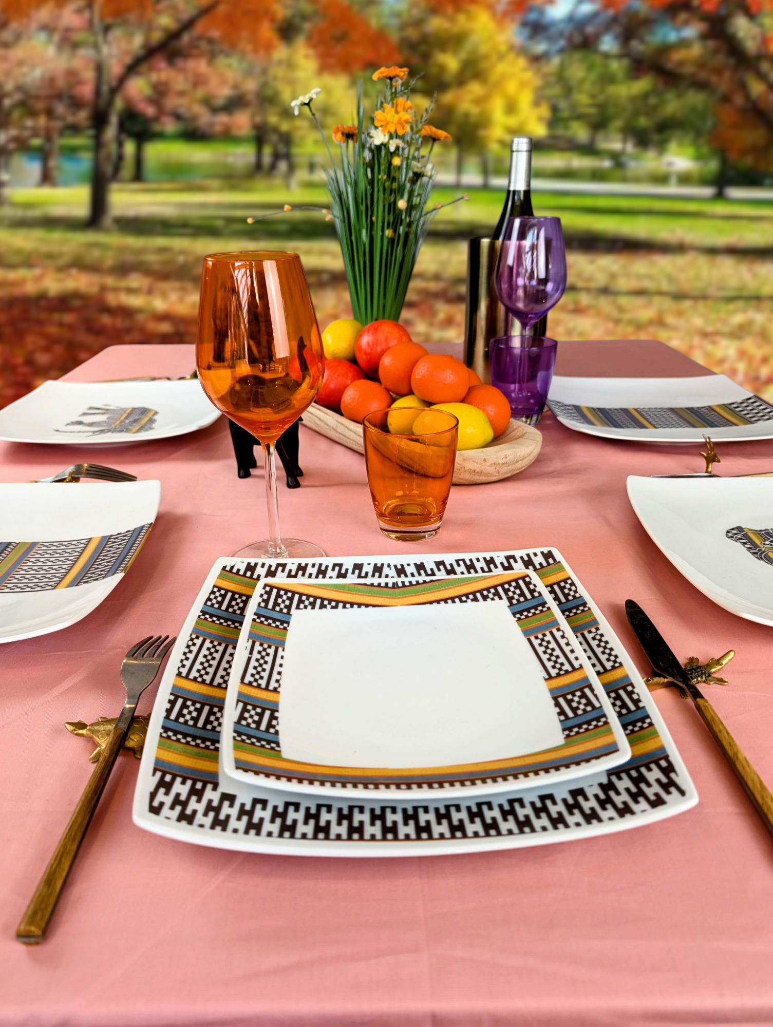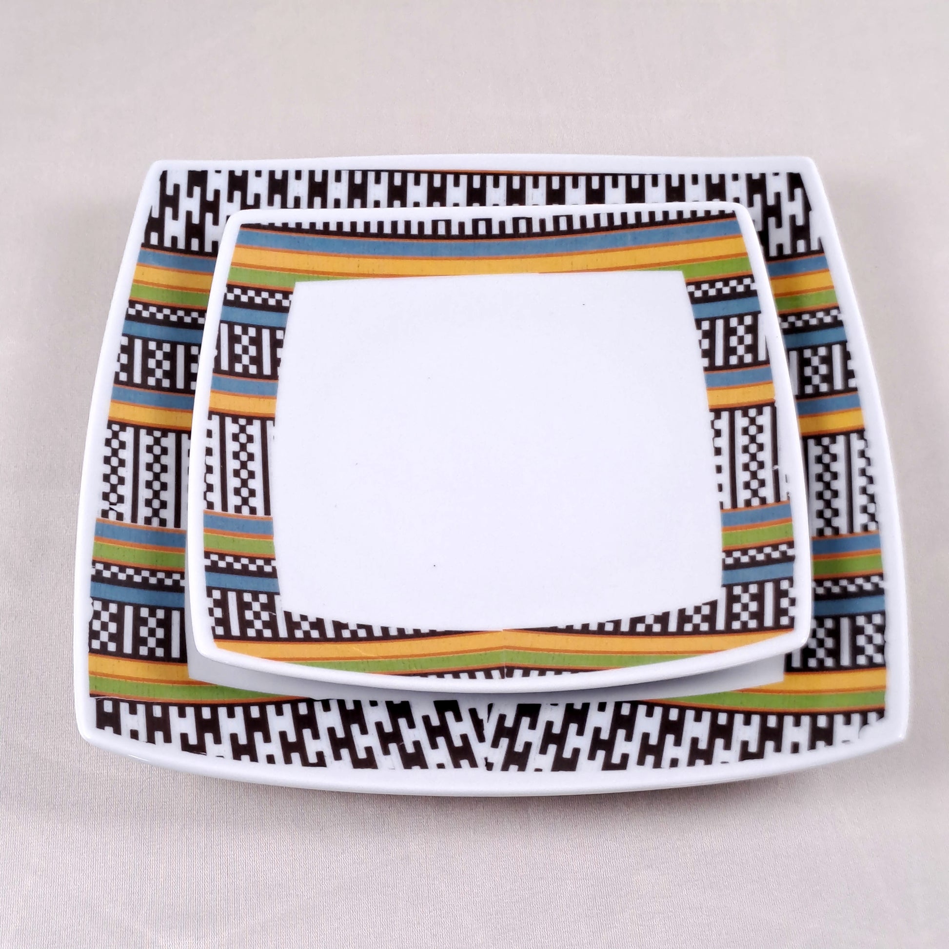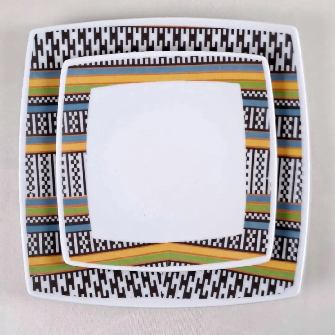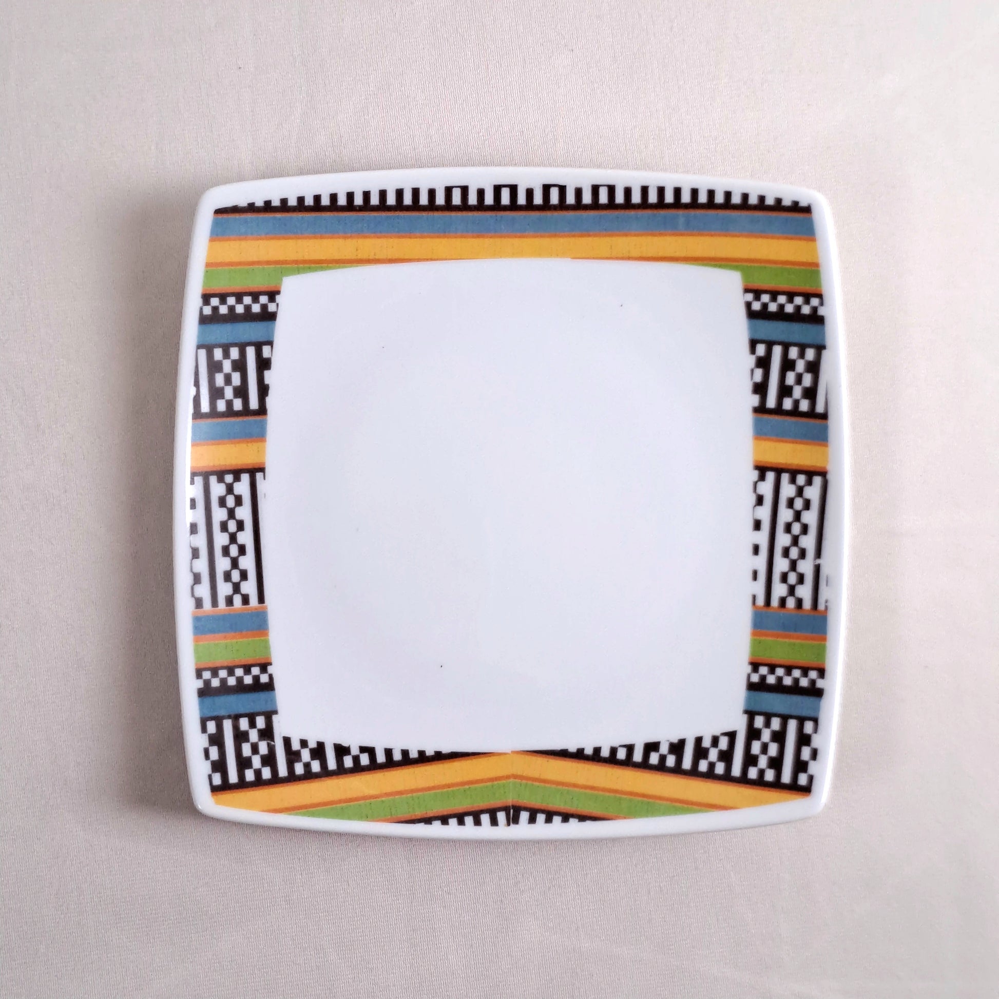 ### **Coffret de 6 Assiettes Carrées en Porcelaine Fine – Motif "Kounta" ou "Kanta" du Niger**