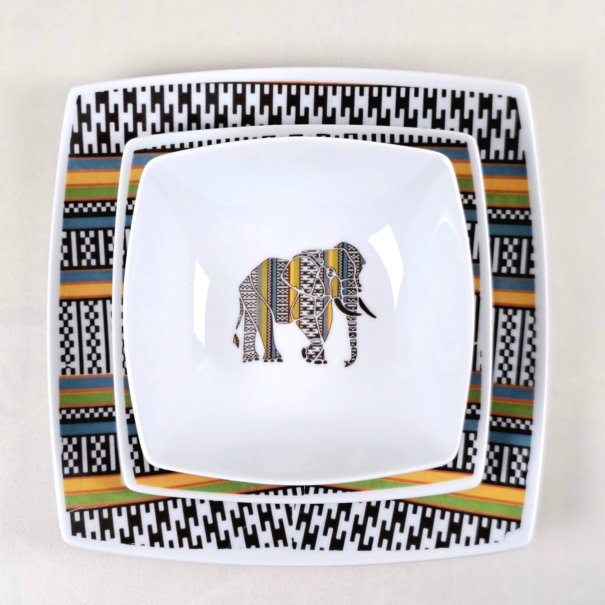 Coffret d'assiettes carrées en porcelaine fine Française fabriquées à la demande avec motif anneau ethnique d'Afrique éléphant "Kounta" ou "Kanta" du Niger, présenté dans un coffret de 6 assiettes