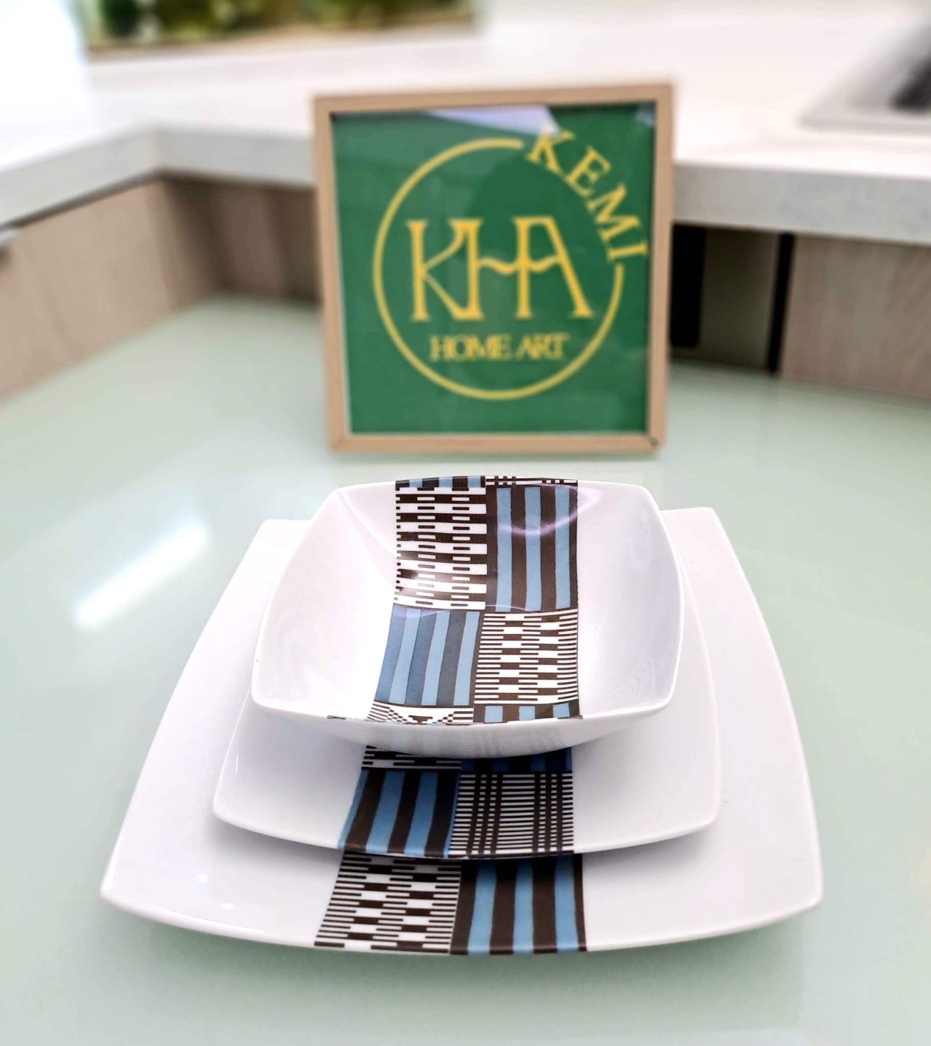 Coffret d'assiettes carrées en porcelaine fine Française fabriquées à la demande avec motif bande ethnique "Kounta" ou "Kanta" bleu du Niger, présenté dans un coffret de 6 assiettes