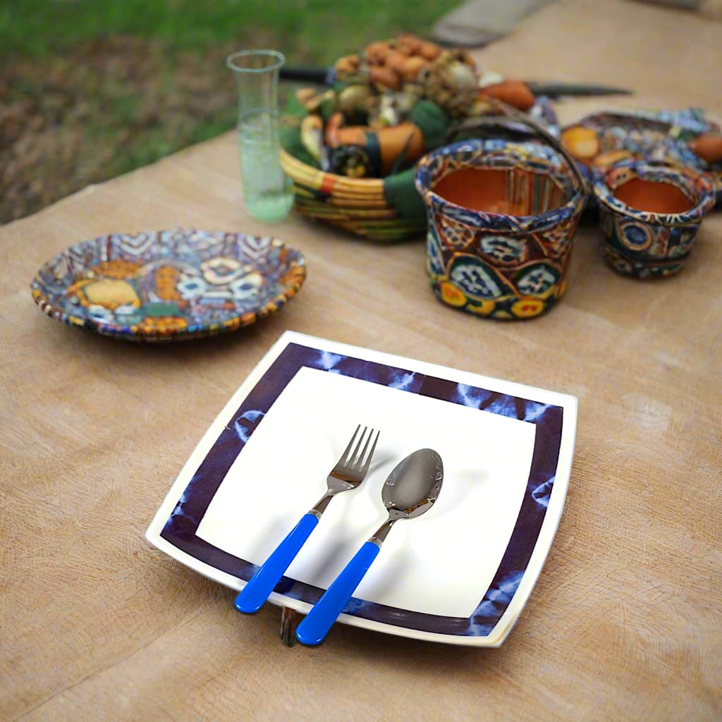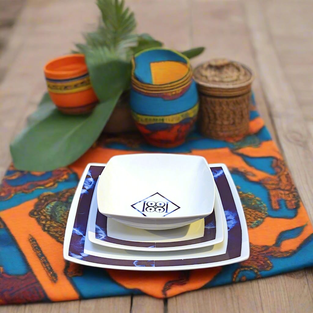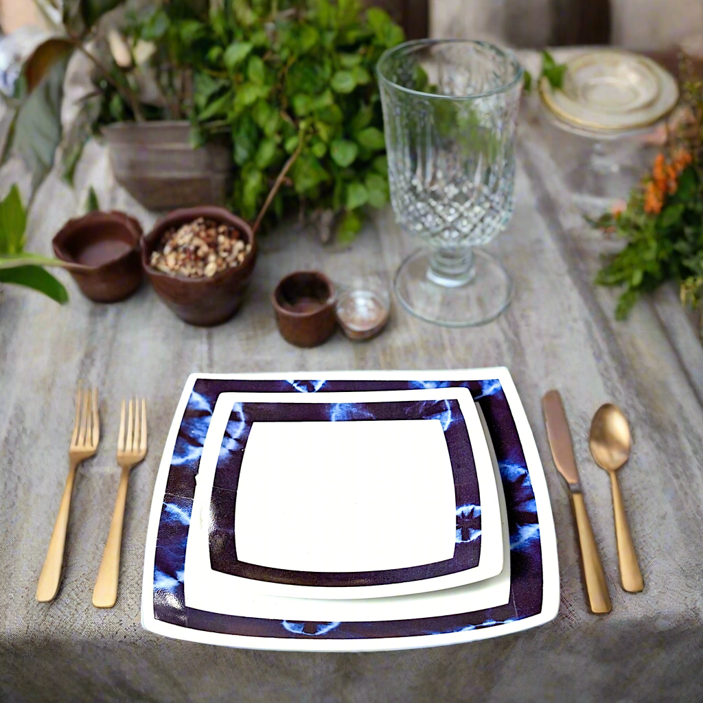 Coffret d'assiettes carrées en porcelaine fine Française fabriquées à la demande avec motif ethnique d'Afrique bleu nuit " Indigo", présenté dans un coffret de 6 assiettes