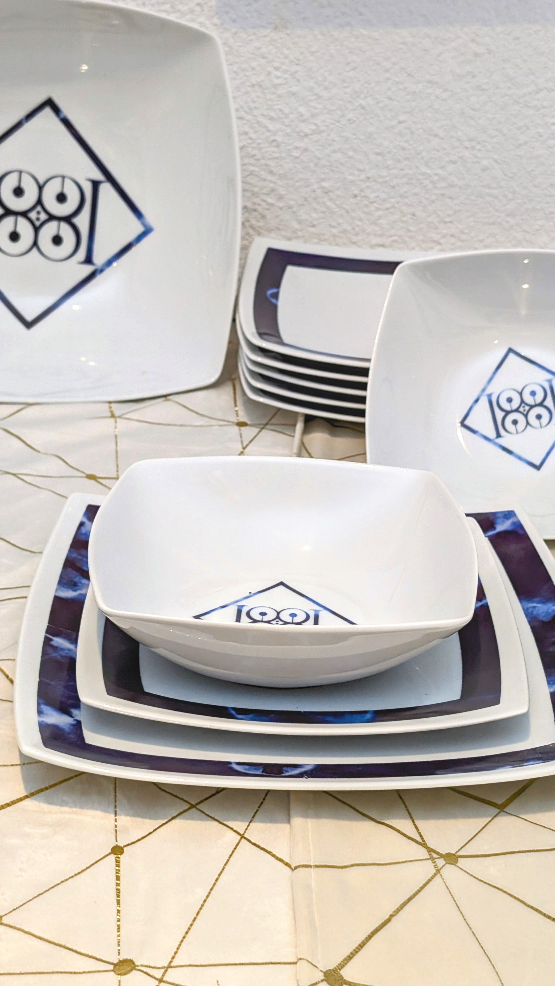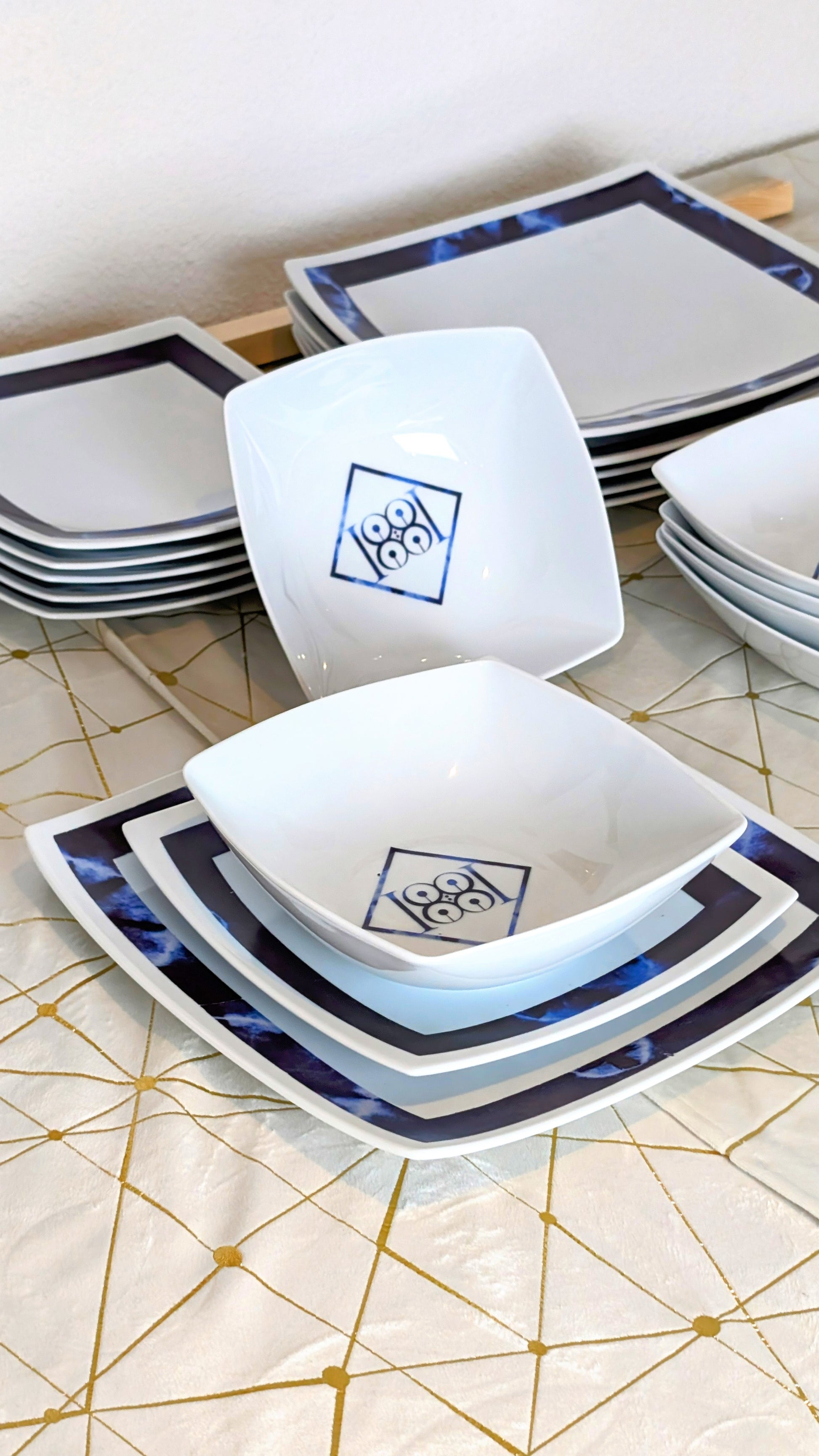 ### **Coffret de 6 Assiettes Carrées en Porcelaine Fine – Motif "Indigo Bleu Nuit"**