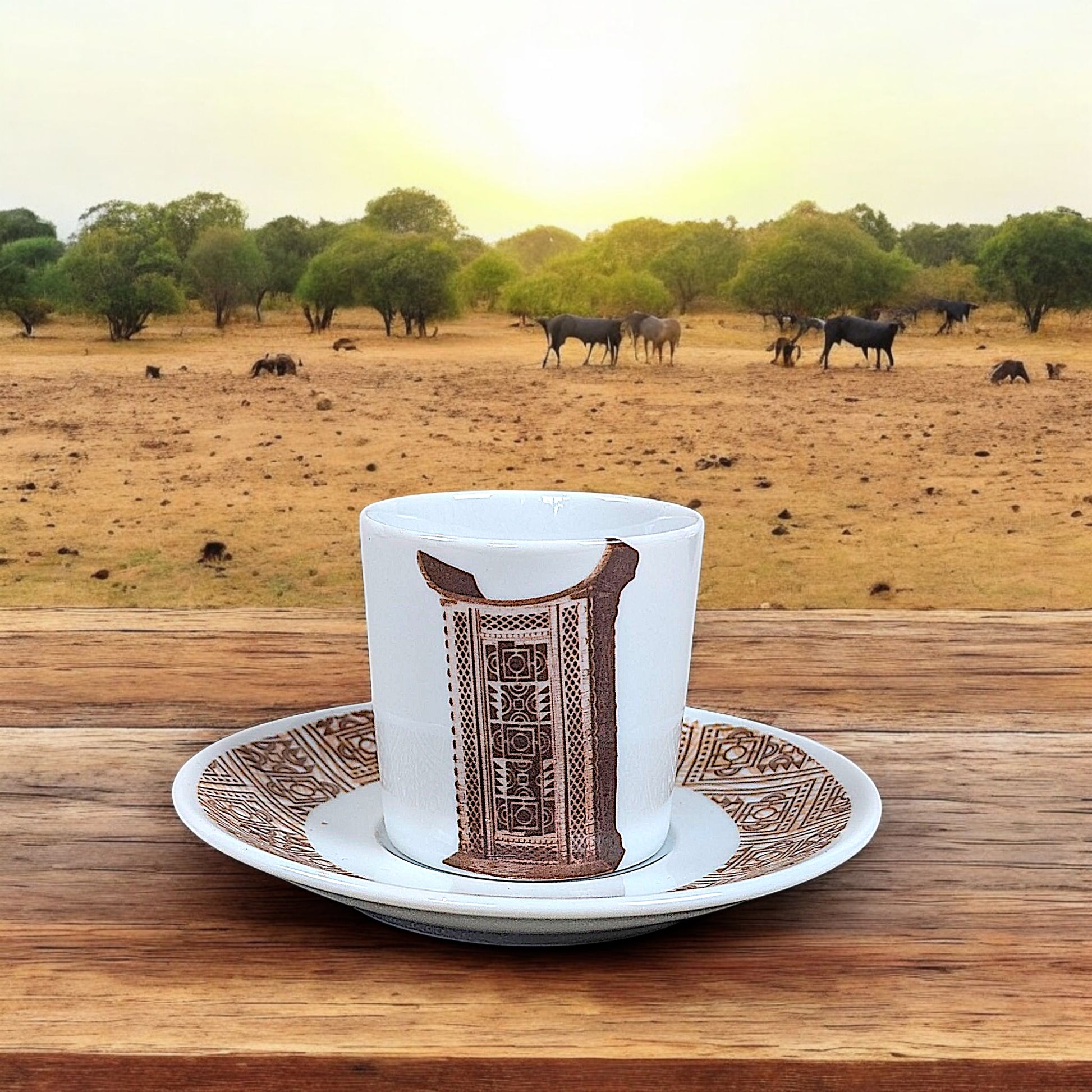 Coffret prestige spécial Bénin – 6 tasses en porcelaine fine française, ornées de motifs inspirés de l’histoire du Bénin