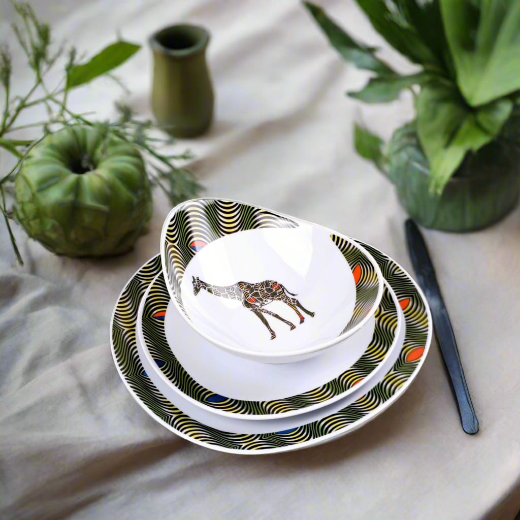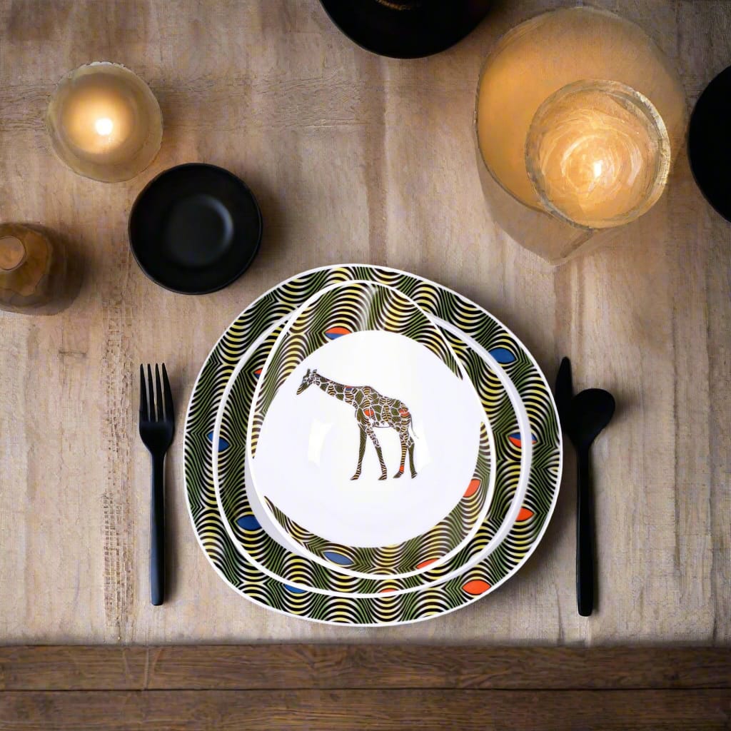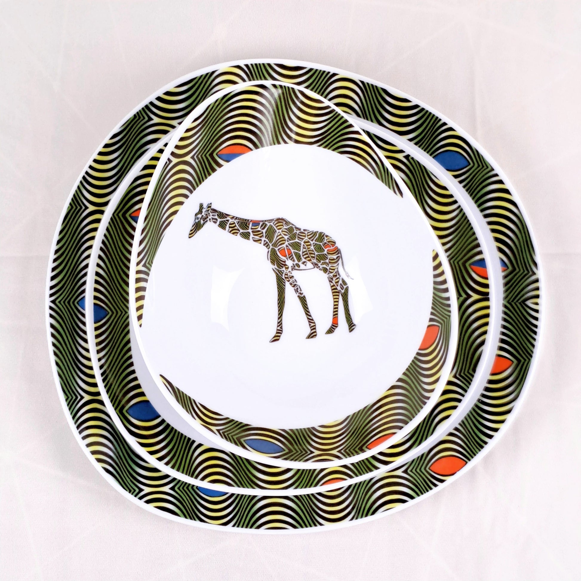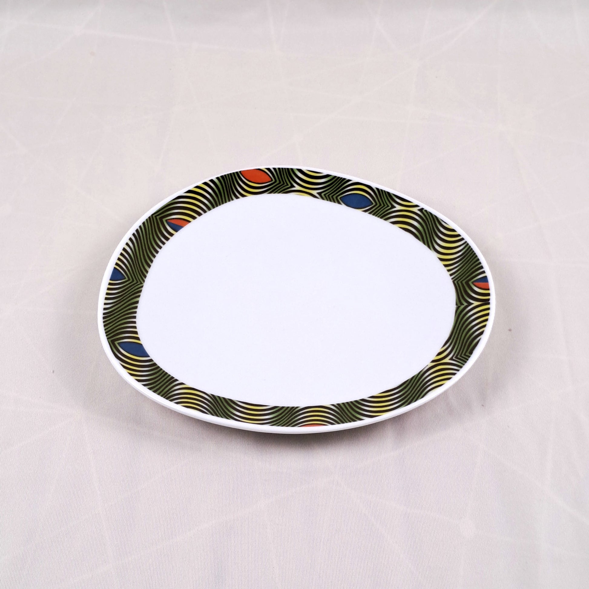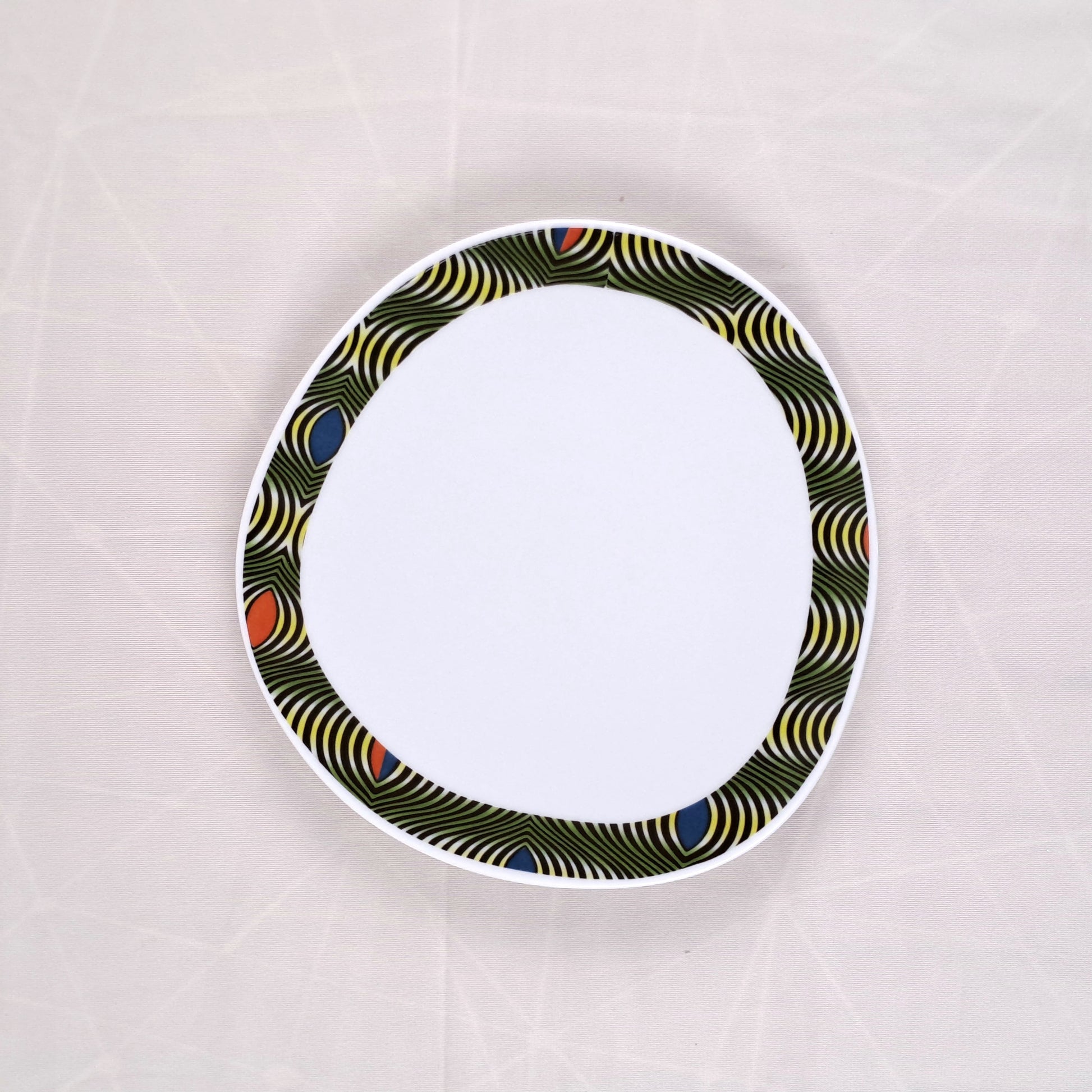 Ce motif intense et intrigant, souvent associé au regard symbolique que l’on porte sur l’autre, puise dans les traditions narratives du textile WAX. “Œil de ma Rivale” exprime à la fois vigilance, confiance en soi et affirmation. Avec son graphisme circulaire puissant, il transforme chaque assiette en objet de conversation, tout en faisant rayonner la richesse du patrimoine africain à travers l’art de la table.