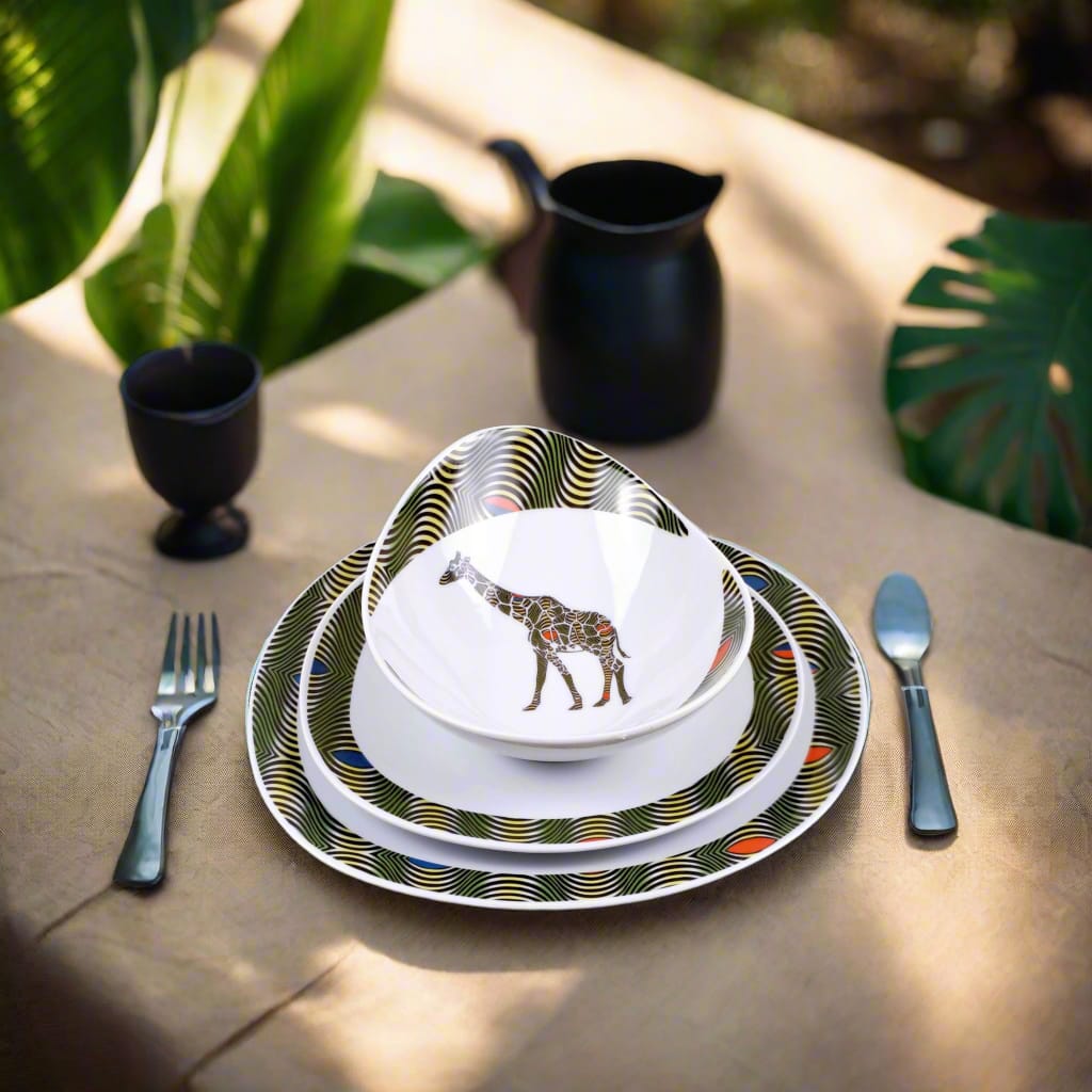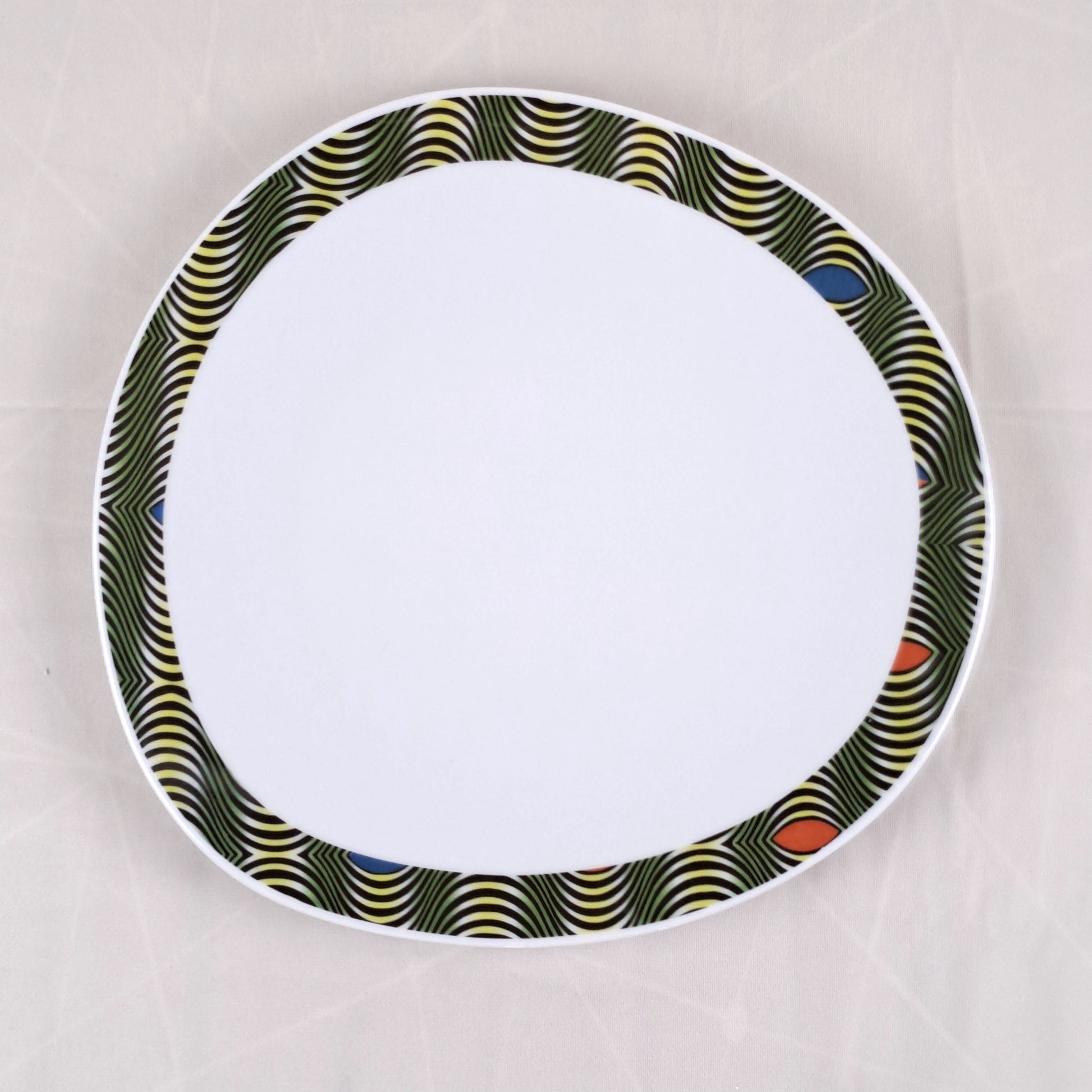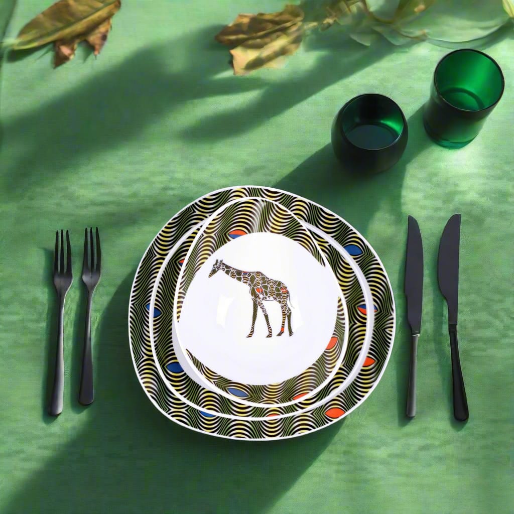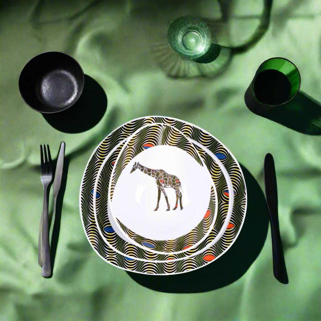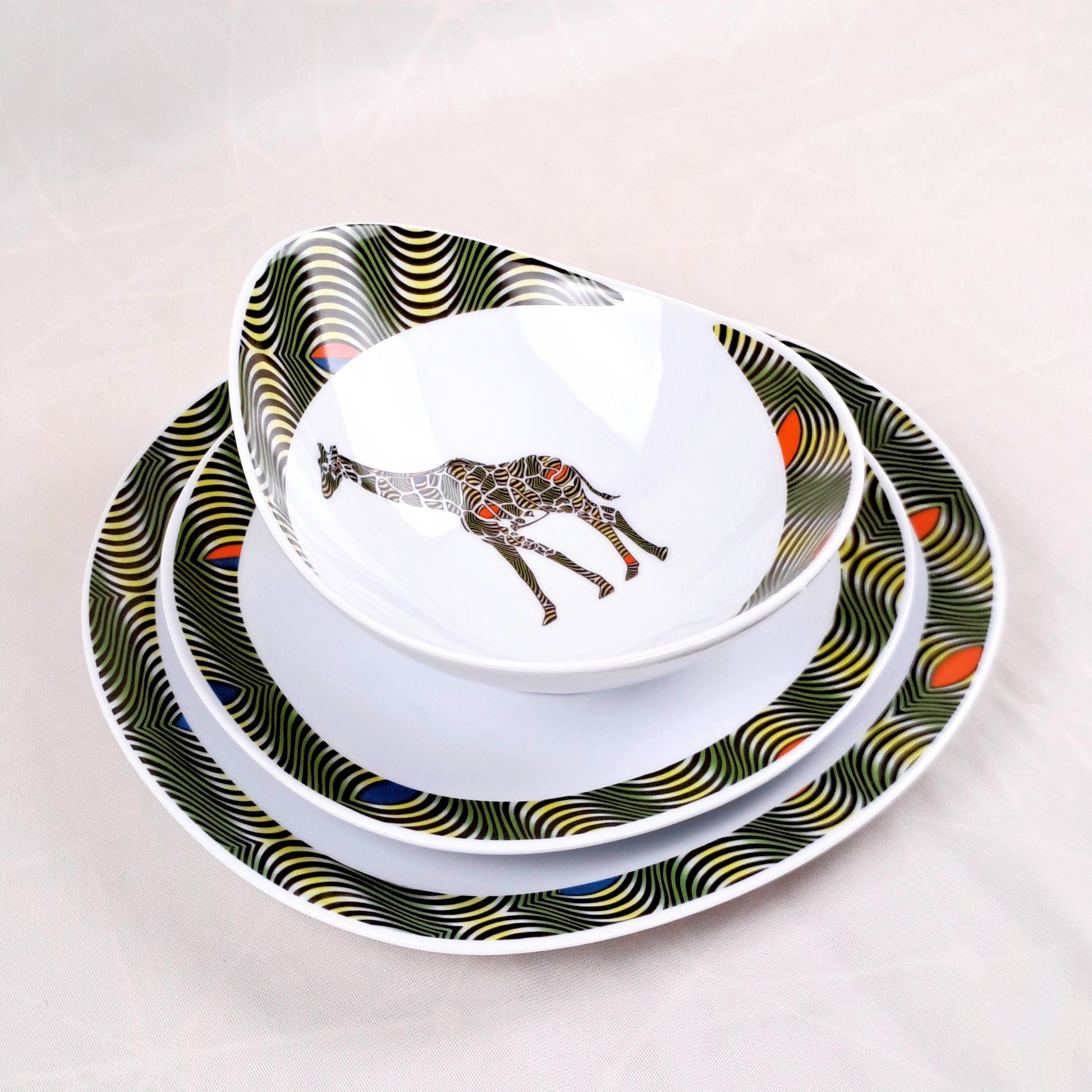 Ce motif intense et intrigant, souvent associé au regard symbolique que l’on porte sur l’autre, puise dans les traditions narratives du textile WAX. “Œil de ma Rivale” exprime à la fois vigilance, confiance en soi et affirmation. Avec son graphisme circulaire puissant, il transforme chaque assiette en objet de conversation, tout en faisant rayonner la richesse du patrimoine africain à travers l’art de la table.