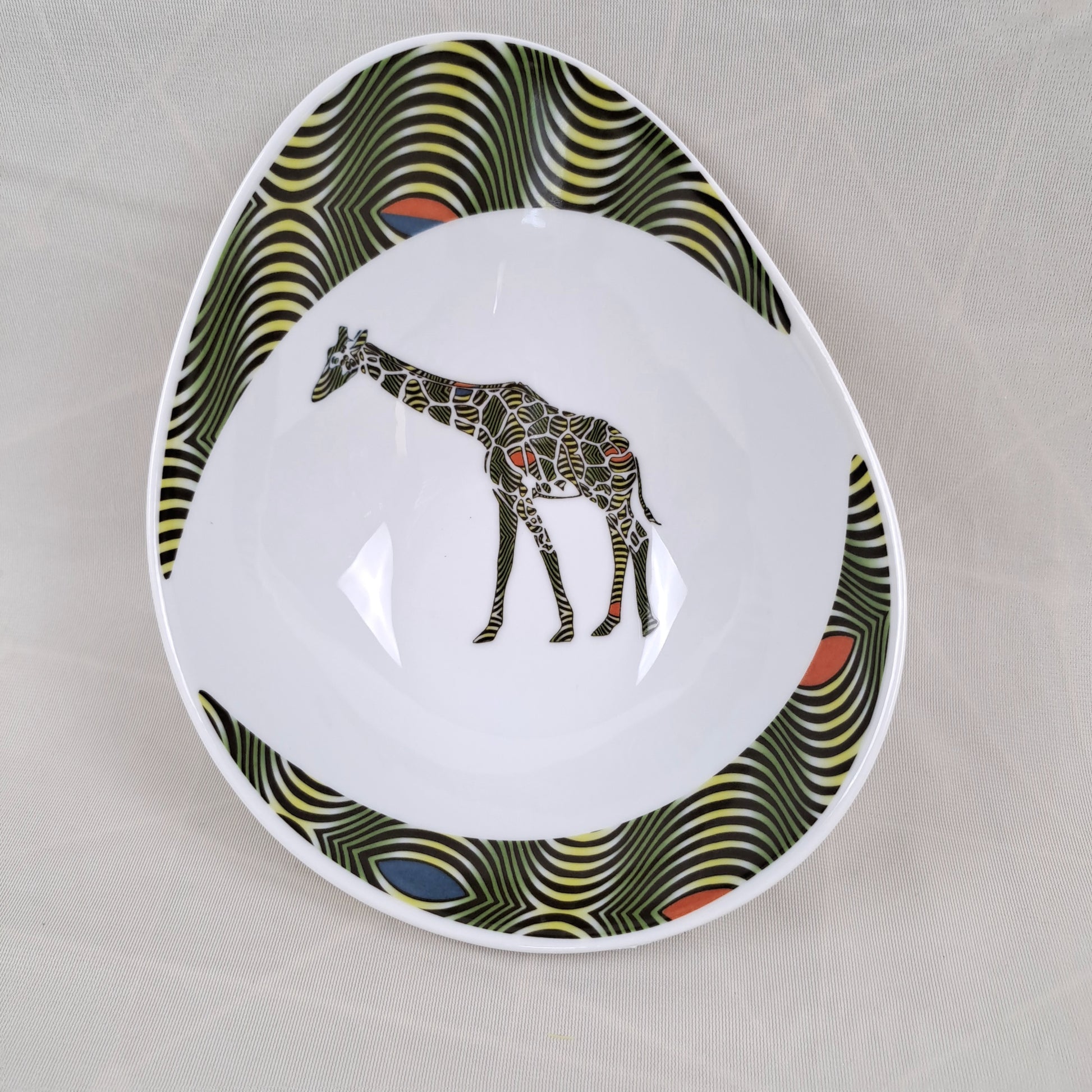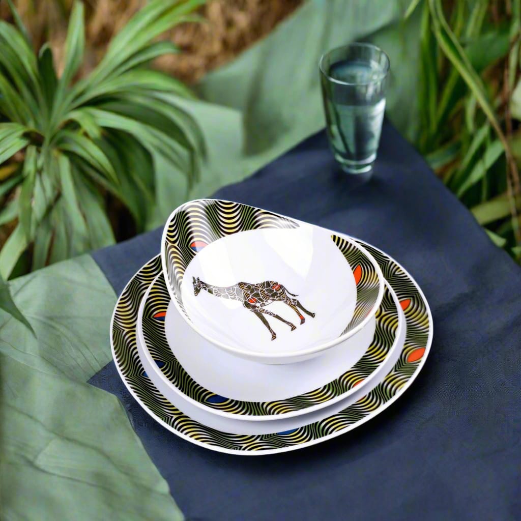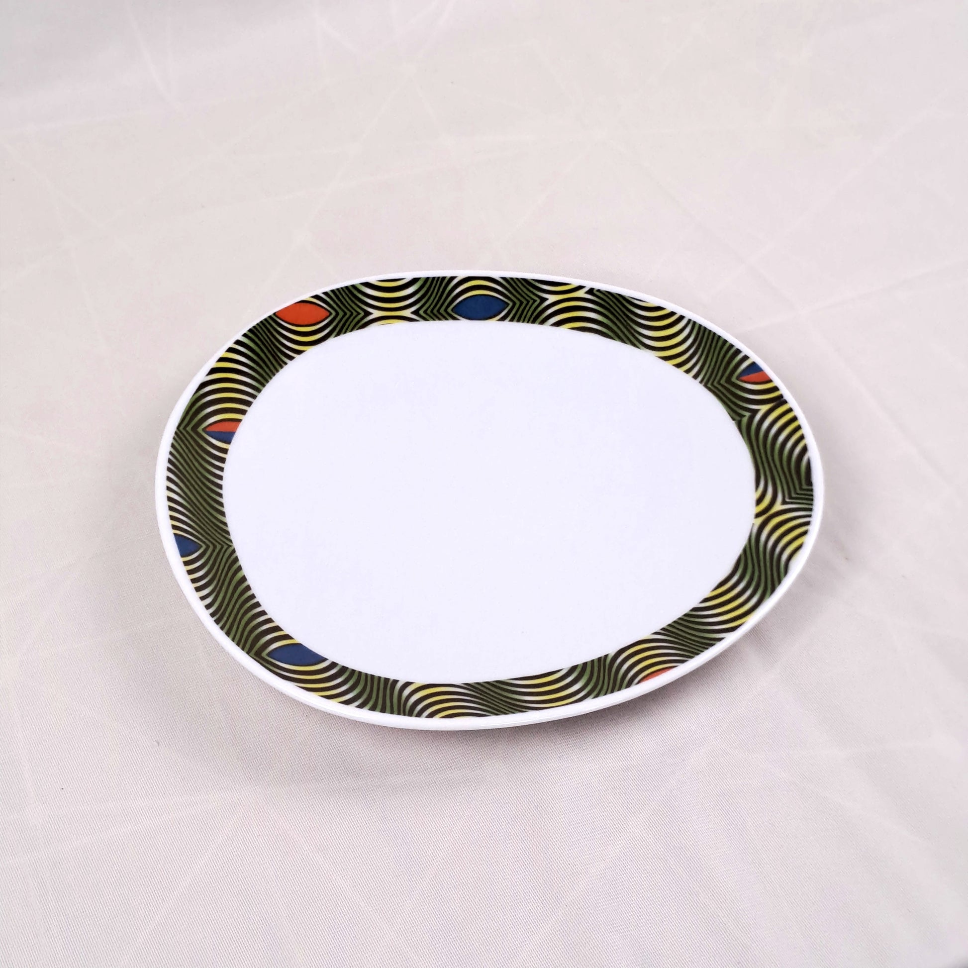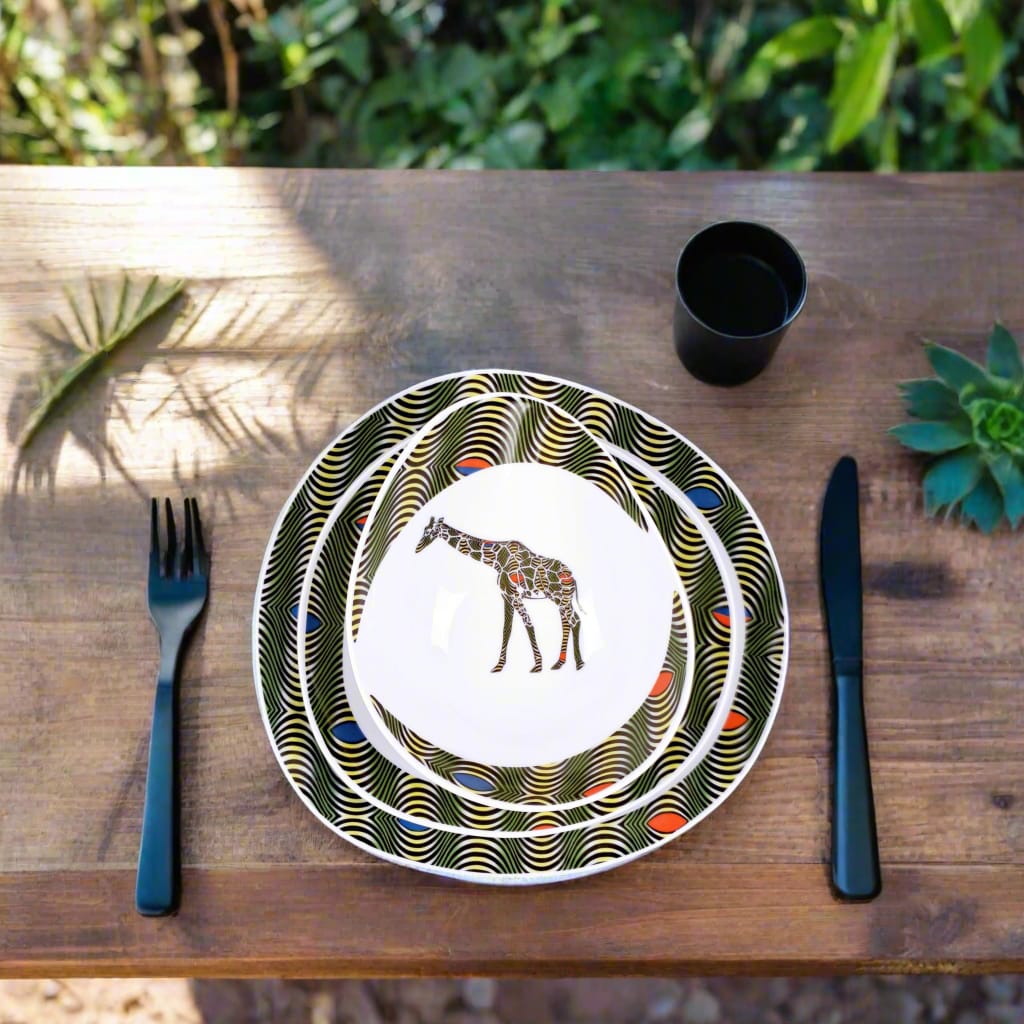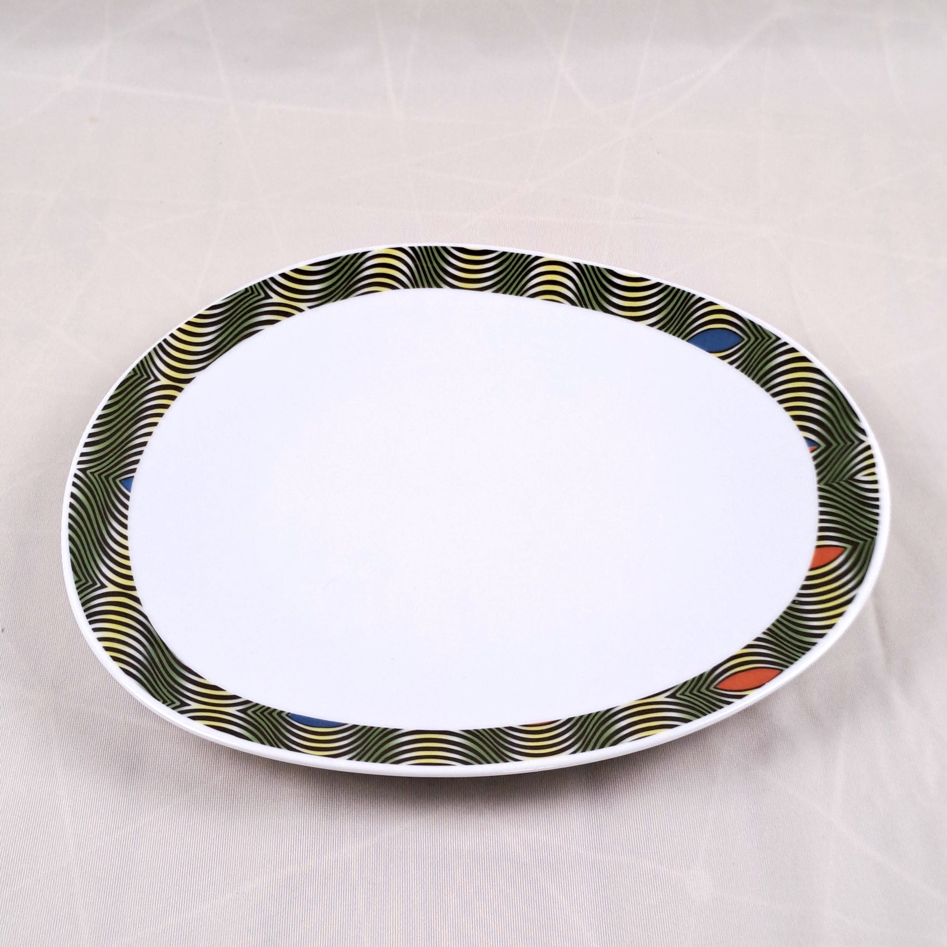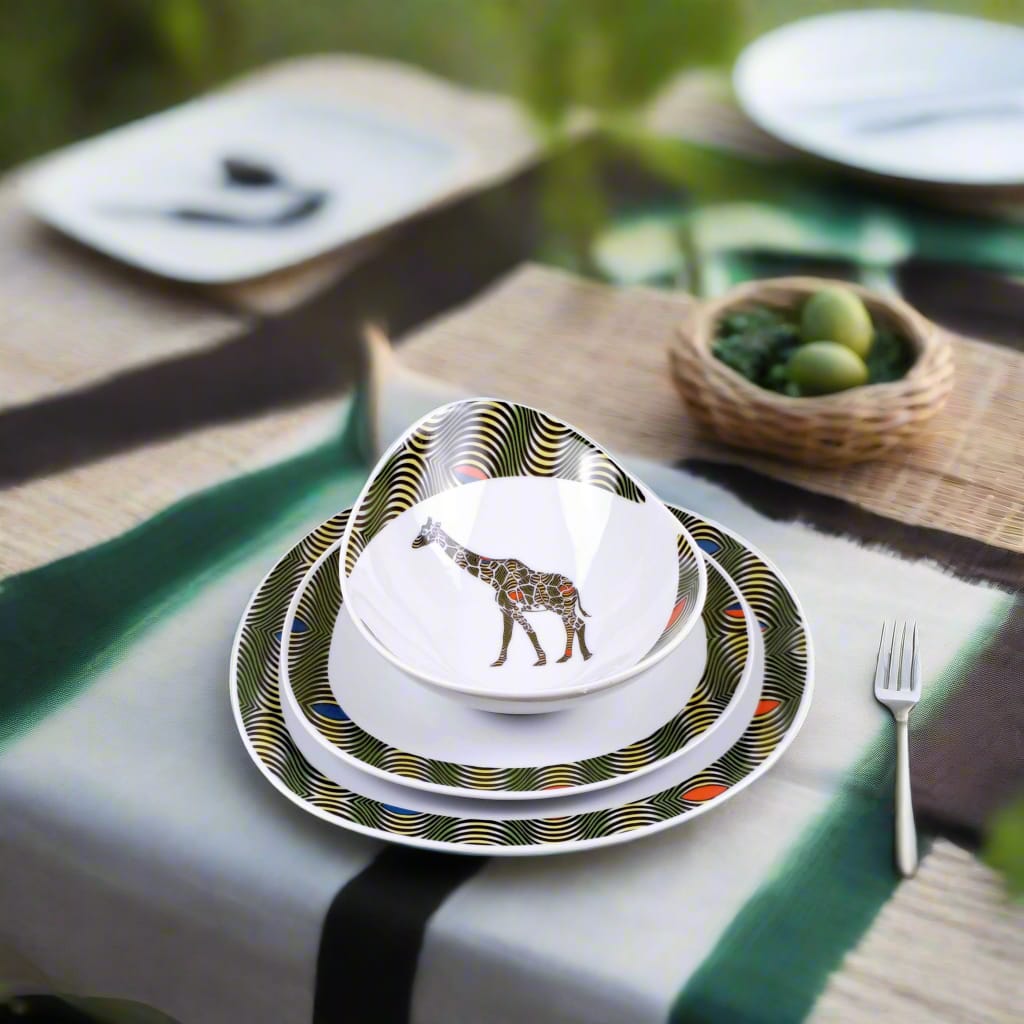 Ce motif intense et intrigant, souvent associé au regard symbolique que l’on porte sur l’autre, puise dans les traditions narratives du textile WAX. “Œil de ma Rivale” exprime à la fois vigilance, confiance en soi et affirmation. Avec son graphisme circulaire puissant, il transforme chaque assiette en objet de conversation, tout en faisant rayonner la richesse du patrimoine africain à travers l’art de la table.