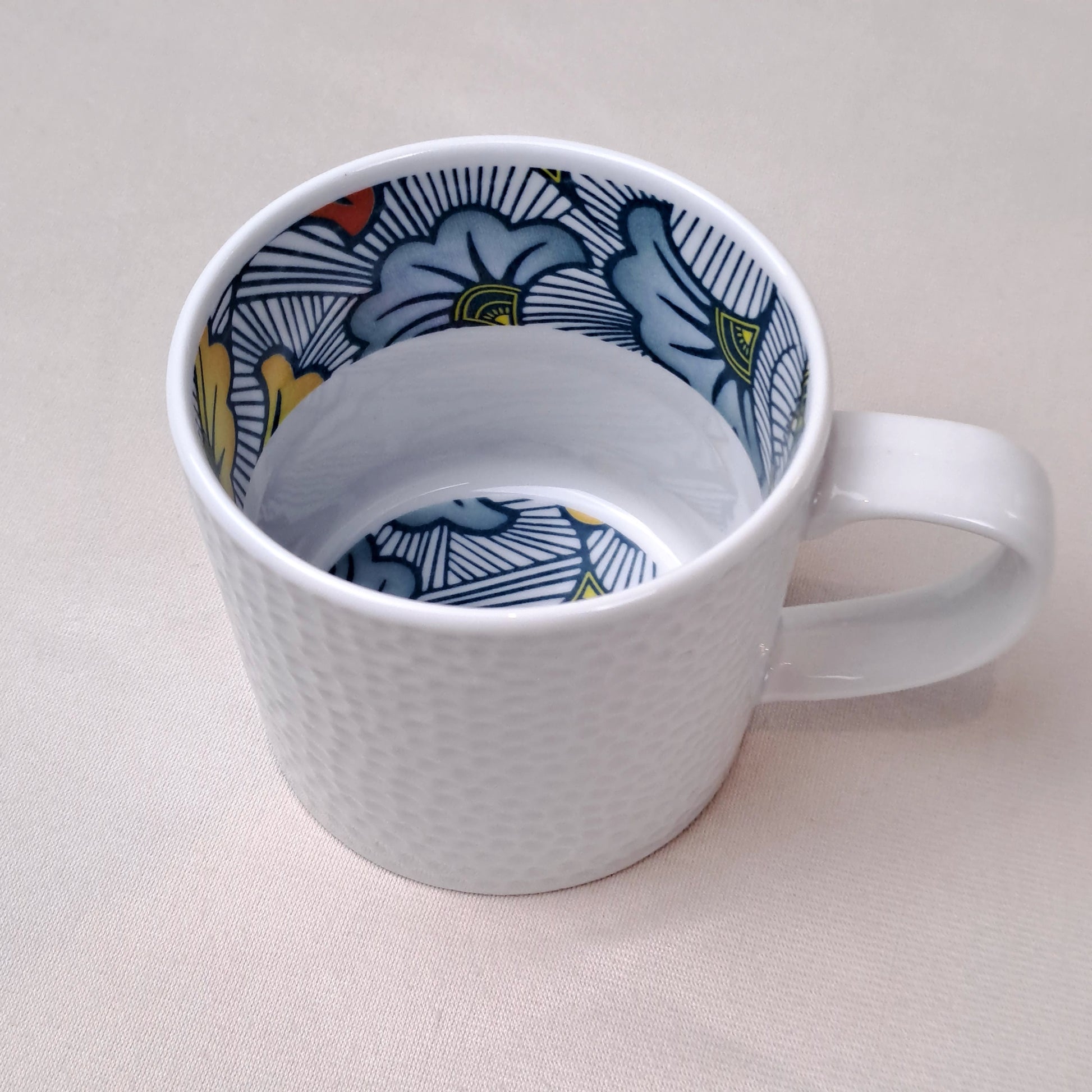 Mug en porcelaine fine Française grenaillé à l'extérieur, motif wax d'Afrique "Fleurs de Mariage" à l'intérieur