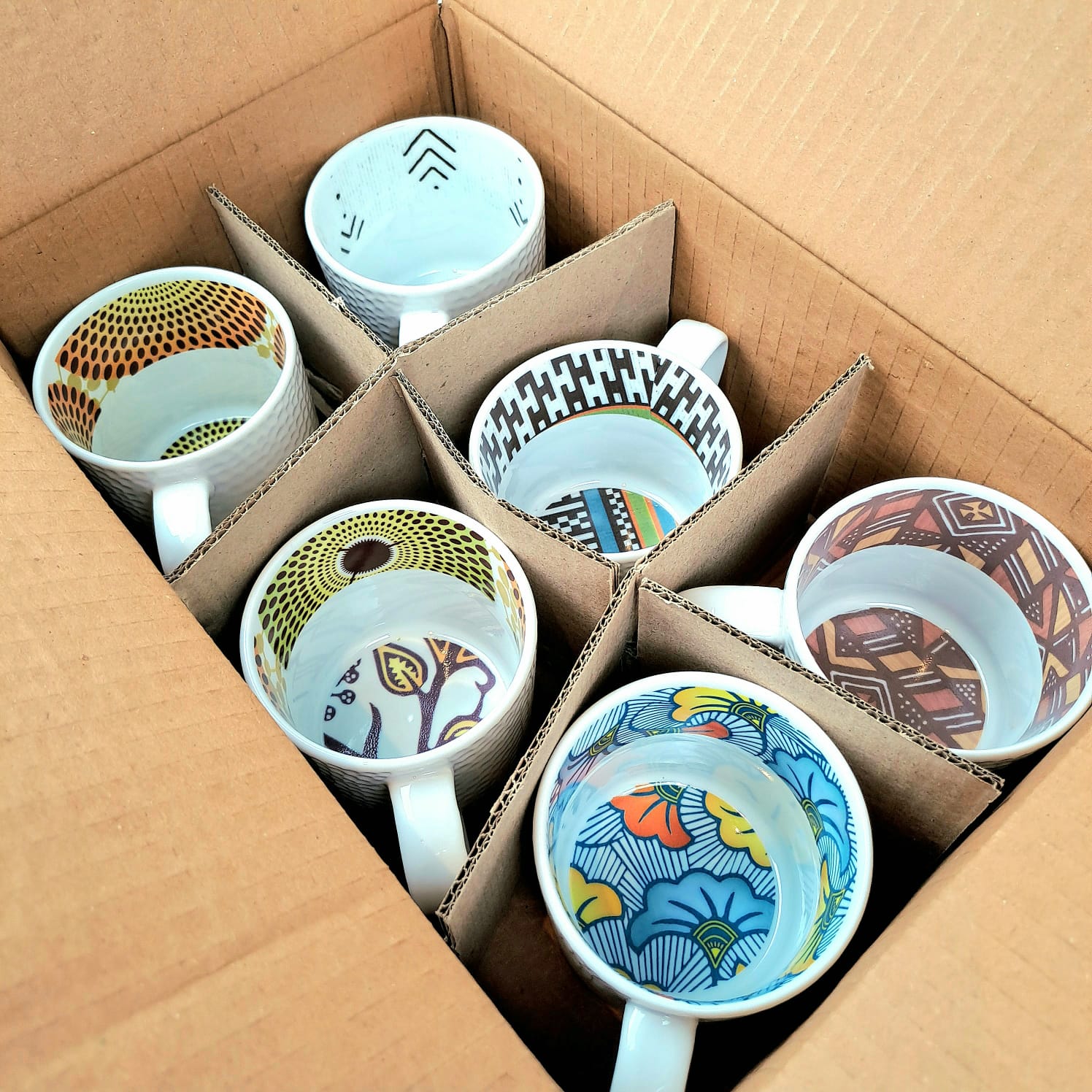 Ce mug en porcelaine fine française allie **modernité et héritage africain**, avec son extérieur grenaillé au toucher raffiné et son intérieur sublimé par le **motif Fleurs de Mariage**, un classique du wax célébrant l’amour et la prospérité.