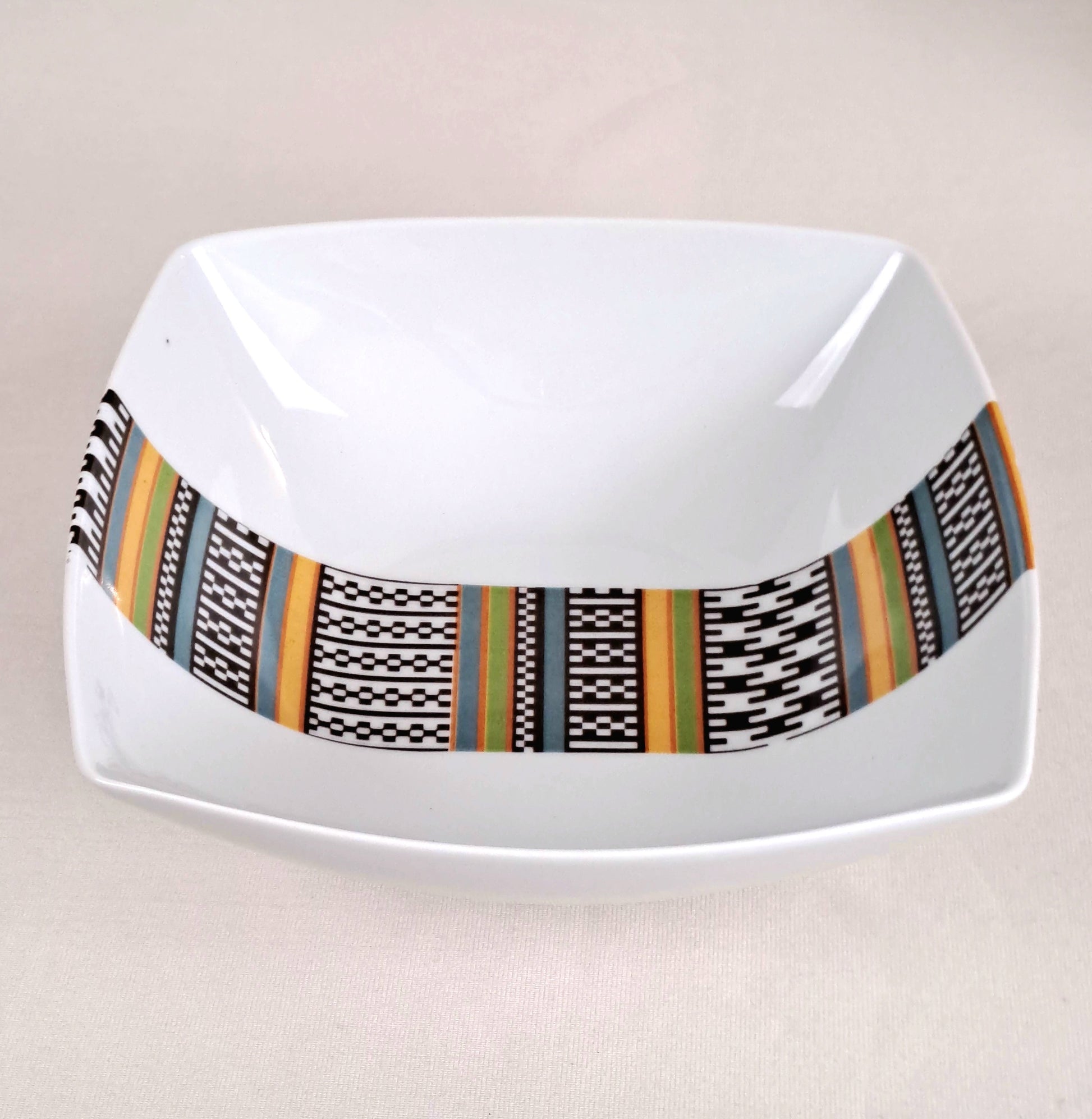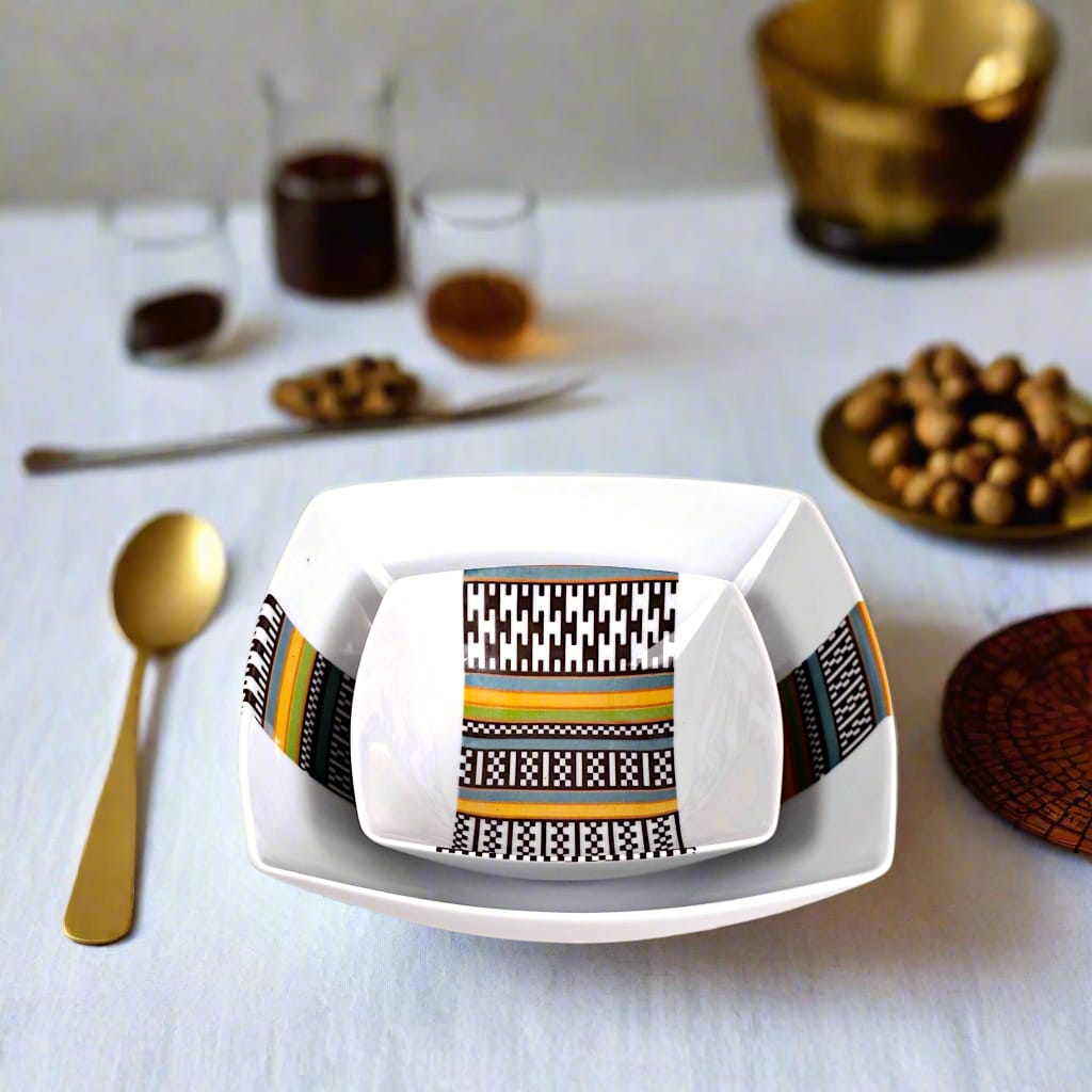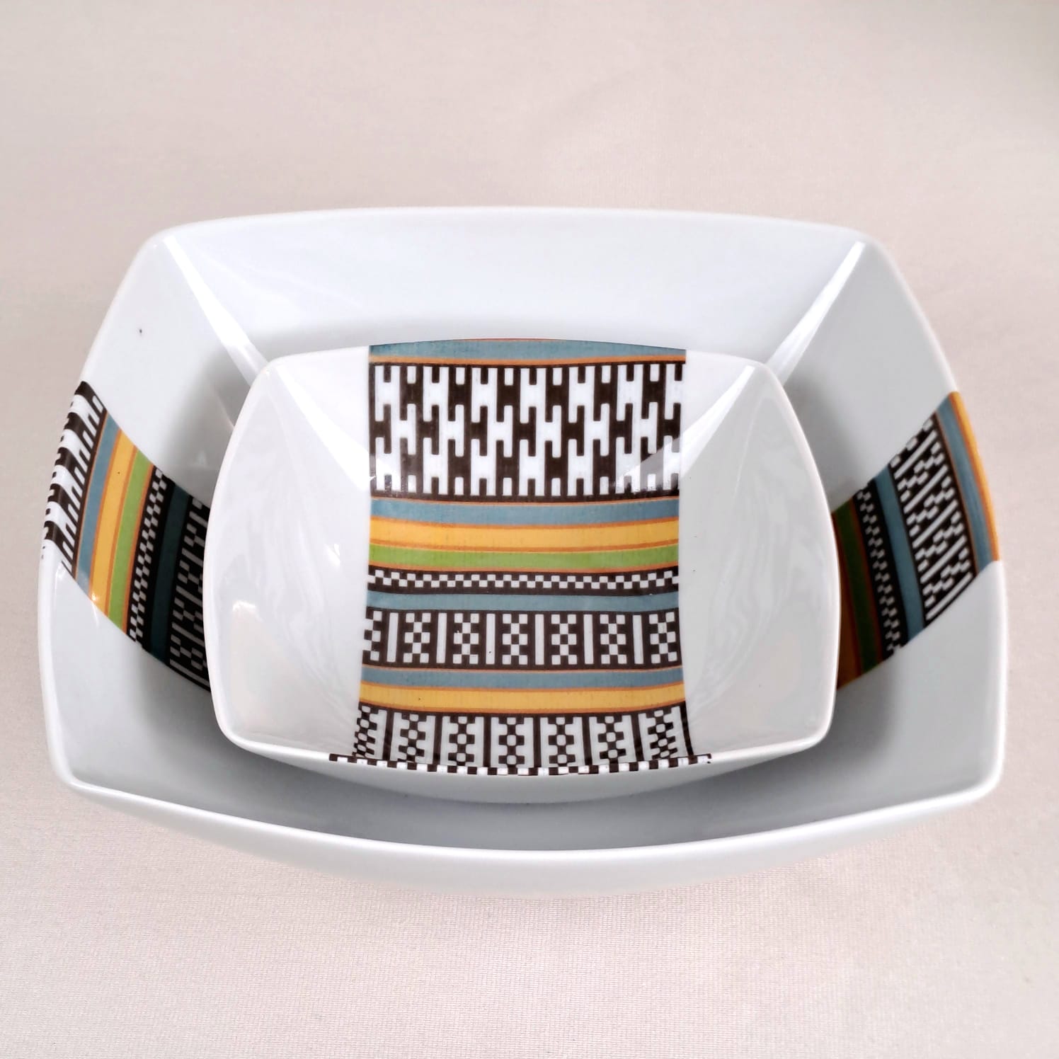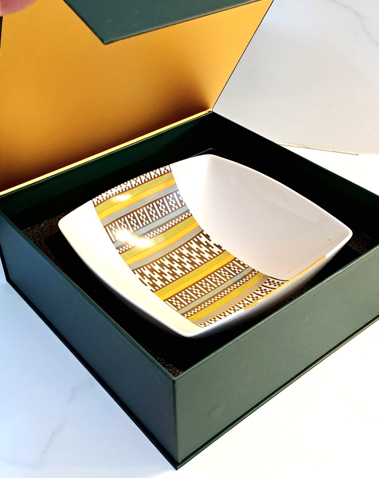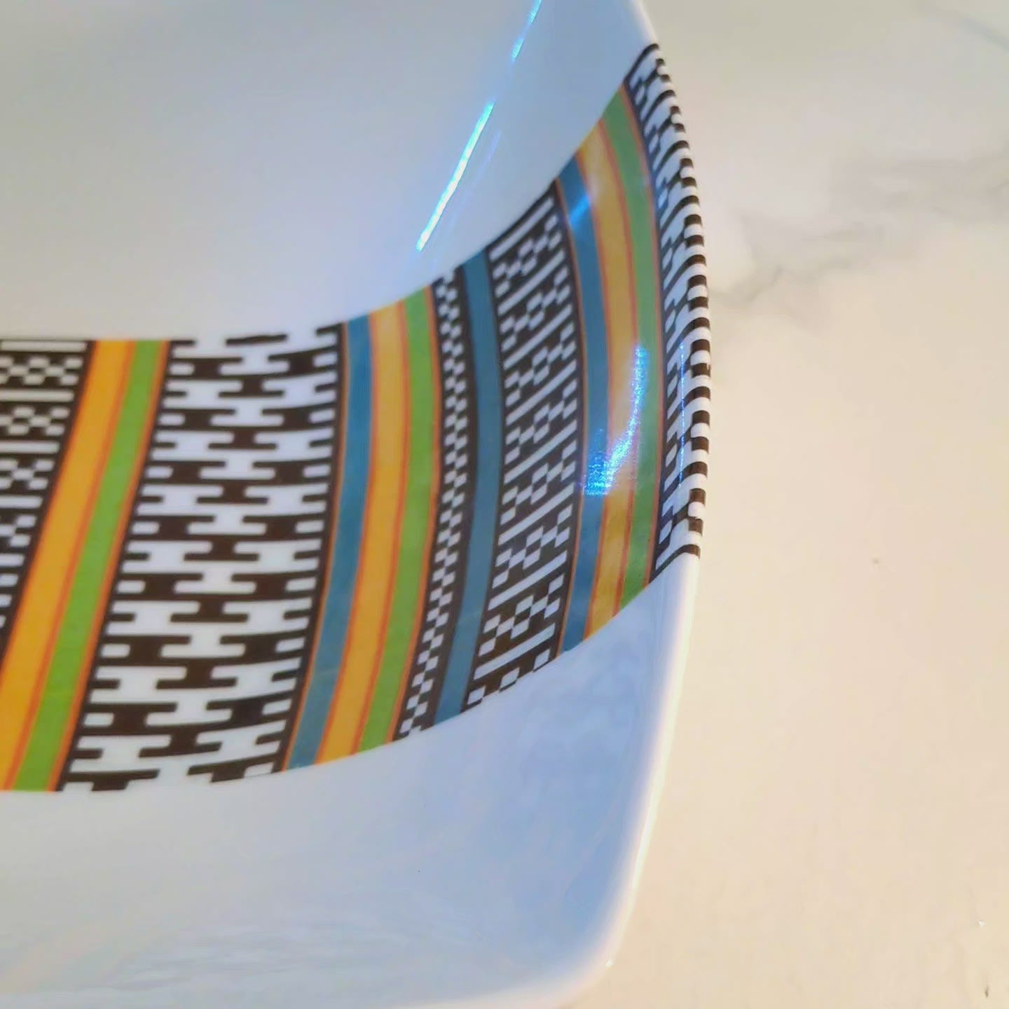 Saladier en porcelaine fine Française fabriquées à la demande motif bande Ethnique d'Afrique "Kanta" du Niger dans coffret