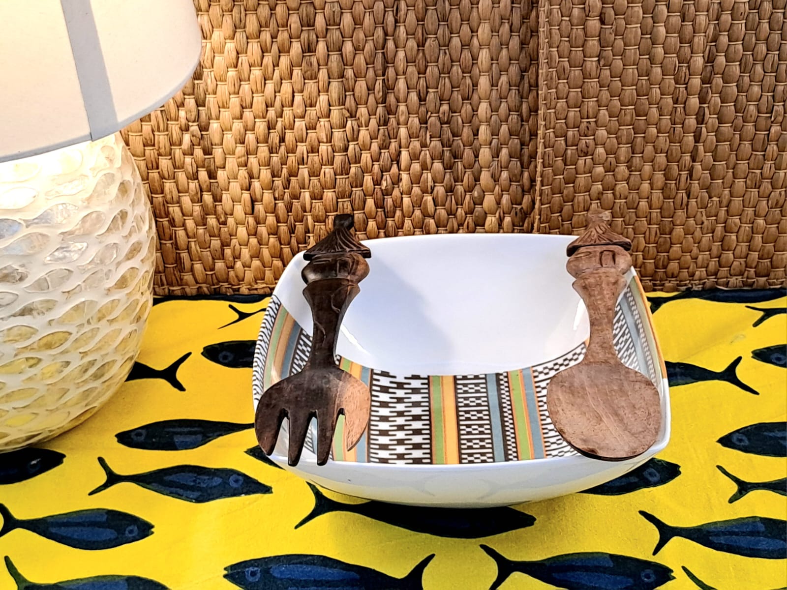 Ajoutez une touche d’authenticité et de tradition africaine à votre table avec ce superbe saladier en porcelaine fine française, inspiré du motif **Kanta**, emblématique du Niger.