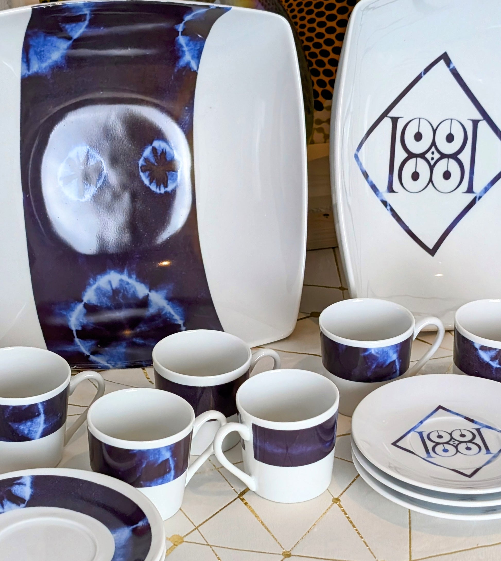Tasse à Café en porcelaine fine Française fabriquée à la demande avec soucoupe motif ethnique africain "indigo" bleu