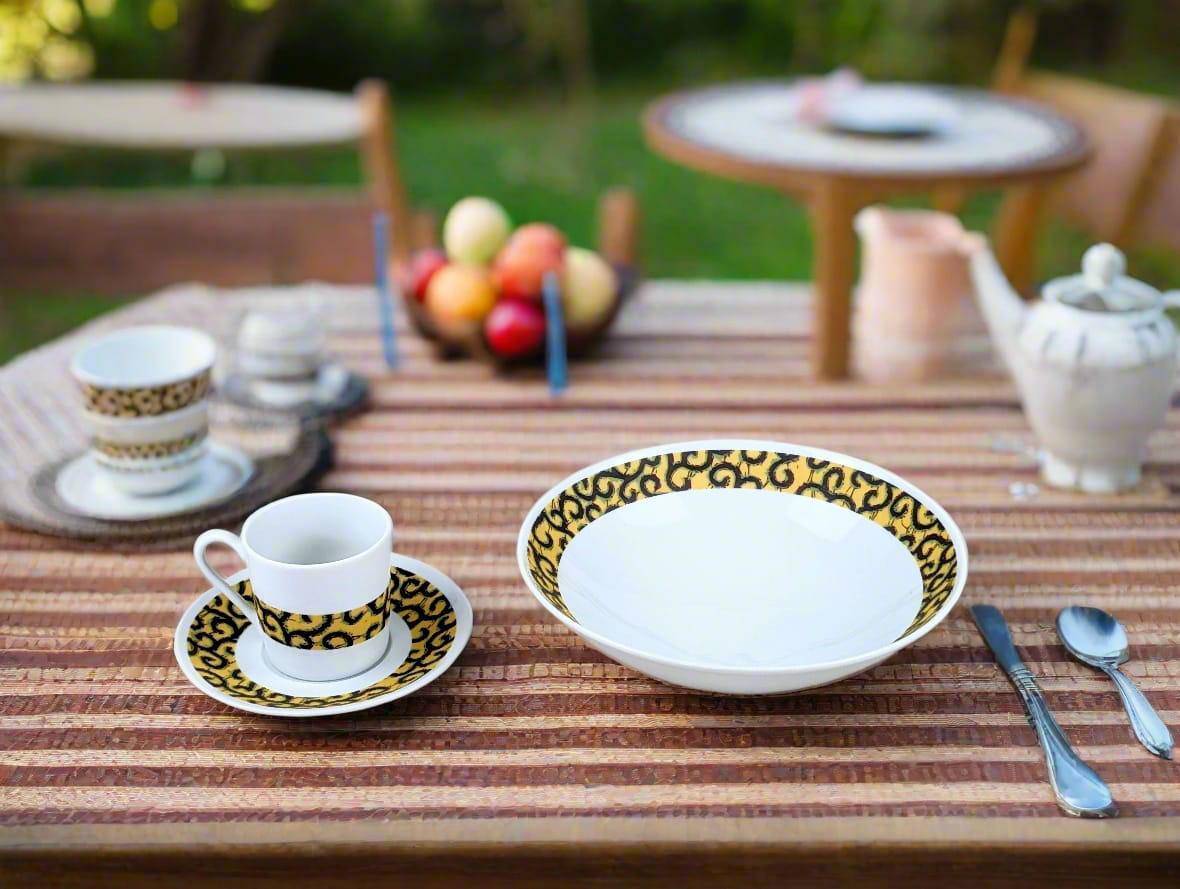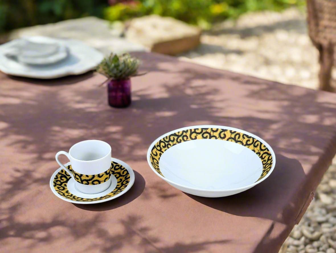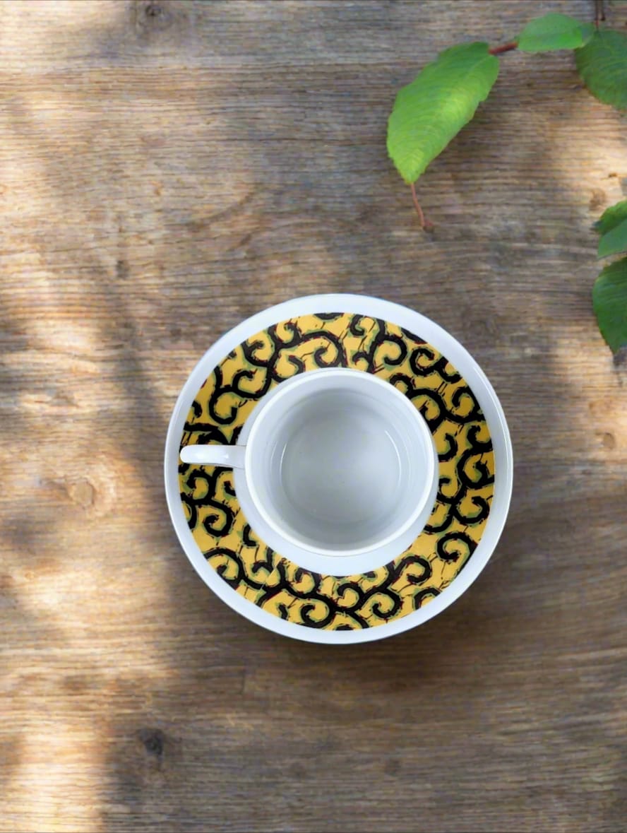 Tasse à Café en porcelaine fine Française fabriquée à la demande avec soucoupe motif africain WAX "macaroni ou Conseiller" jaune.