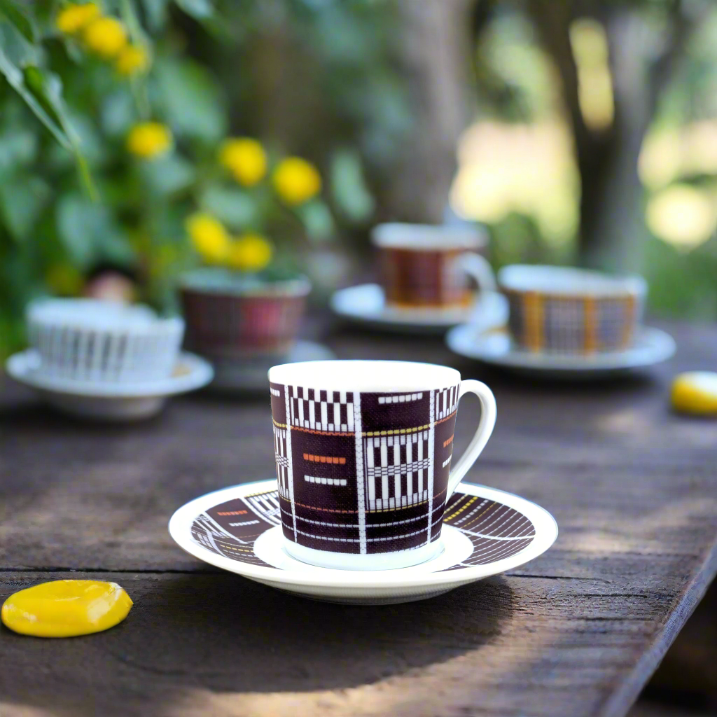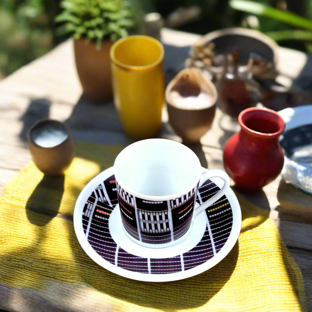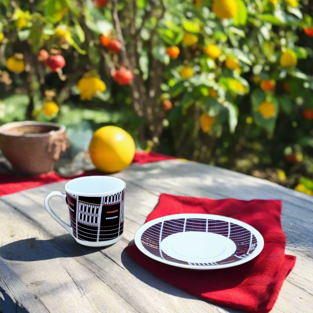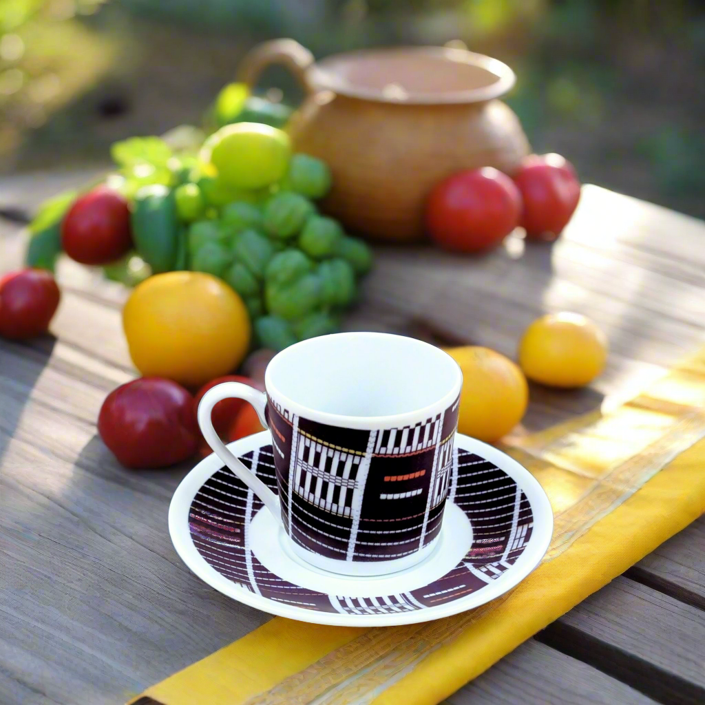 Cette tasse à café rend hommage à cet héritage en intégrant un motif en anneau africain Sénoufo, appliqué avec finesse sur la soucoupe. L’ensemble évoque la circularité du temps, la transmission des savoirs et la beauté des gestes quotidiens.